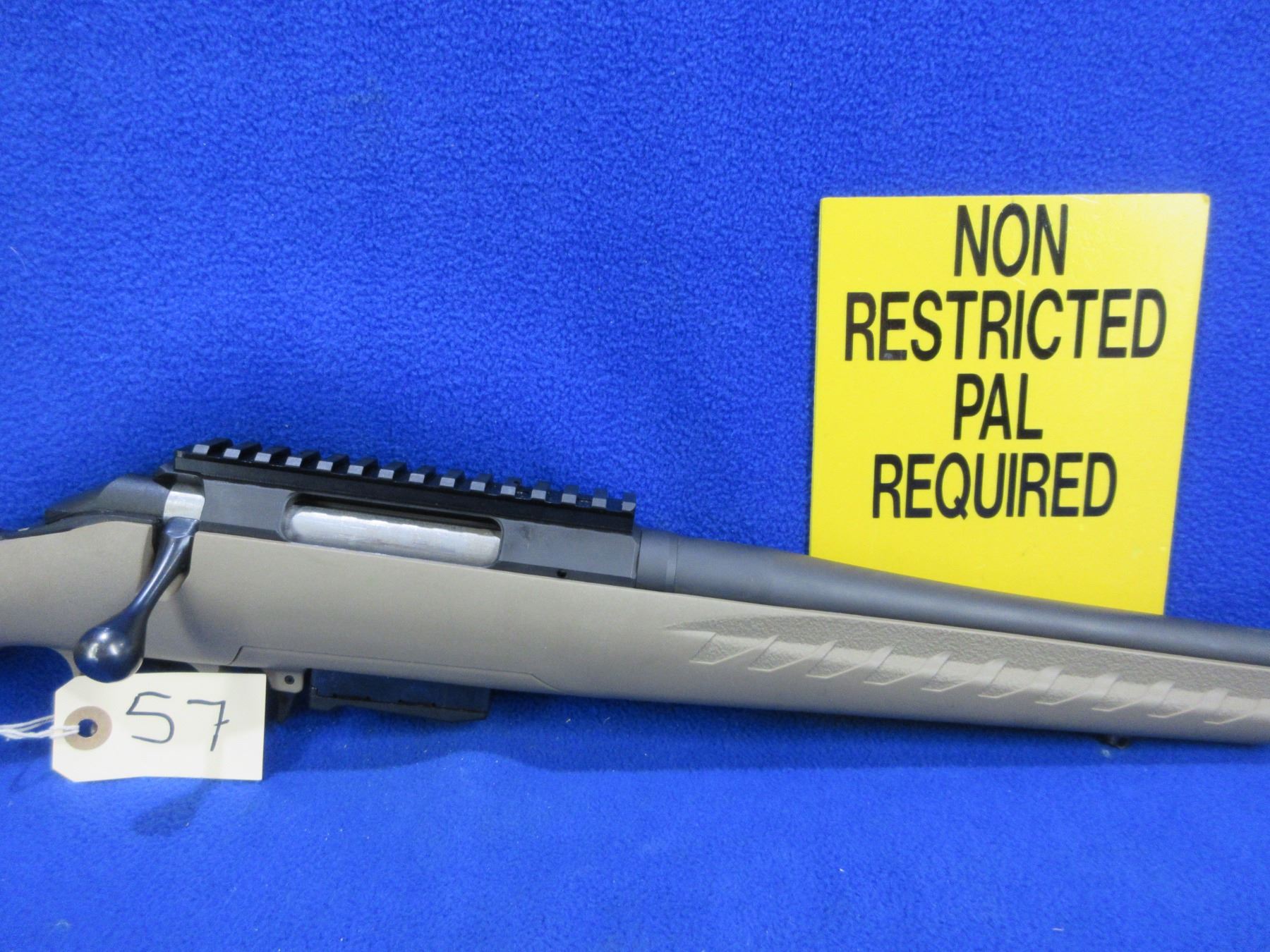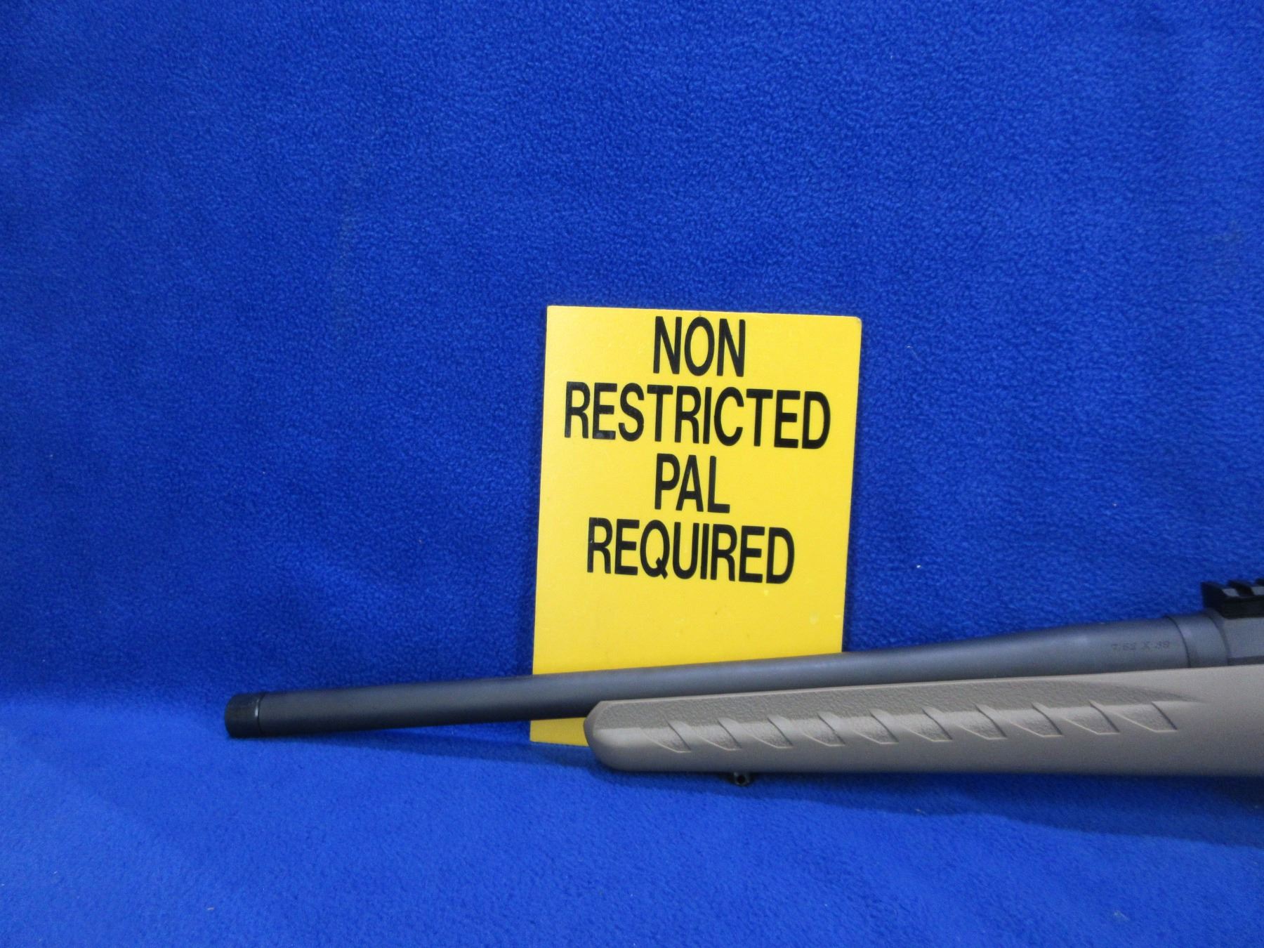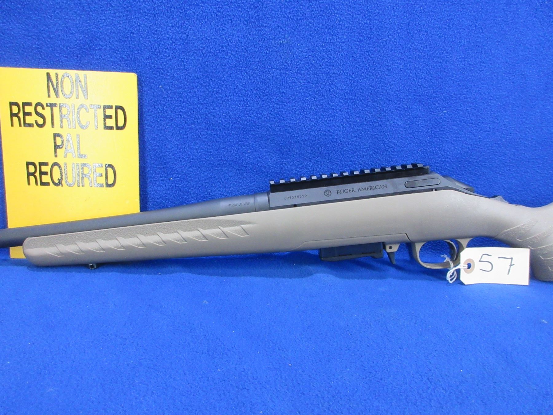 Non-Restricted - Ruger American Ranch in 7.62x39 - This is a bolt action rifle with removable magazine, action appears to be in good to very good working order, Ruger Marksman adjustable trigger. Compact threaded barrel is 16.12", rifling is fair to good, matte black finish is good to very good, has no sights but has picatinny rail, synthetic stock is good to very good, length of pull is 14", rubber recoil pad good, comes with swivel studs. Ser #691518519