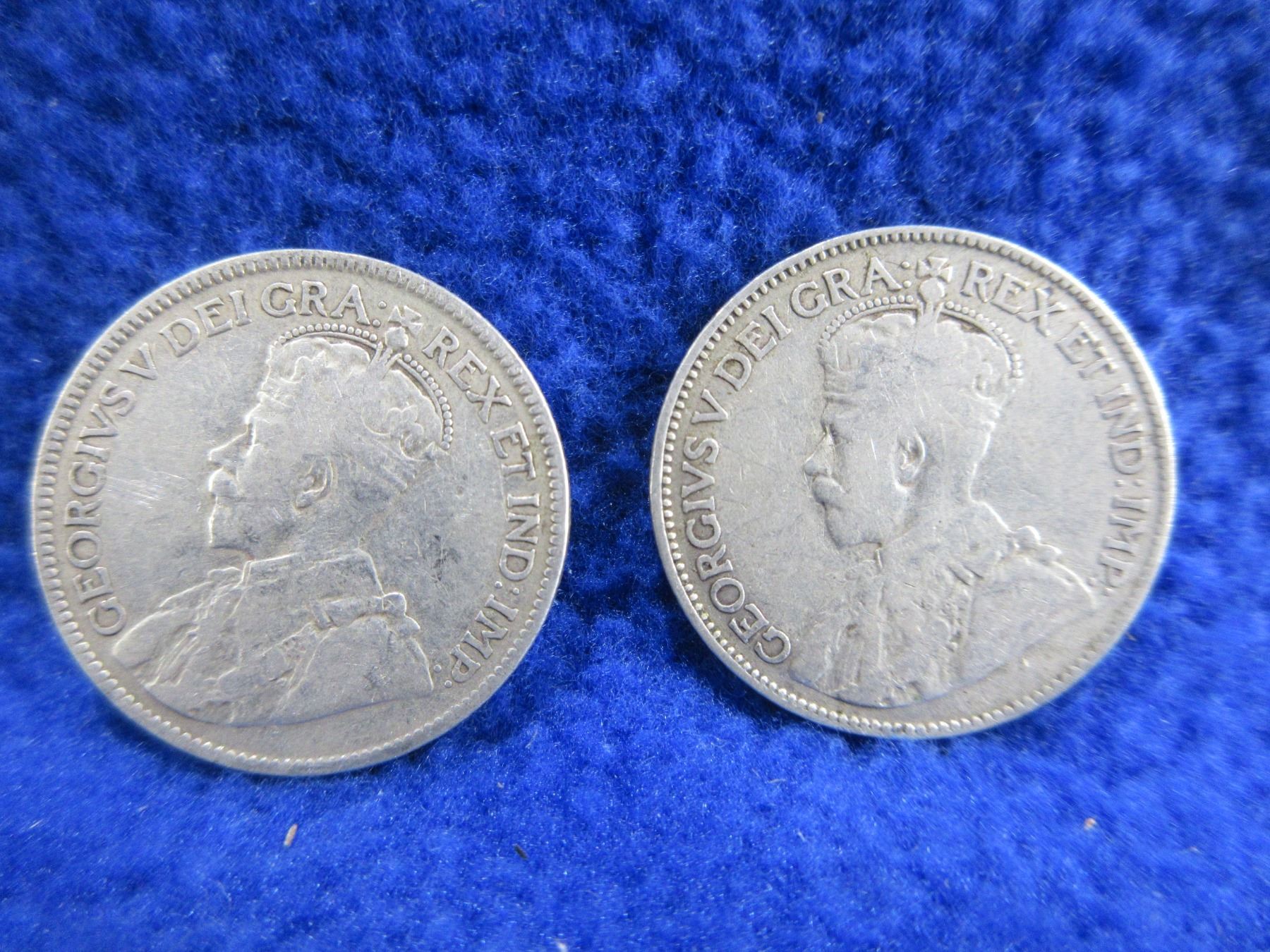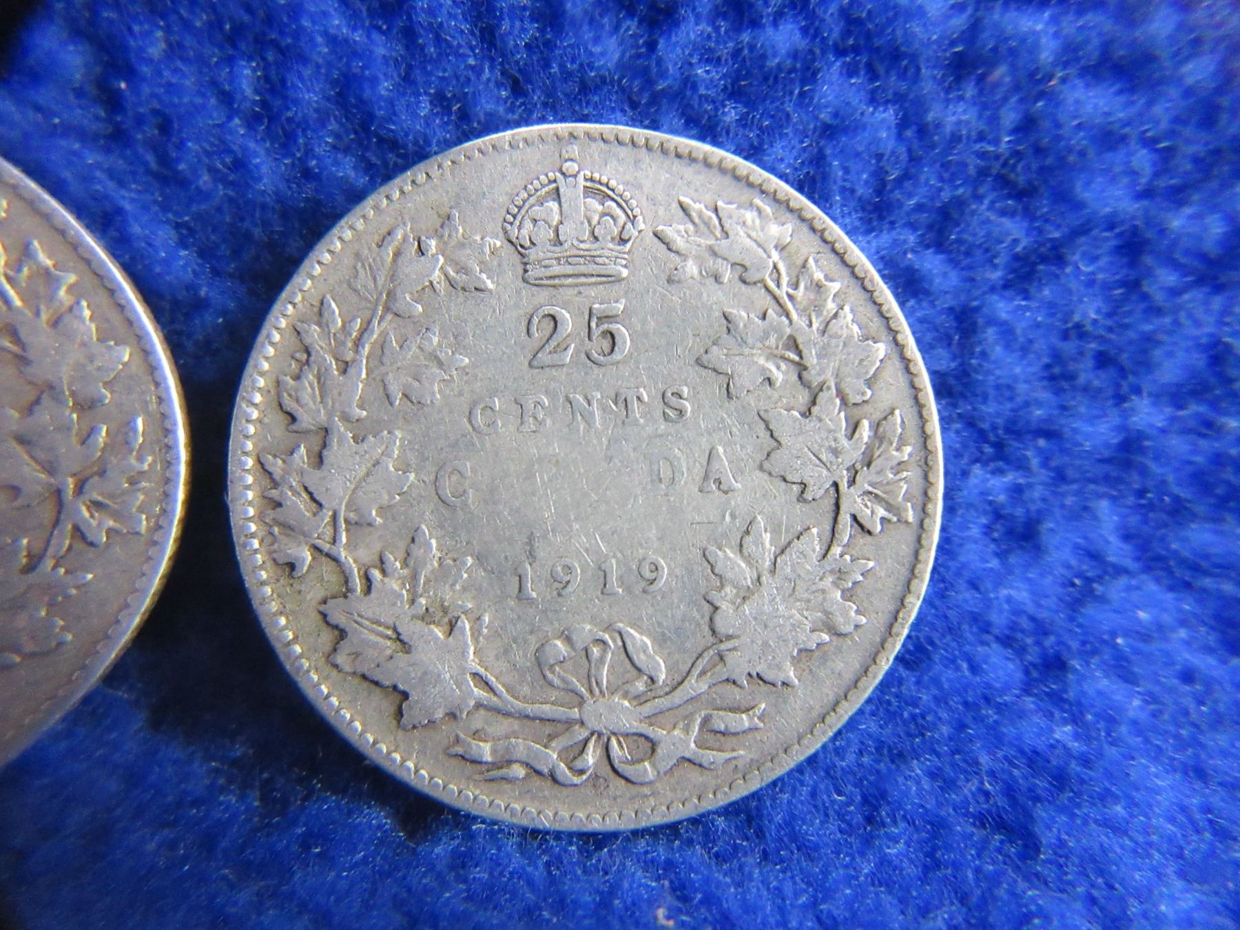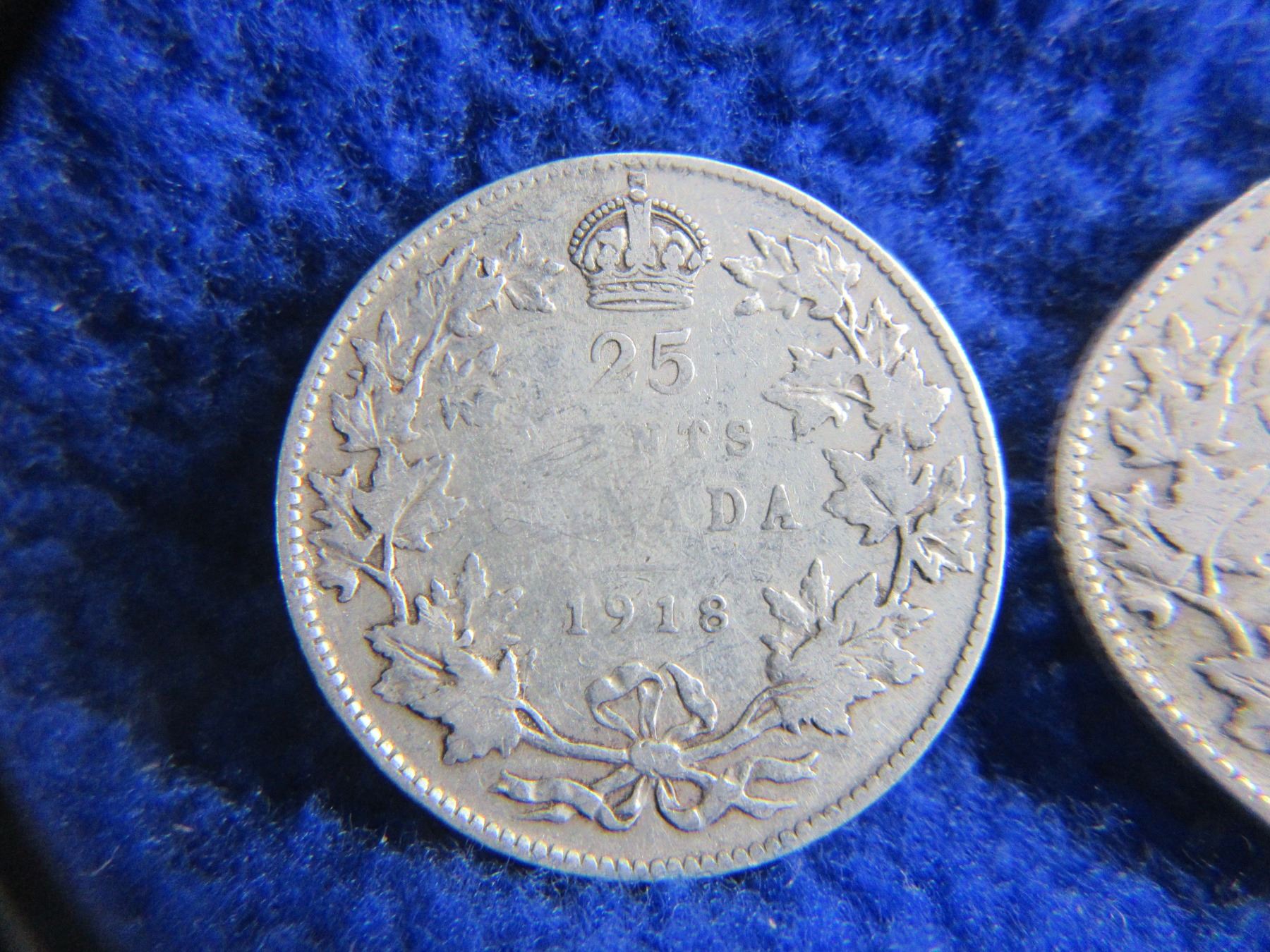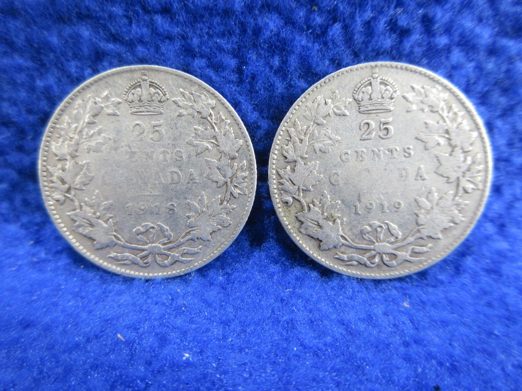 2 Canadian 25 Cent Coins - .925 Silver - 1918, 1919