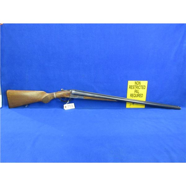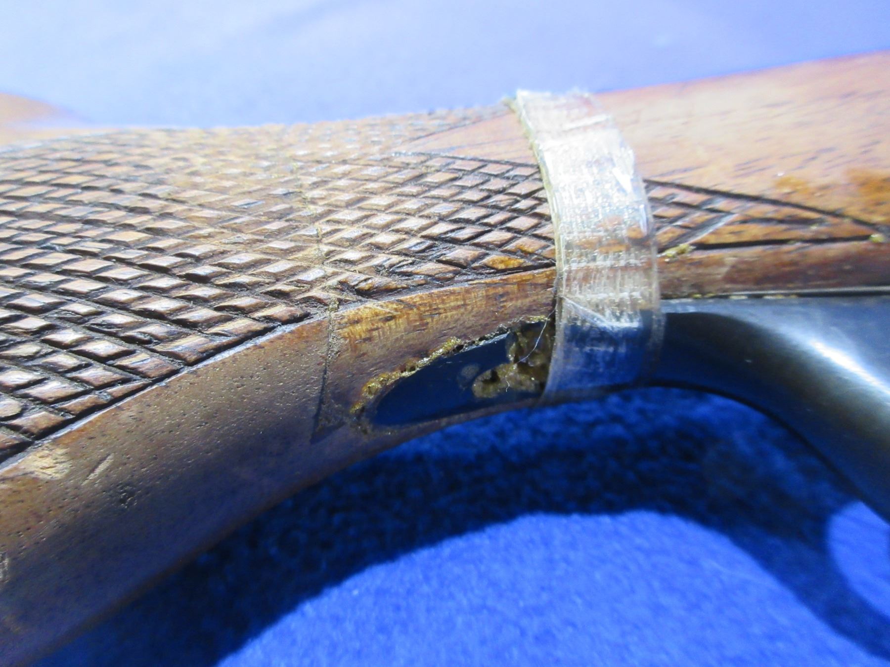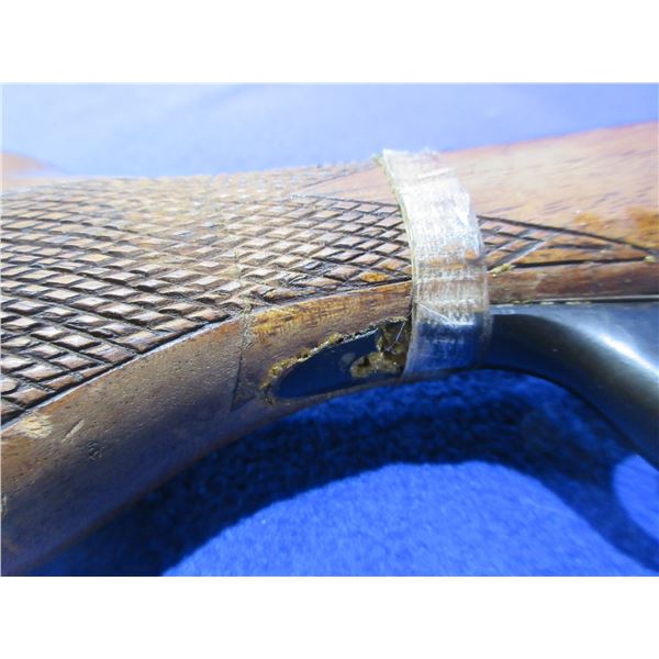 Non-Restricted - Berlin Suhl Werke in 16 Ga. 2 1/2" - This is a tip up SXS shotgun, action is tight and appears to be in working order but should not be fired as has a major crack repair in the wrist area. Barrels are 28 1/2", bores are fair to good, bluing is good with wear spots and light scratches, has bead front sight, stock has a major crack repair in the wrist area, forearm is good with usage marks, length of pull is 14", butt plate good, comes with swivels. Ser # 44533