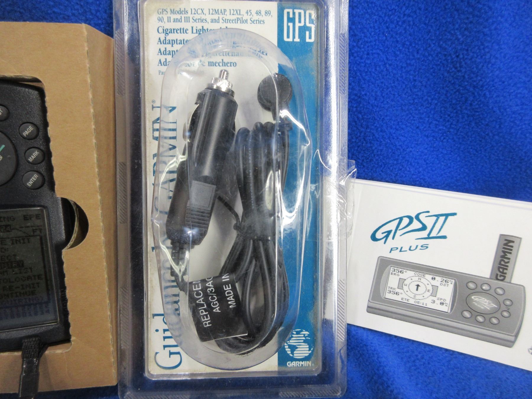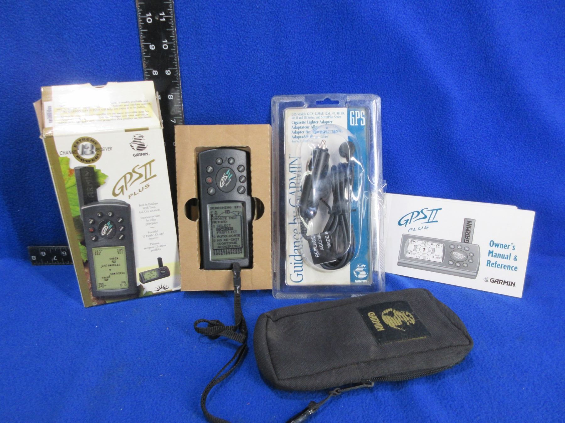 Garmin GPSII Plus Personal Handheld Navigator - New Old Stock - Comes with manual, cigarette lighter adaptor and carry case - Tested working at time of cataloging (turns on)