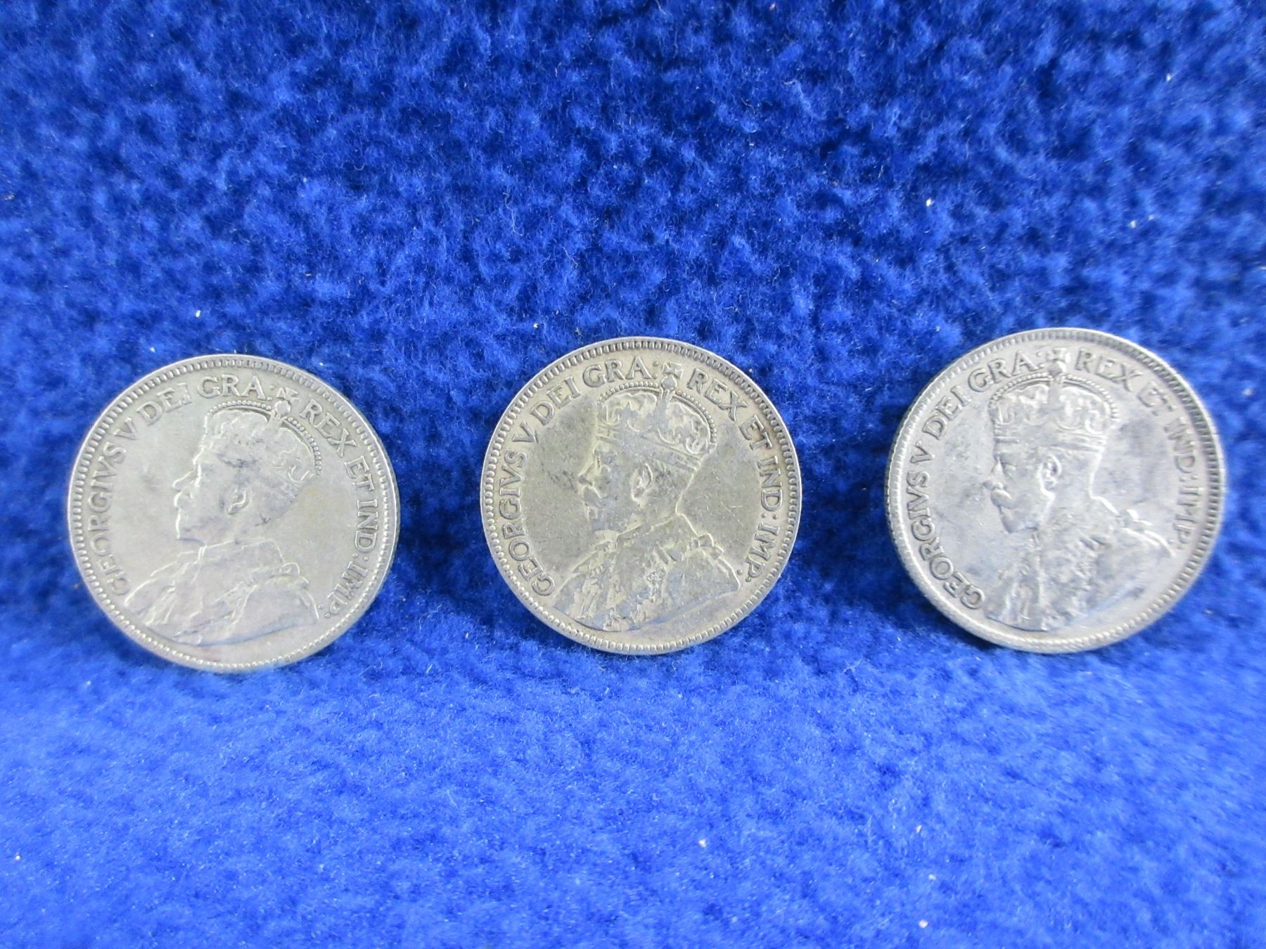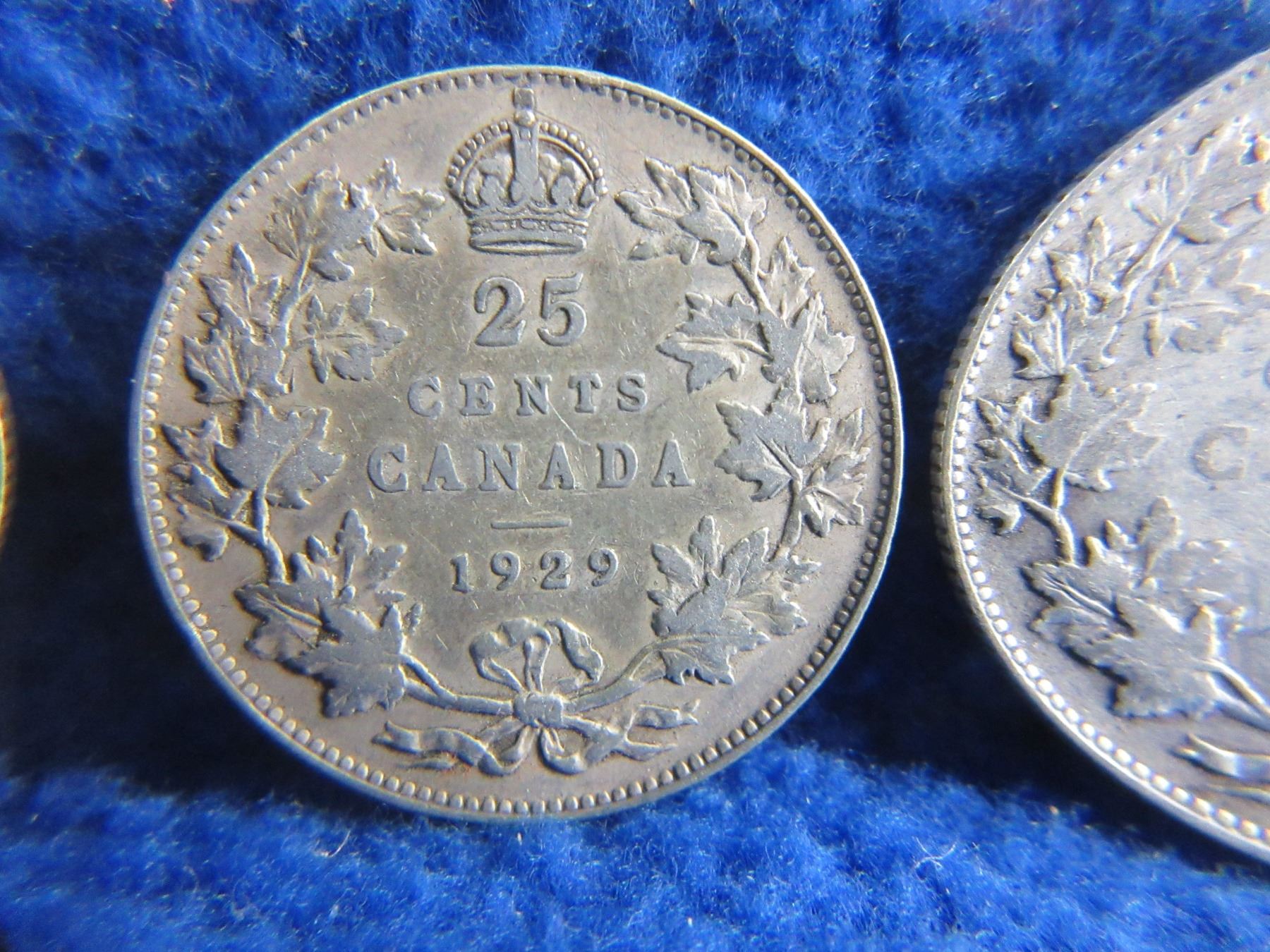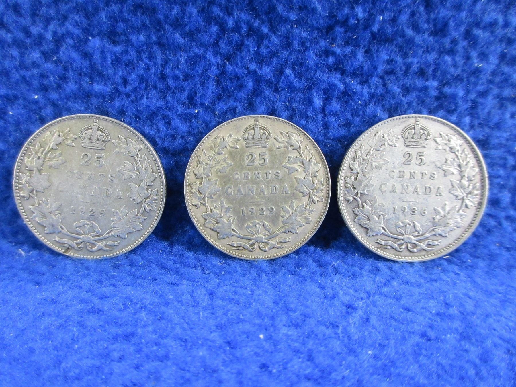 3 Canadian 25 Cent Coins - .800 Silver - 1929 x 2, 1936