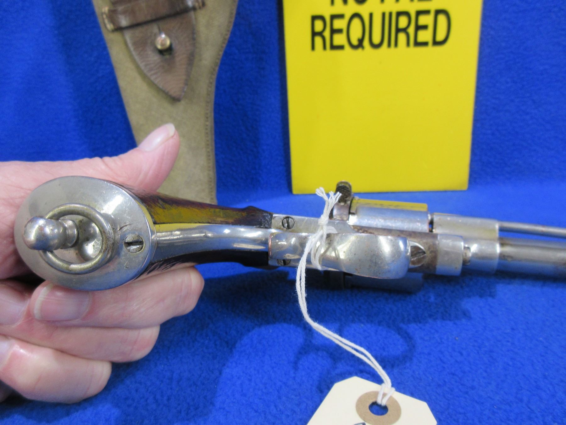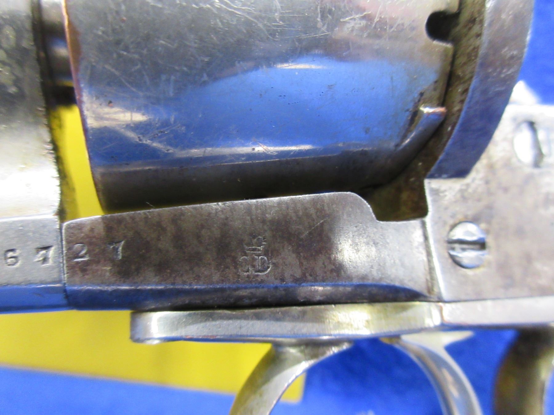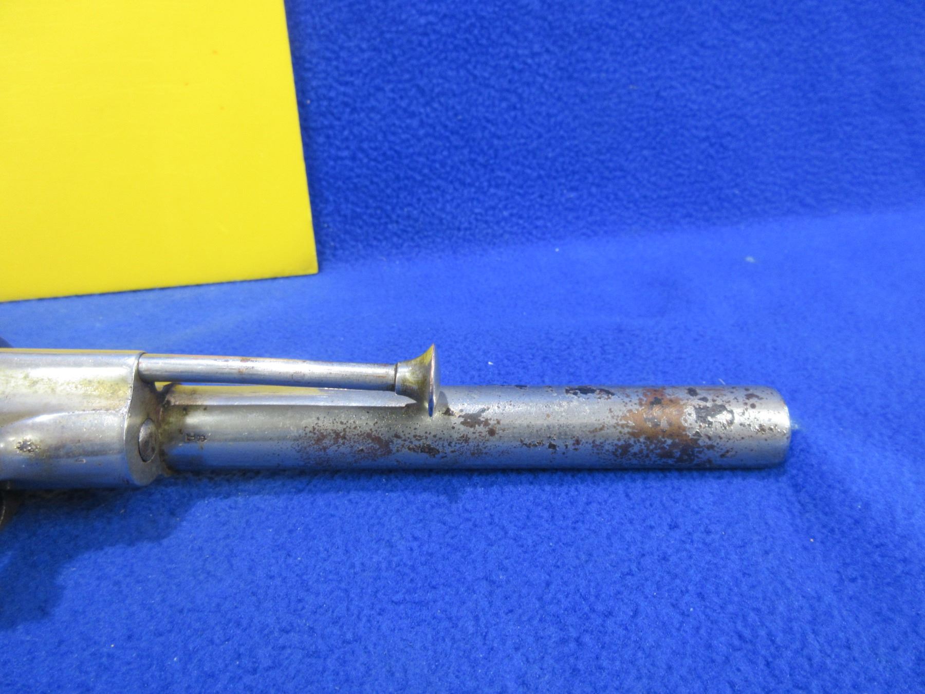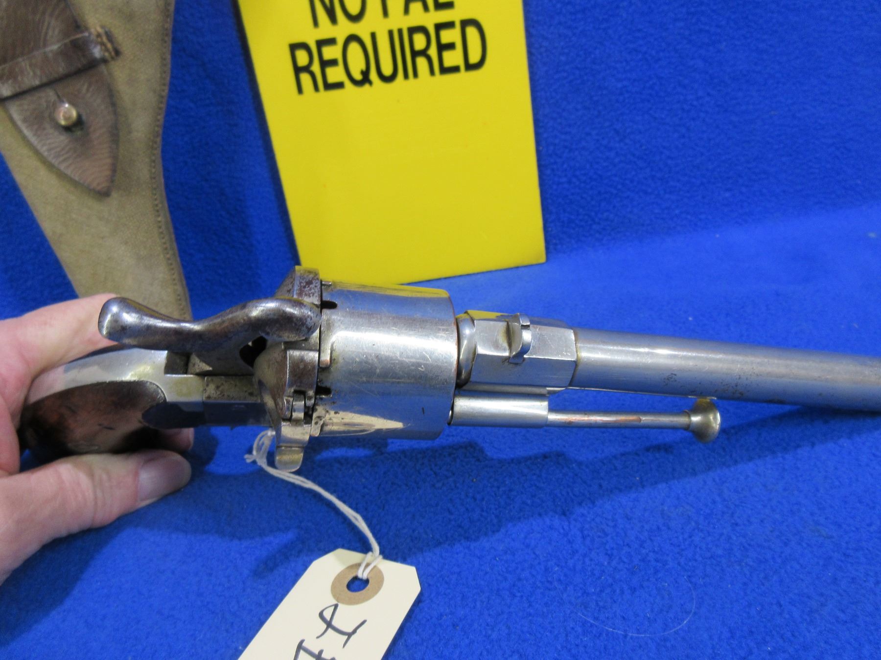 Antique - No PAL Required - E. Lefaucheux Brevete Pinfire in 11MM - Crown over GD marked (Gilles Decortis). Rare and desireable army or possibly civil war revolver. This is a six shot single action revolver, action appears to be in good to very good working order. Barrel is 6". rifling is fair to good, nickel plating is 65% there, has both sights, wood grips are good with many usage marks. Has lanyard ring and vintage canvas holster, holster fits gun very well but may not be original. Ser # 16727