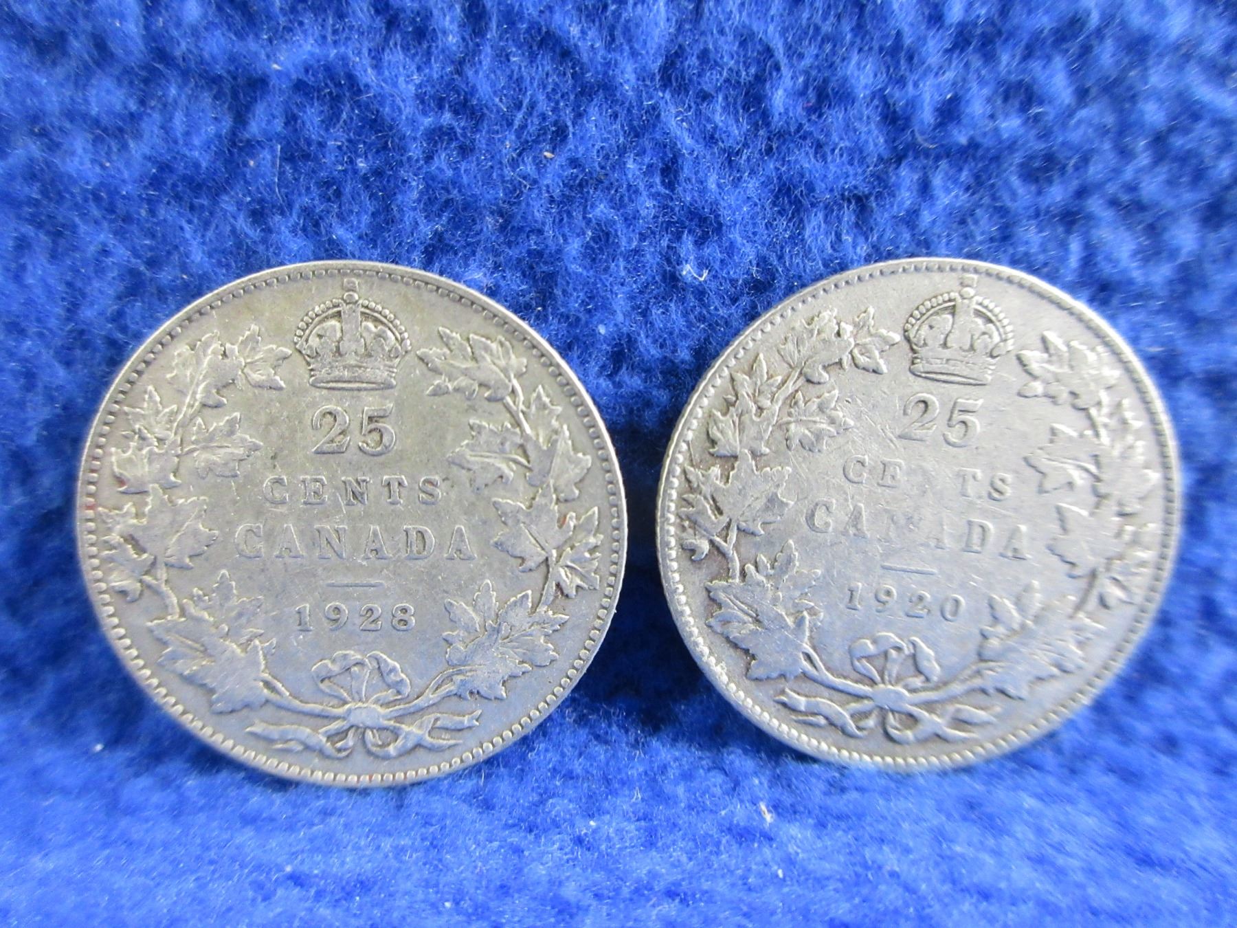 2 Canadian 25 Cent Coins - .800 Silver - 1920, 1928