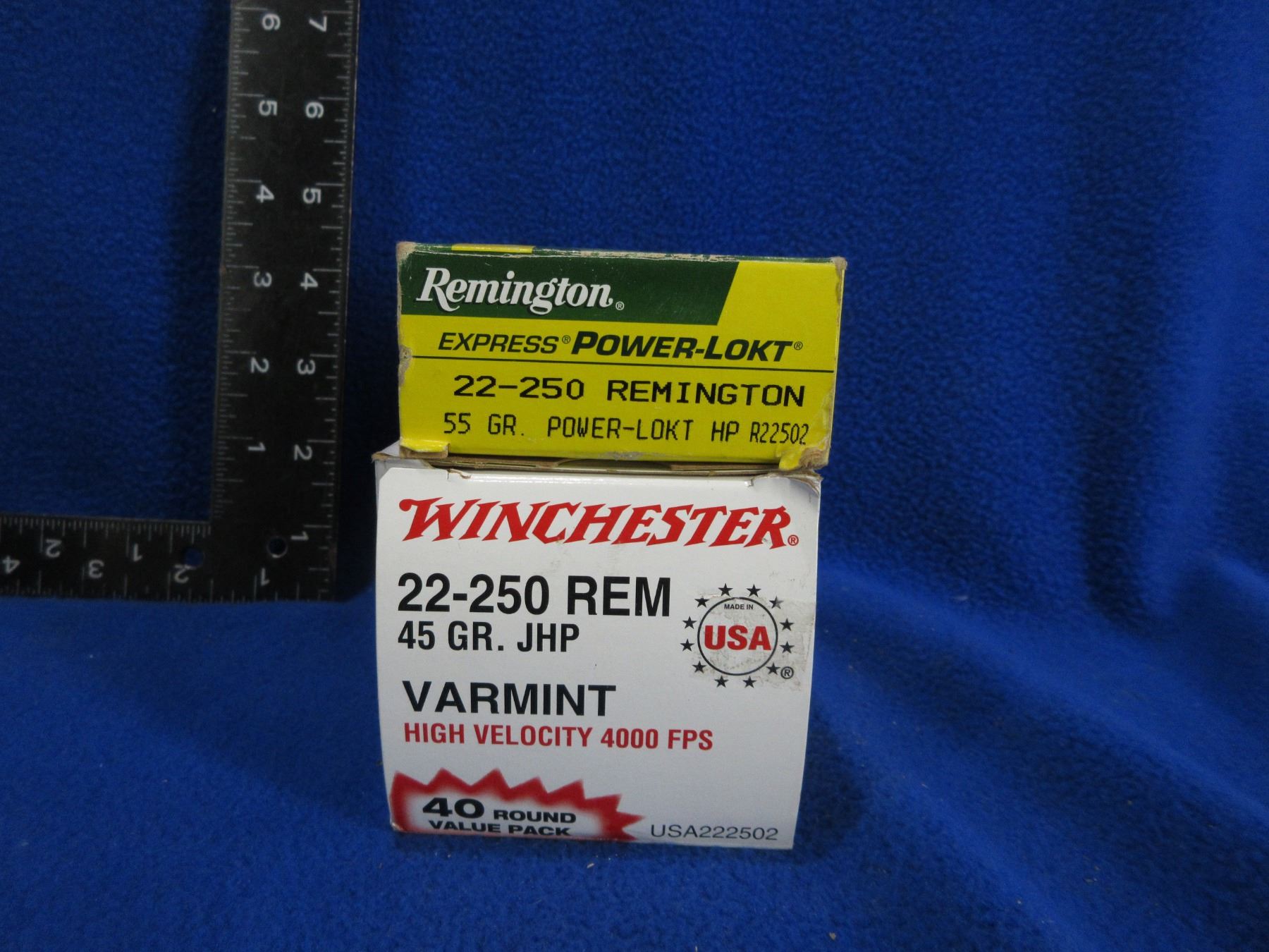 22-250 Rem. Winchester & Remington (Pick Up or Ship by UPS Only) Cartridges - Box of 20 (Rem. 55gr Power-Lokt HP), Box of 40 (Win. 45gr JHP HV)