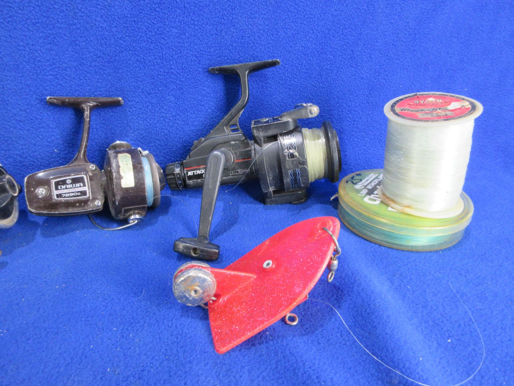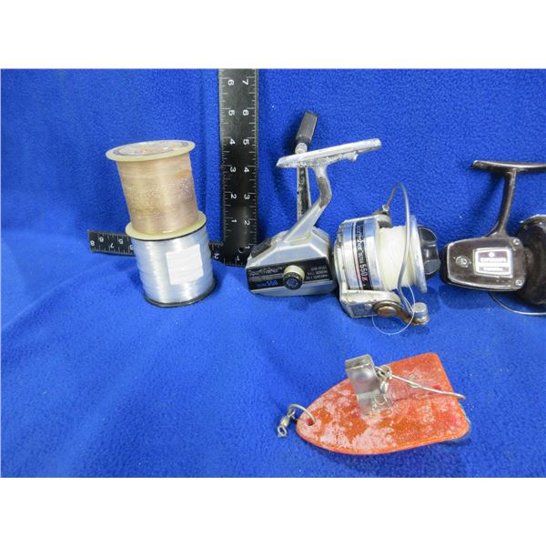 Lot of Misc. Fishing Reels and Line - Attack 6000 Fishing Reel with Berkley & Chinook Line, Sportfisher Ultra 550z Fishing Reel, Berkley Trilene, Daiwa 7290c Fishing Reel (Missing Handle), Charter Boat Line & 2 Deep Six Divers