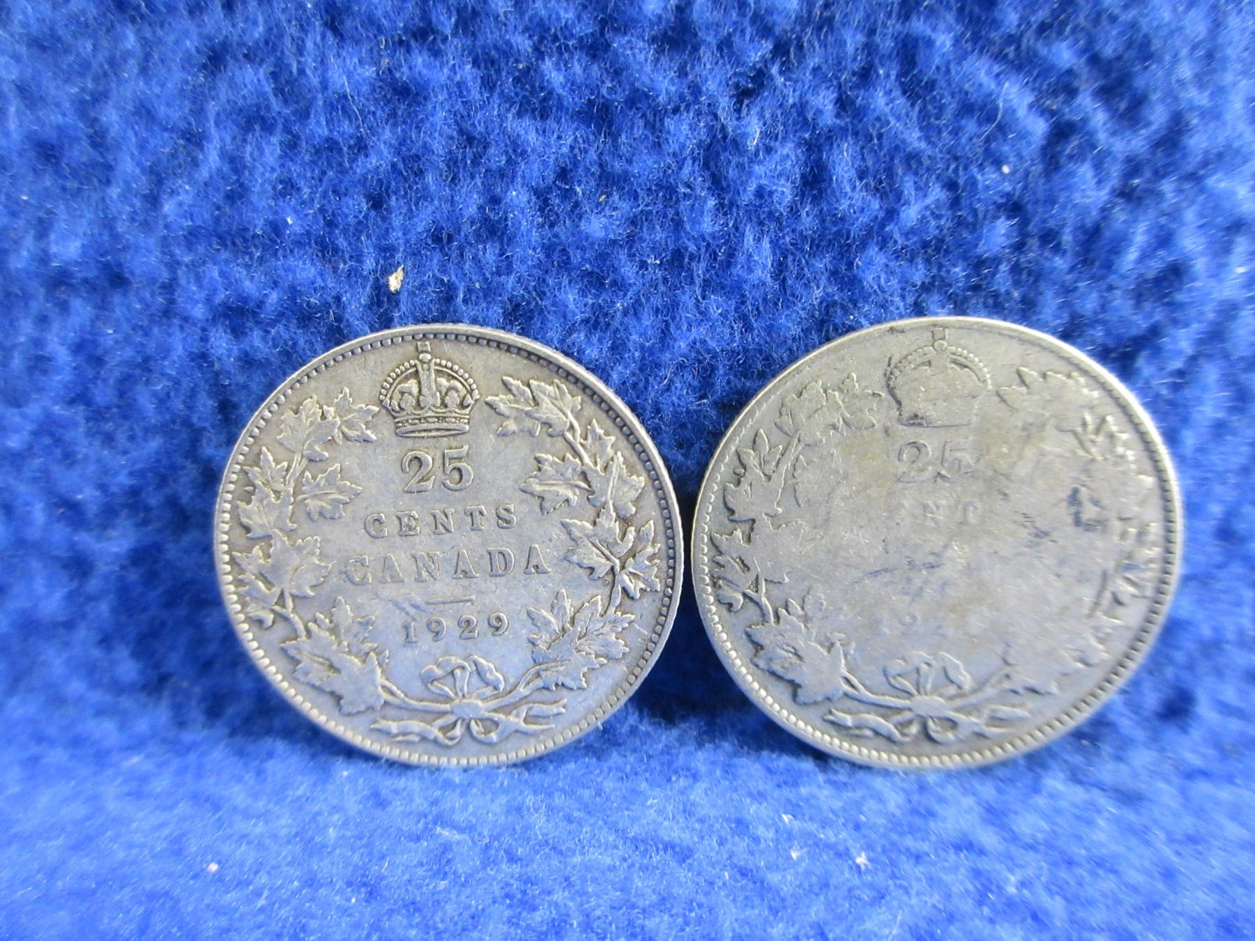 2 Canadian 25 Cent Coins - .800 Silver - 1929 & 192? (Illegible)