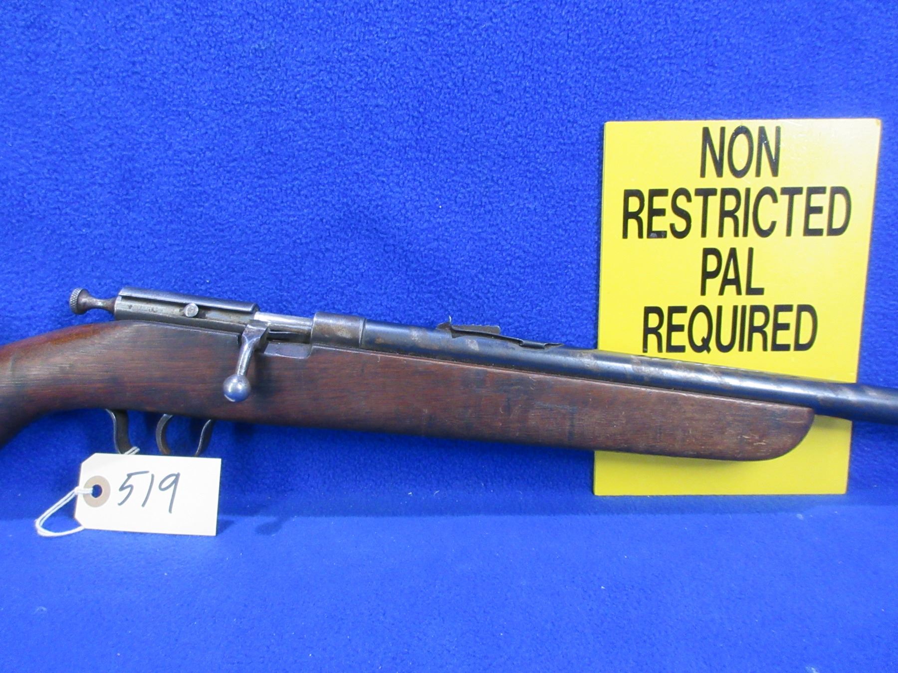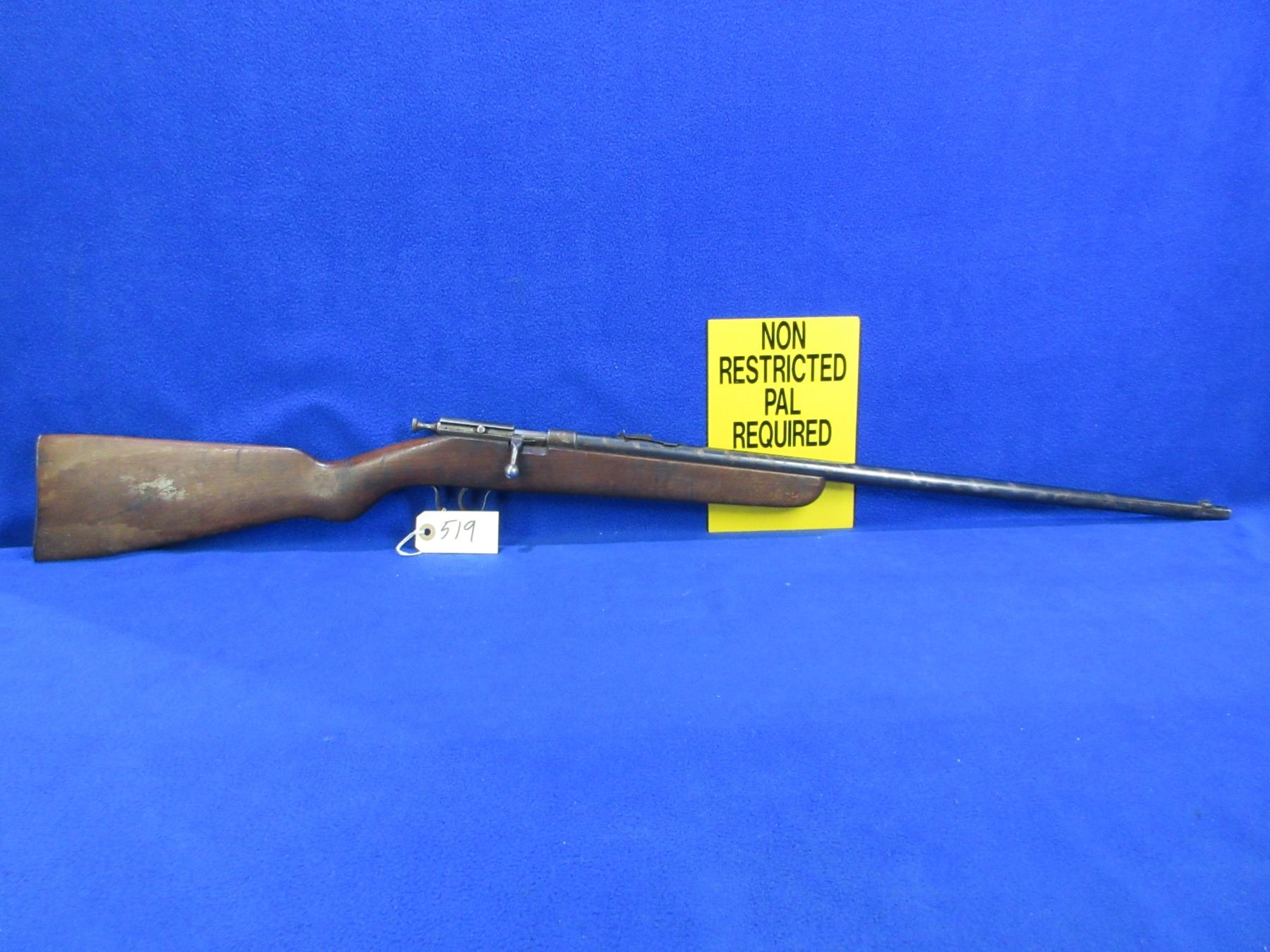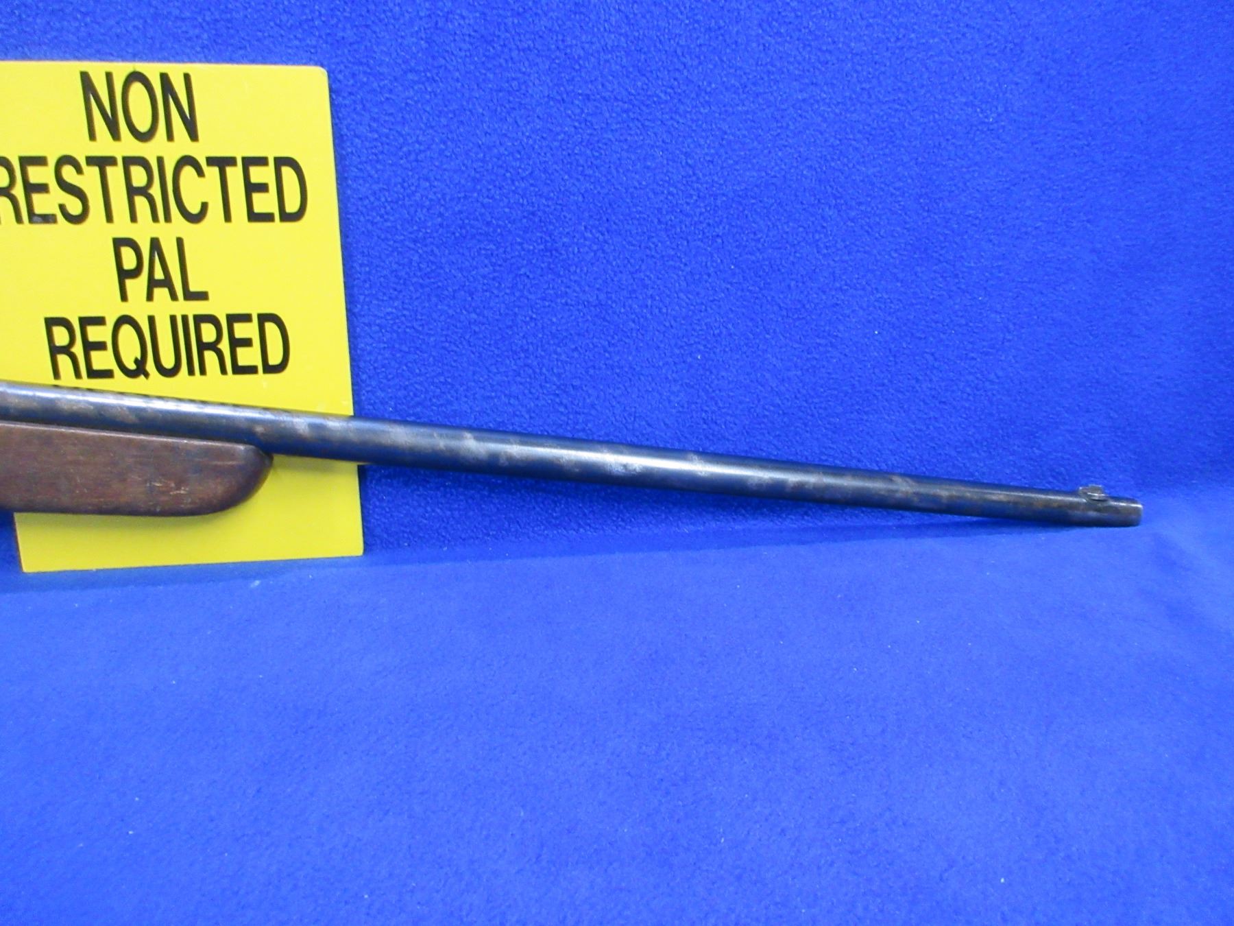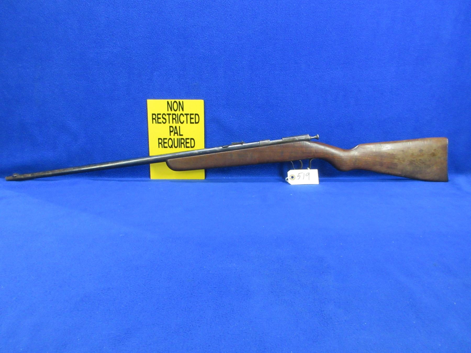 Non-Restricted - Cooey Ace Special Single Shot in 22 Cal. - This is a single shot bolt action rifle, action appears to be in good to very good working order. Barrel is 24", rifling is good to very good, bluing is fair to good with wear spots, has both sights, stock is good with many usage marks and finish flaking, length of pull is 13 1/2", metal butt plate good. Ser # None