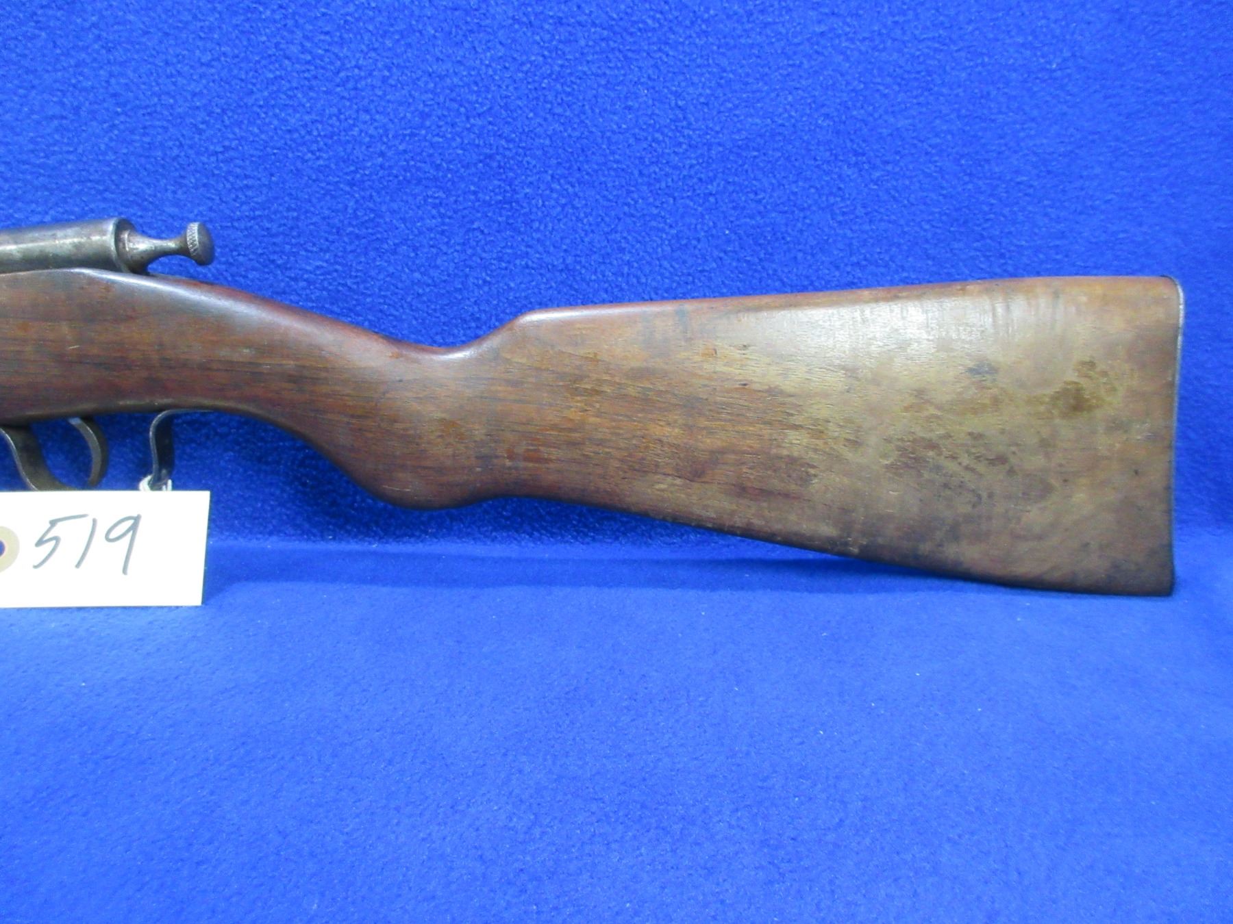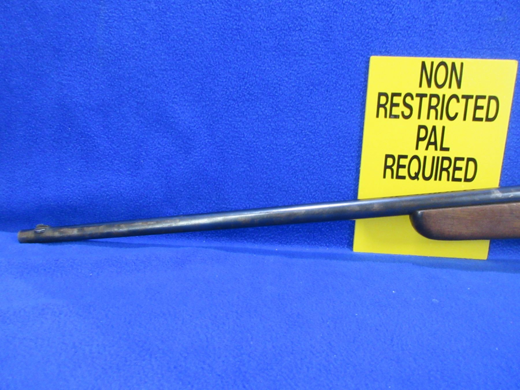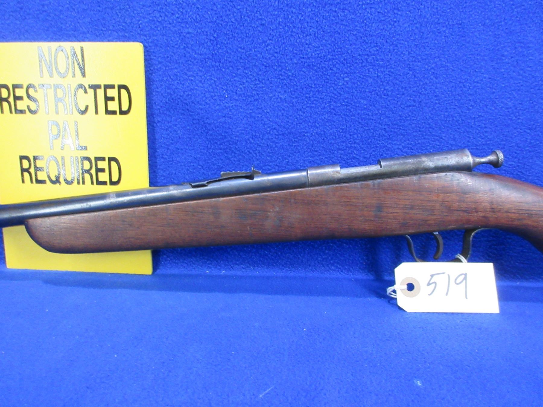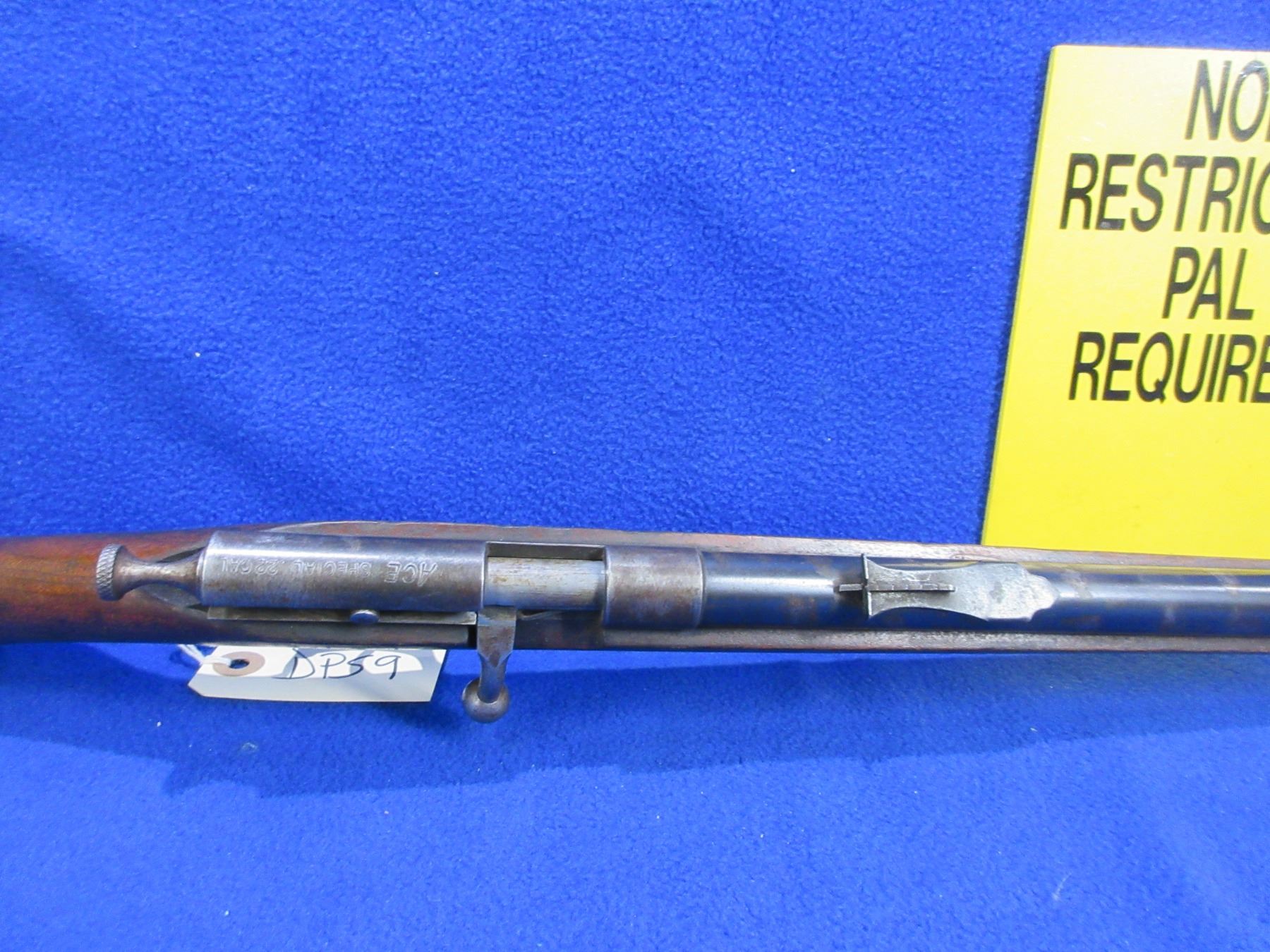 Non-Restricted - Cooey Ace Special Single Shot in 22 Cal. - This is a single shot bolt action rifle, action appears to be in good to very good working order. Barrel is 24", rifling is good to very good, bluing is fair to good with wear spots, has both sights, stock is good with many usage marks and finish flaking, length of pull is 13 1/2", metal butt plate good. Ser # None