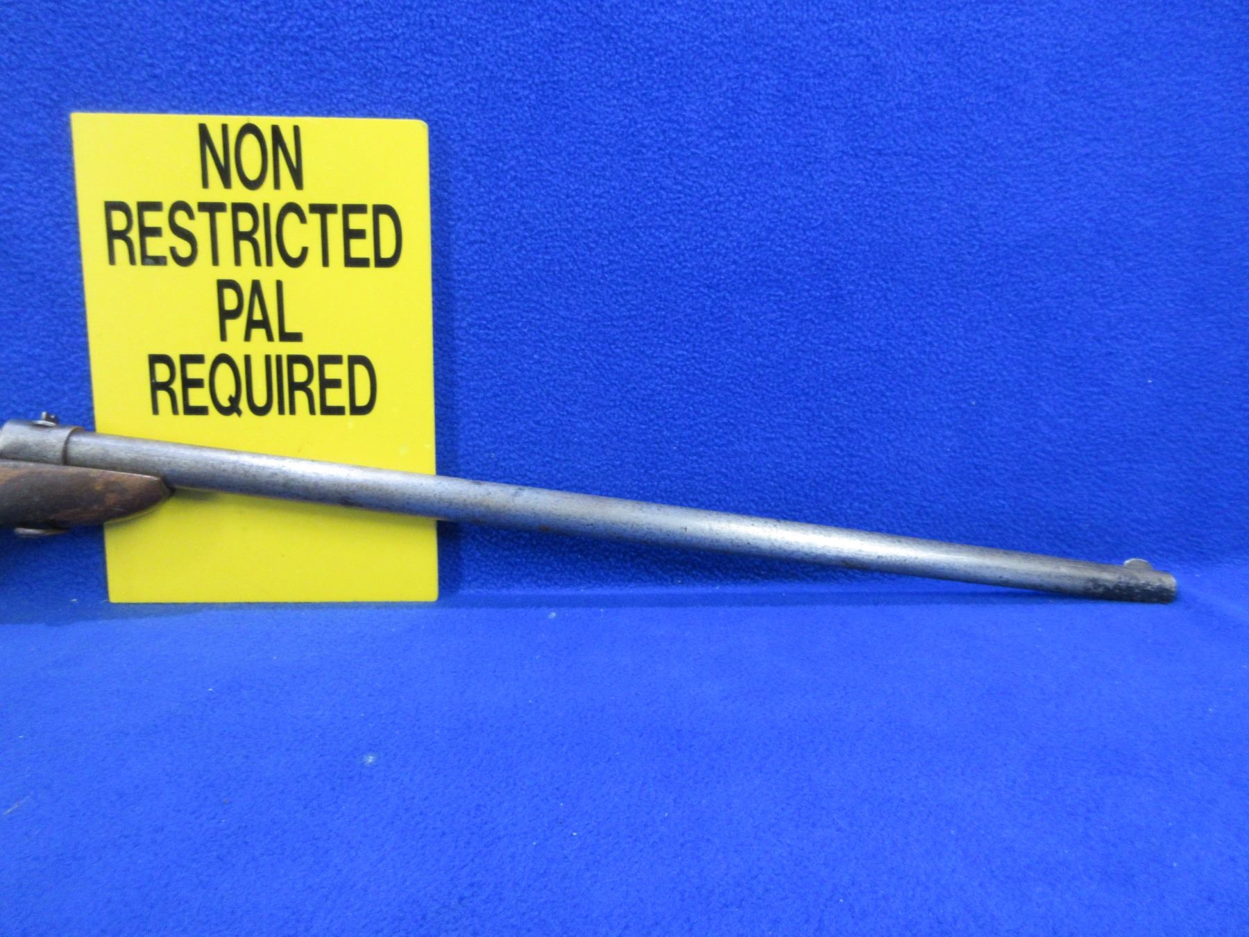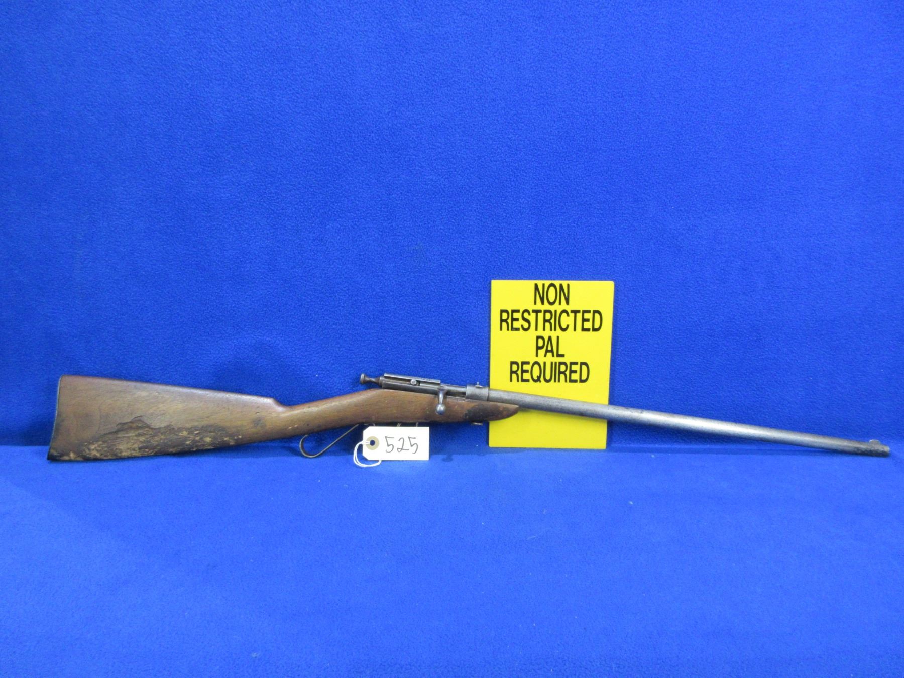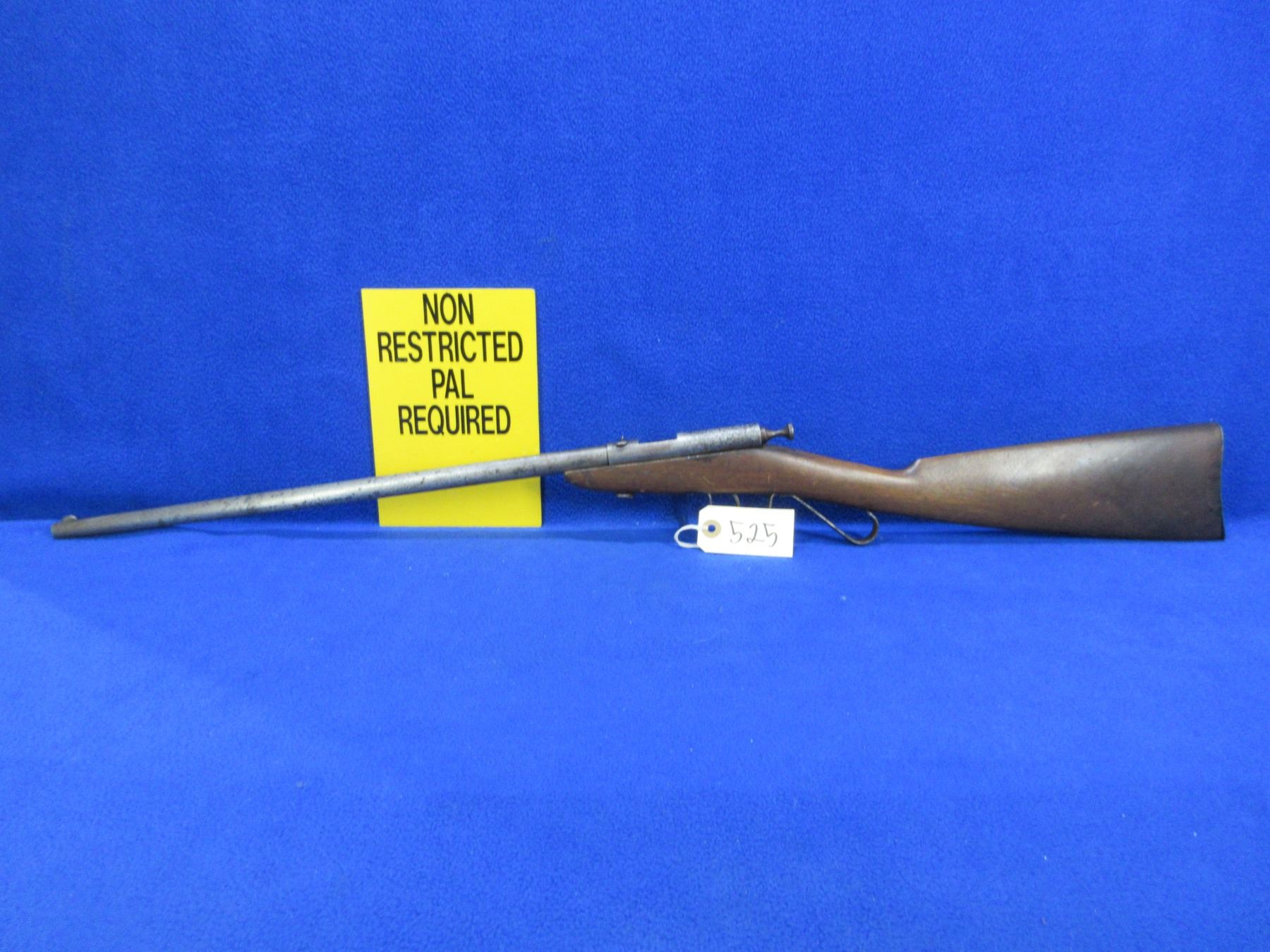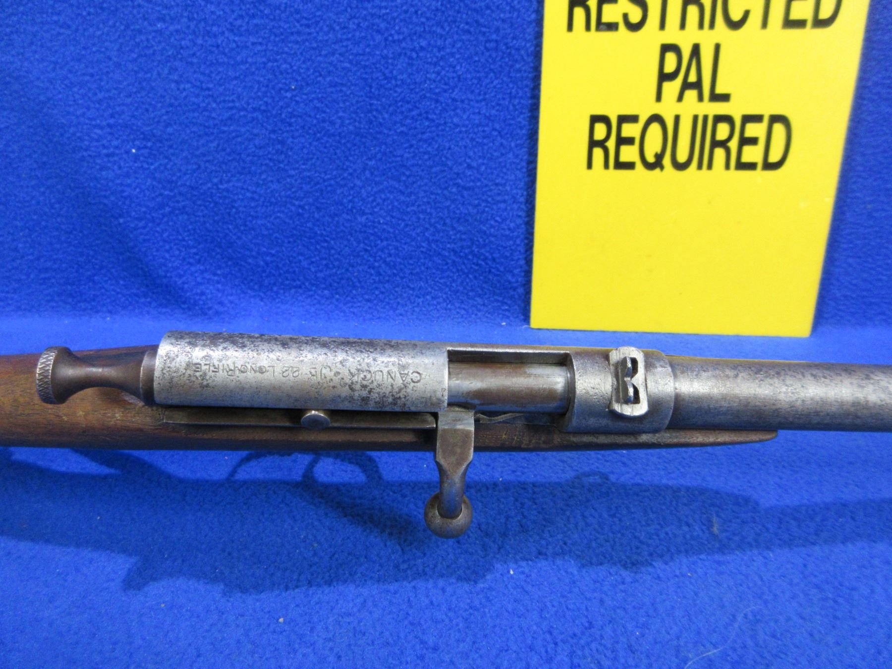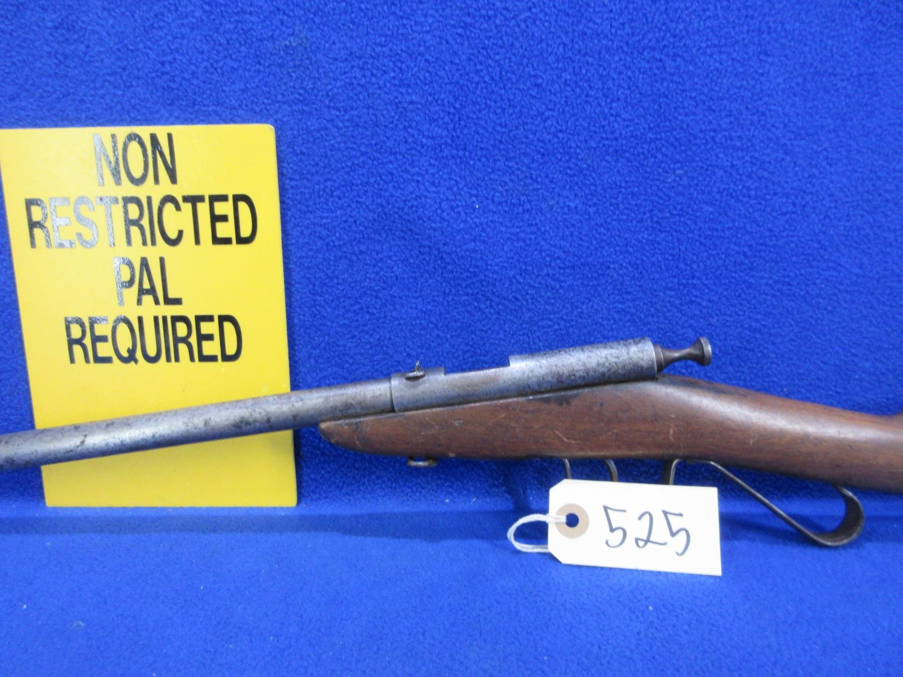 Non-Restricted - Cooey Model Canuck Jr. in 22 LR - This is a single shot bolt action rifle, action appears to be in good to very good working order. Barrel is 18", rifling is good, bluing is gone and has some deep pitting near the muzzle, has both sights, stock is fair but has large damage on bottom right hand side, length of pull is 14", metal butt plate good. Ser # None