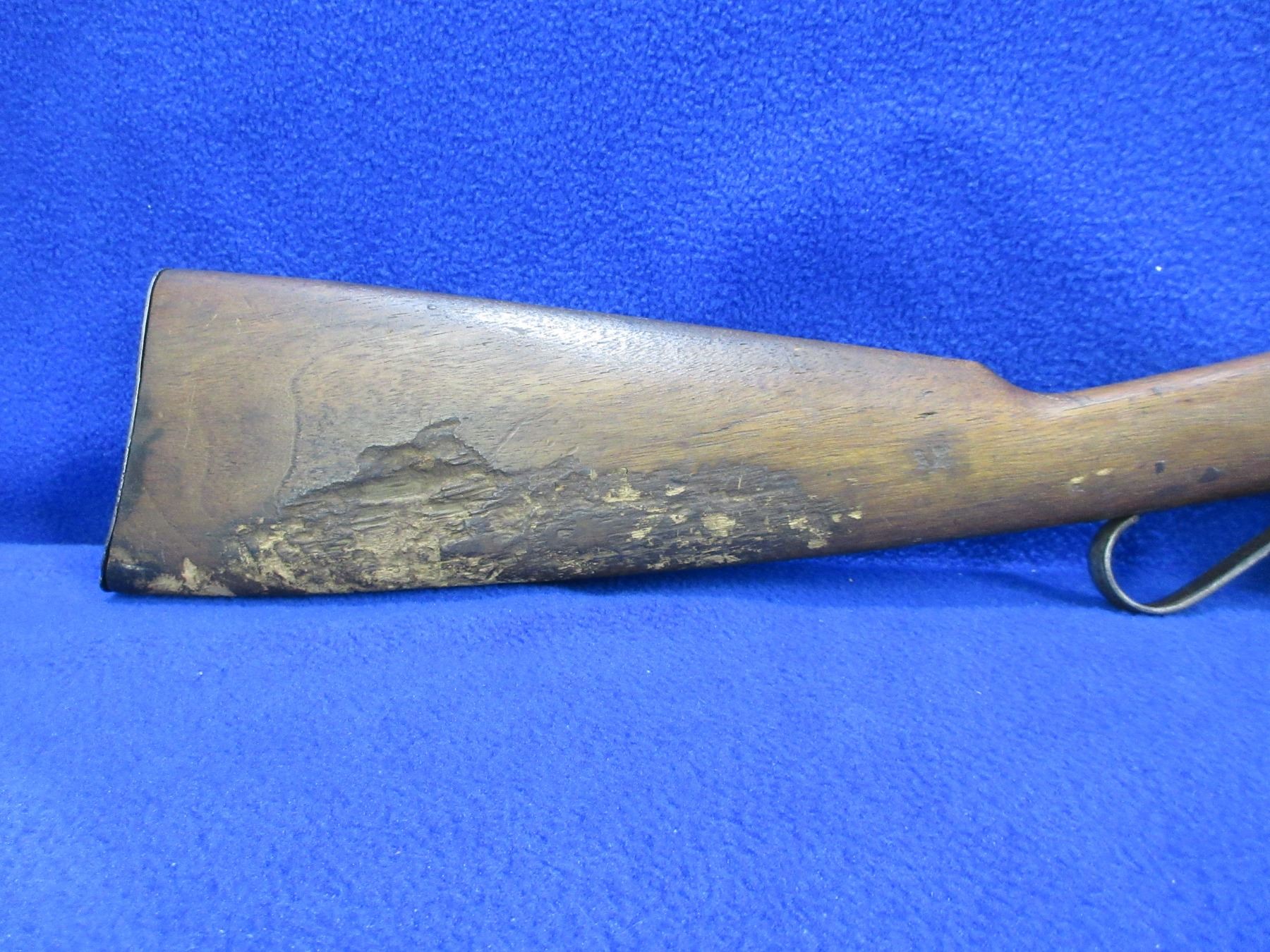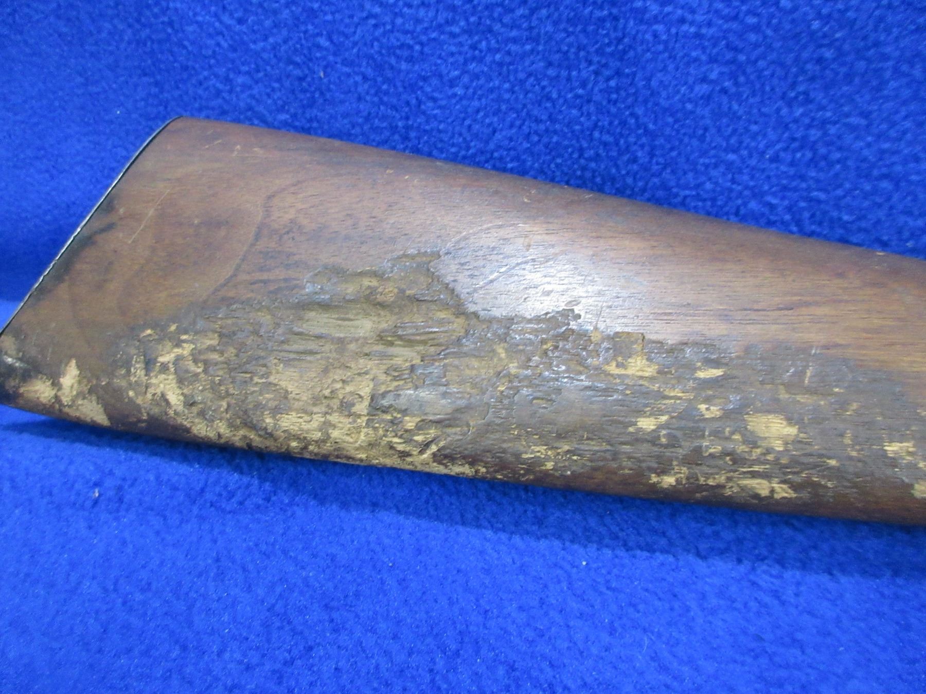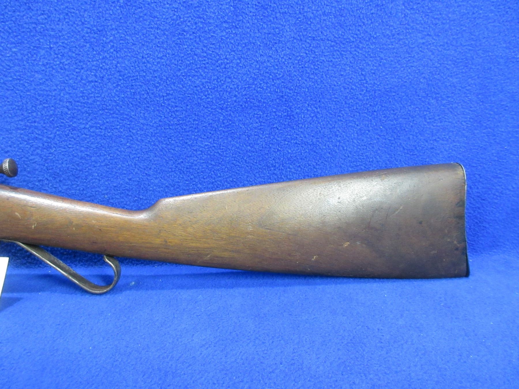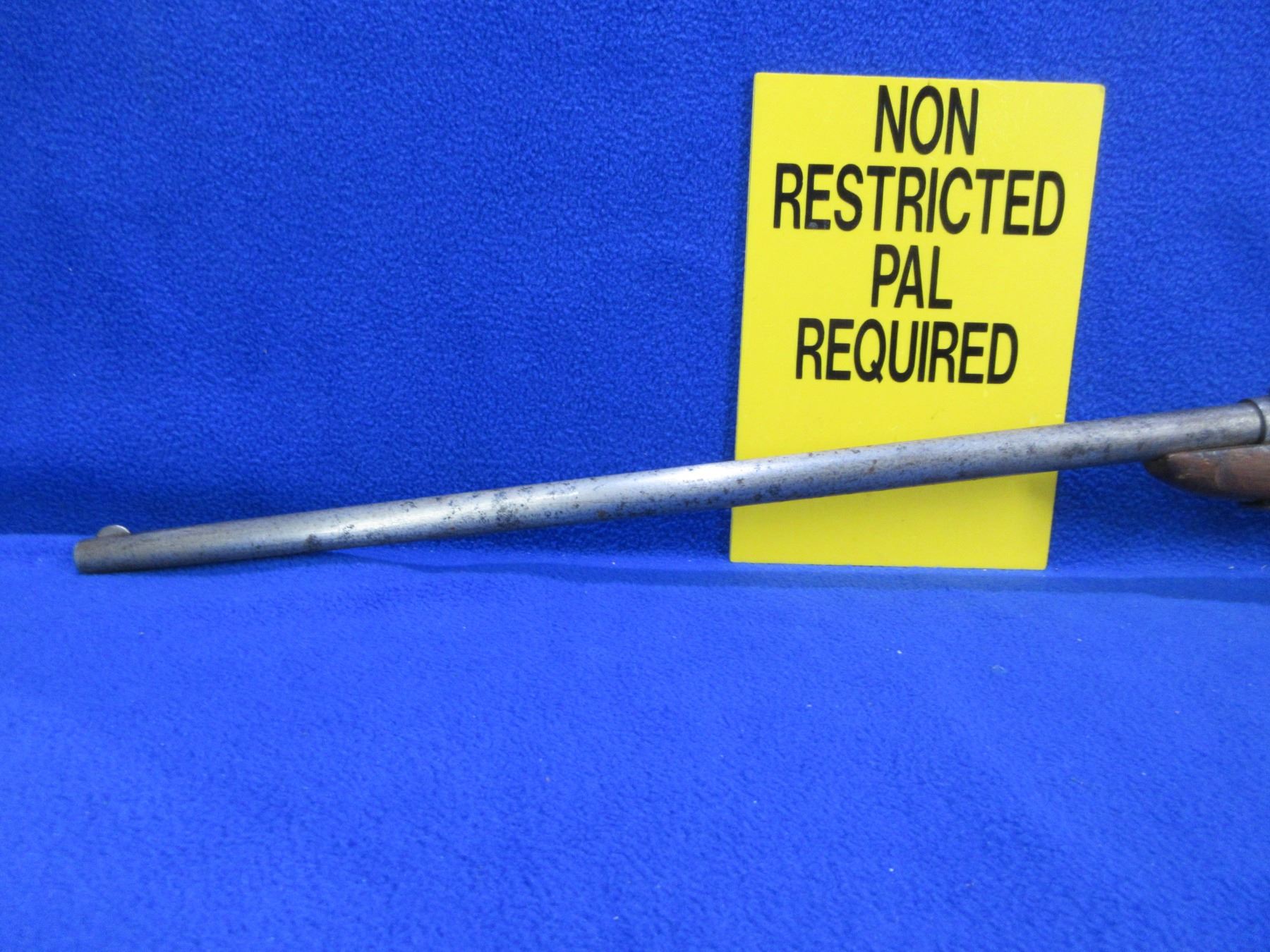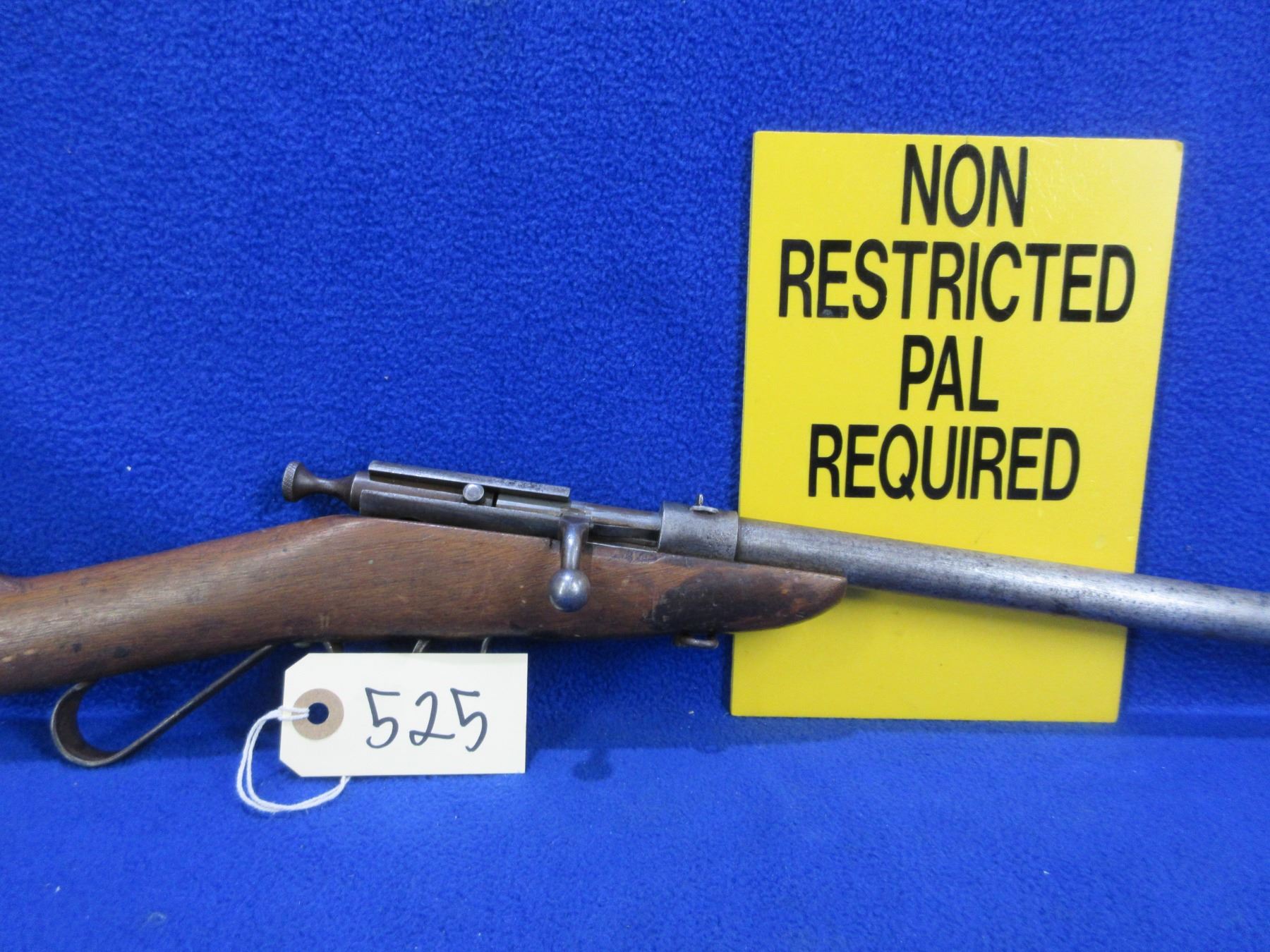 Non-Restricted - Cooey Model Canuck Jr. in 22 LR - This is a single shot bolt action rifle, action appears to be in good to very good working order. Barrel is 18", rifling is good, bluing is gone and has some deep pitting near the muzzle, has both sights, stock is fair but has large damage on bottom right hand side, length of pull is 14", metal butt plate good. Ser # None