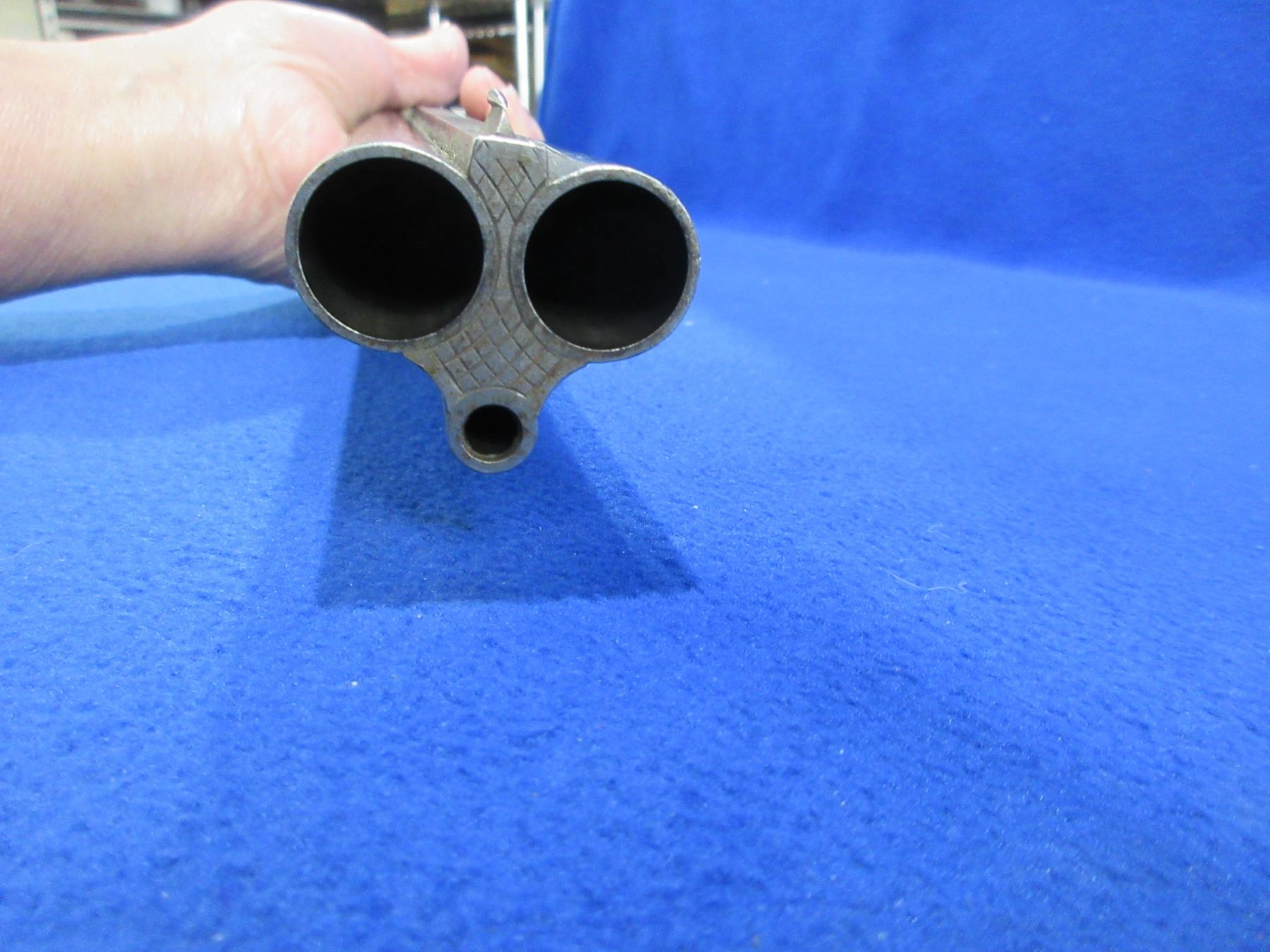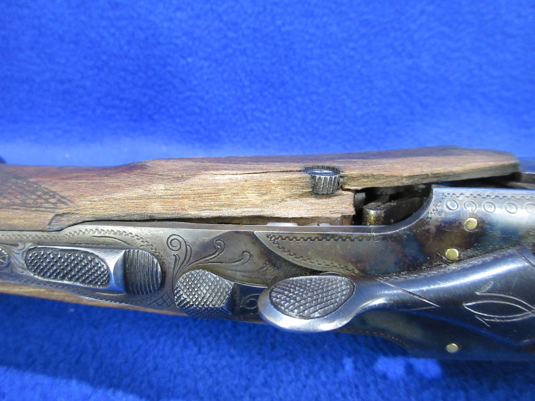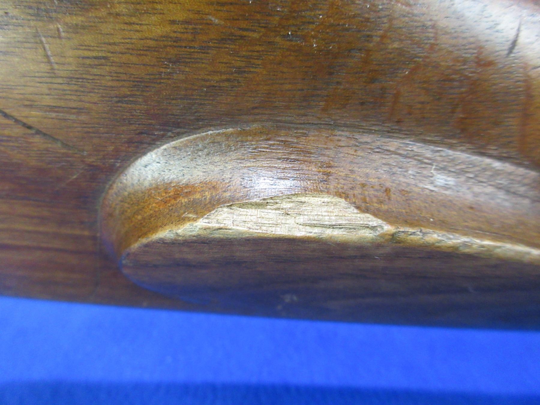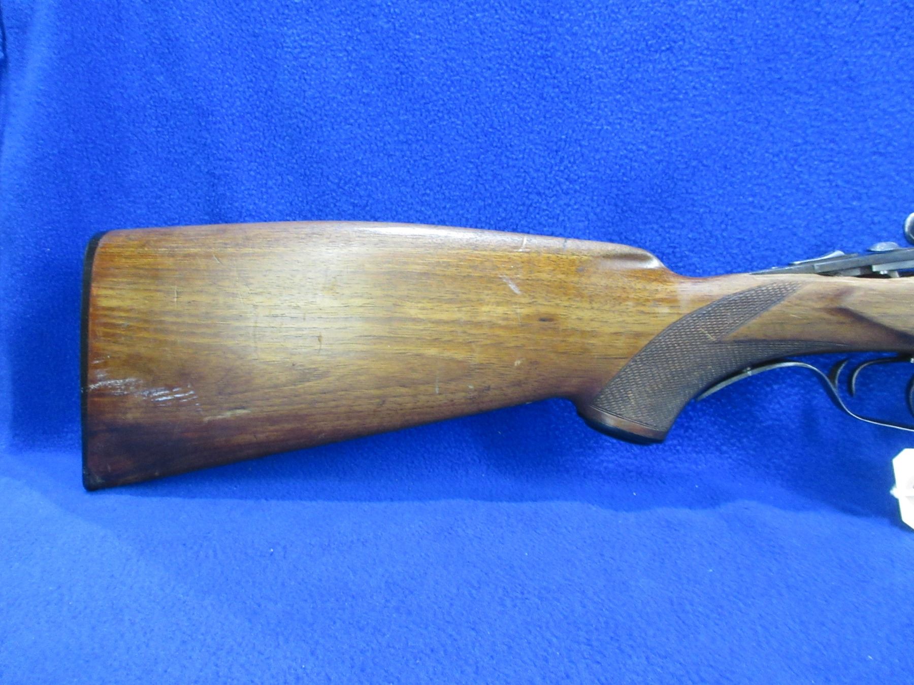 Non-Restricted - Merkel Model 32 Drilling in 12 Ga. 2 3/4"/222 Rem. - This is a tip up combo shotgun/rifle, action is tight and appears to be in good working order but should not be fired as the stock is broken and needs replaced. Rear trigger is bent. 12 Ga. barrels are 24 7/8" - bores are good to very good, rifle barrel is 24 7/8" - rifling is good but there is something stuck on the bottom of the barrel about a 1/3 of the way from the muzzle (looks like lead), bluing is good, length of pull is 14 1/2", has both sights, stock is broken and needs replaced, forearm is good to very good, butt plate good. Ser # 963039