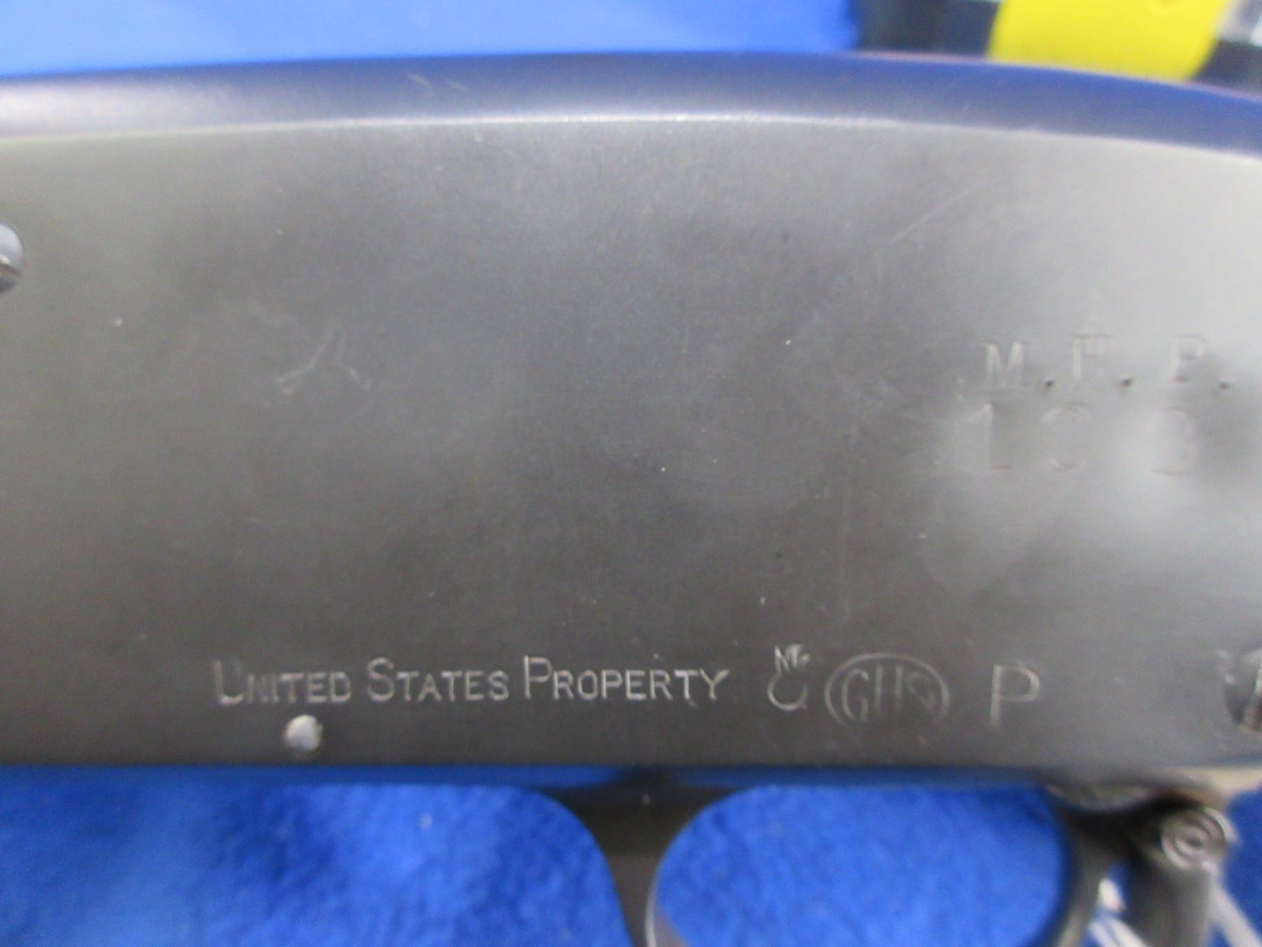 Non-Restricted - Stevens Model 620-A, U.S. Military Riot Shotgun in 12 Ga. 2 3/4" - Marked "United States Property M.H.P. 103" with Flaming Ordnance Bomb and "P". This is a RARE United States Military pump action RIOT shotgun with tube magazine, action appears to be in good to very good working order. Barrel is 20", bore is good to very good, bluing is good, has bead front sight, stock has a hairline crack on top of wrist area and 2 on bottom of wrist area, forearm is good with usage marks, length of pull is 14", butt plate good, wrist cap has small chips. Ser # 6788