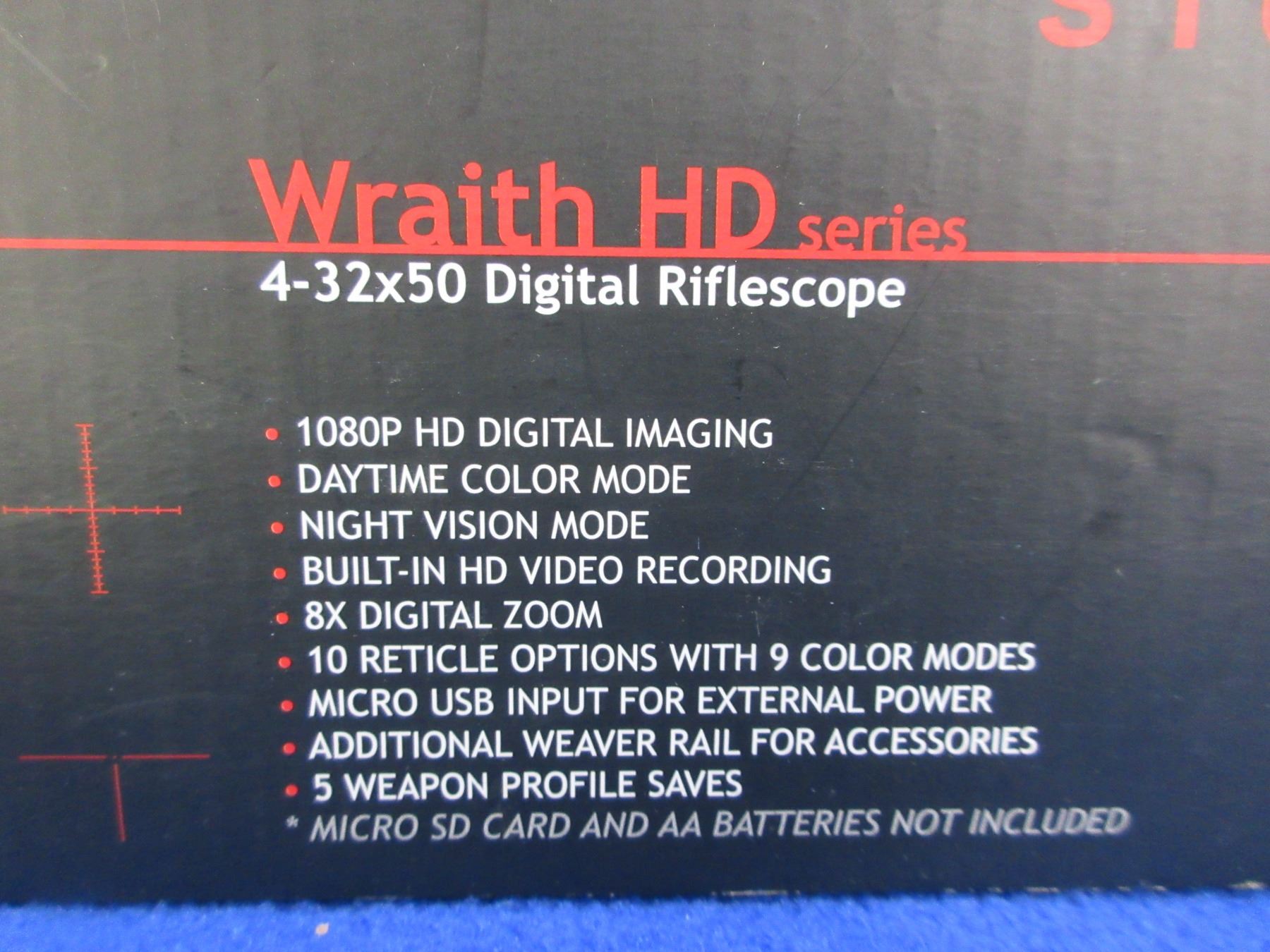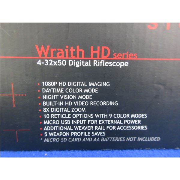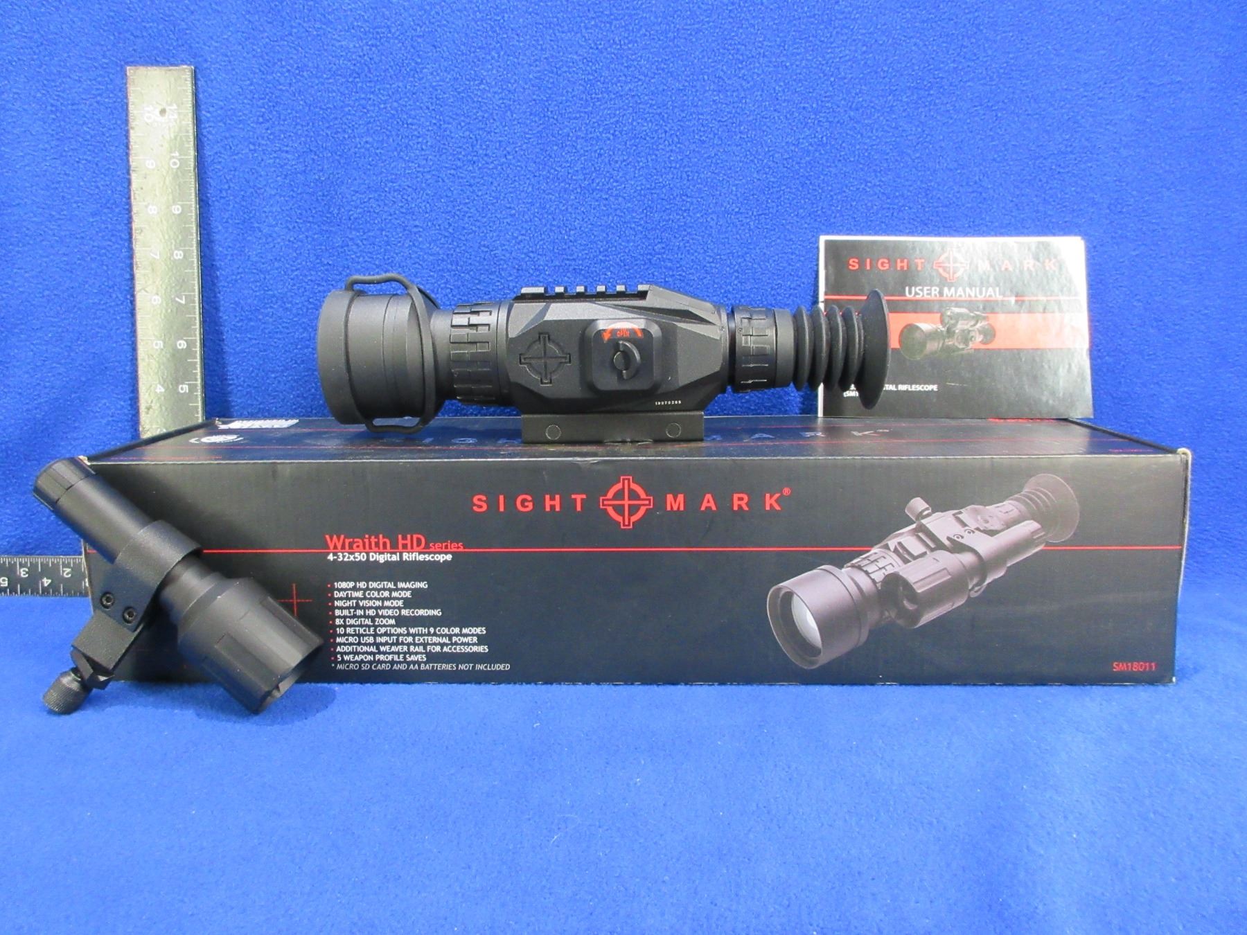 Sight Mark Wraith HD Series 4-32x50 Digital Riflescope - 1080 HP HD Digital Imaging, daytime color, night vision, HD video recording, 8x digital zoom, 10 reticle options, micro USB input, Weaver rail for accessories - Comes with IR flashlight, 2 batteries (requires 4), lens cover, user manual - untested
