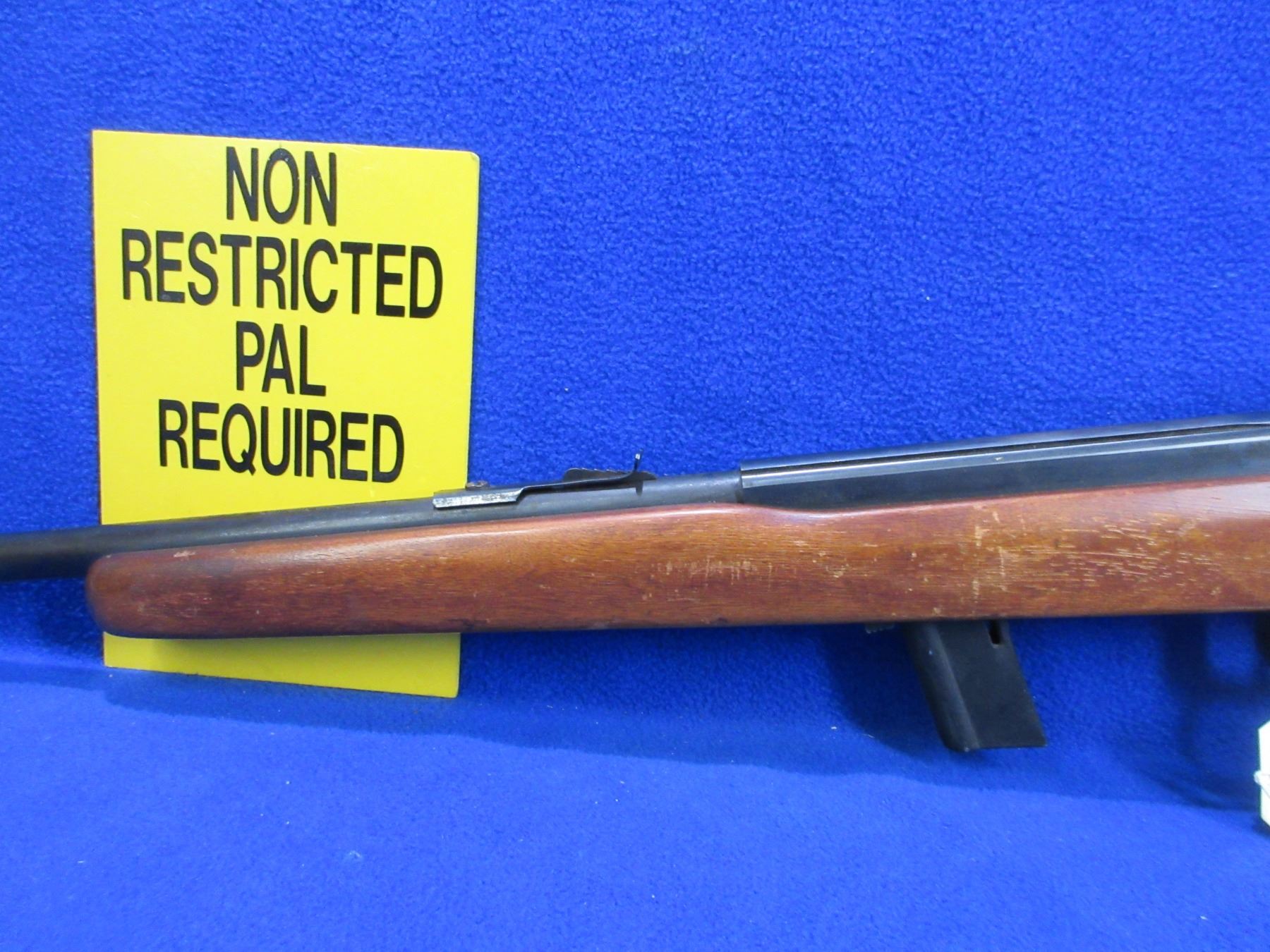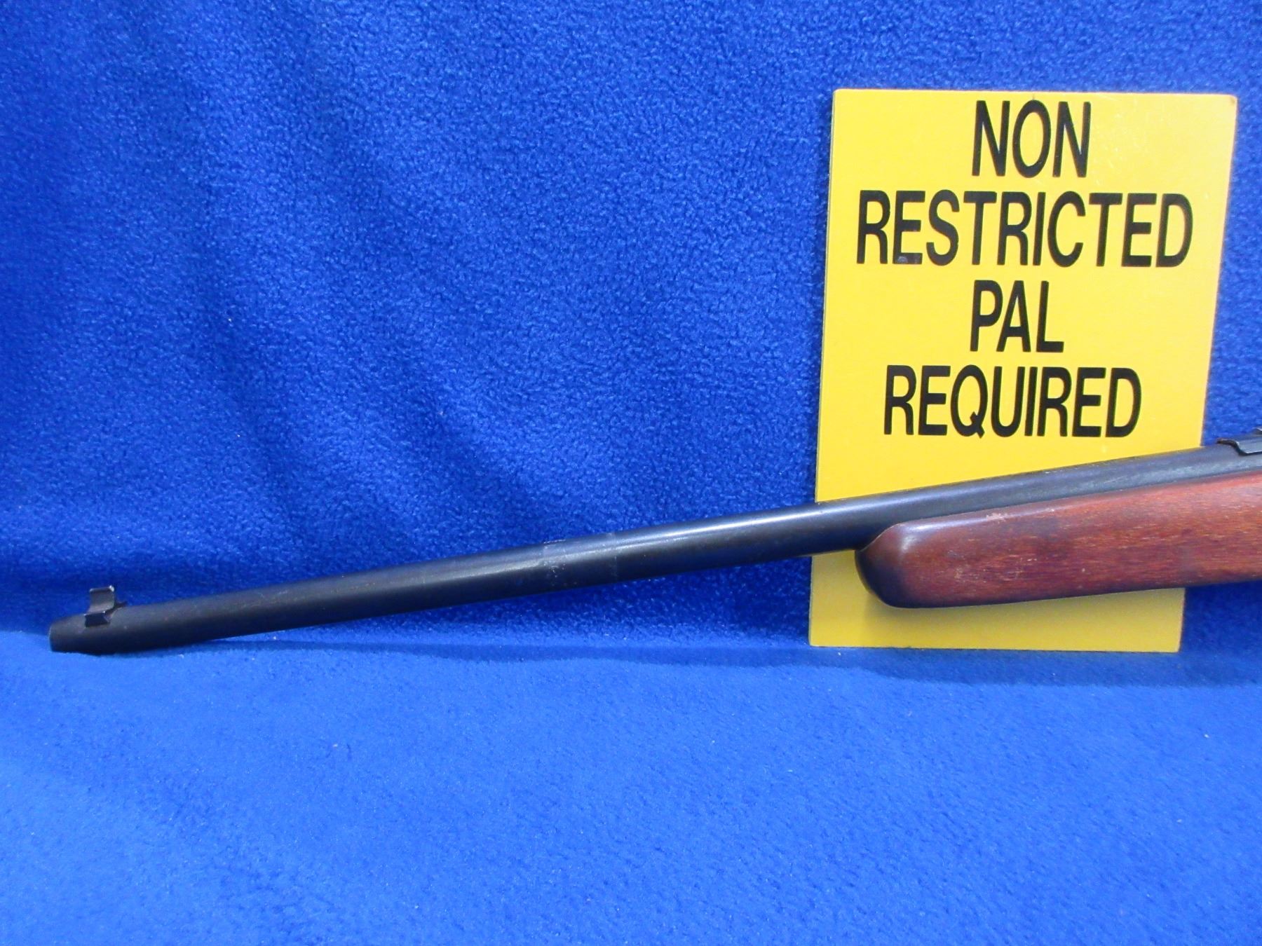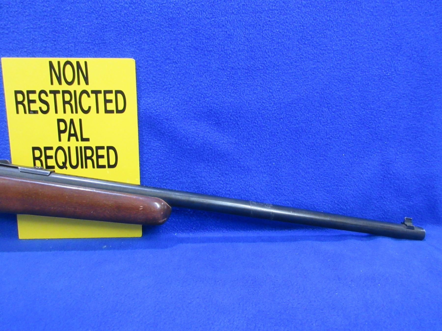 Non-Restricted - Cooey Model 64A in 22 LR - This is a semi-auto rifle with removable magazine, action appears to be in good to very good working order. Barrel is 20", rifling is good to very good, bluing is good with some wear on top of the action, has both sights, stock is good with usage marks and some finish flaking, length of pull is 13 1/4", butt plate good. Ser # None