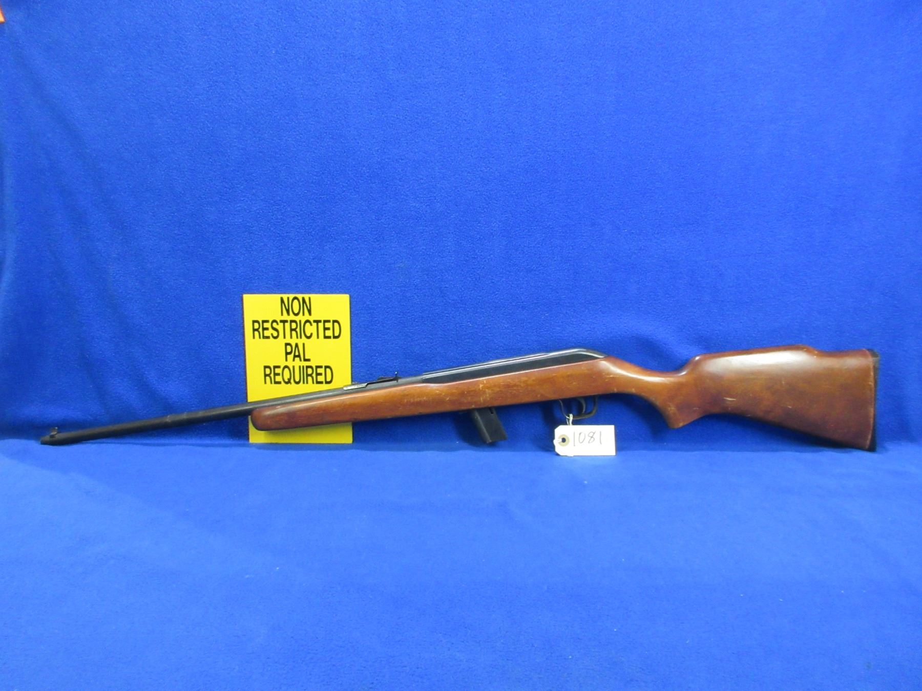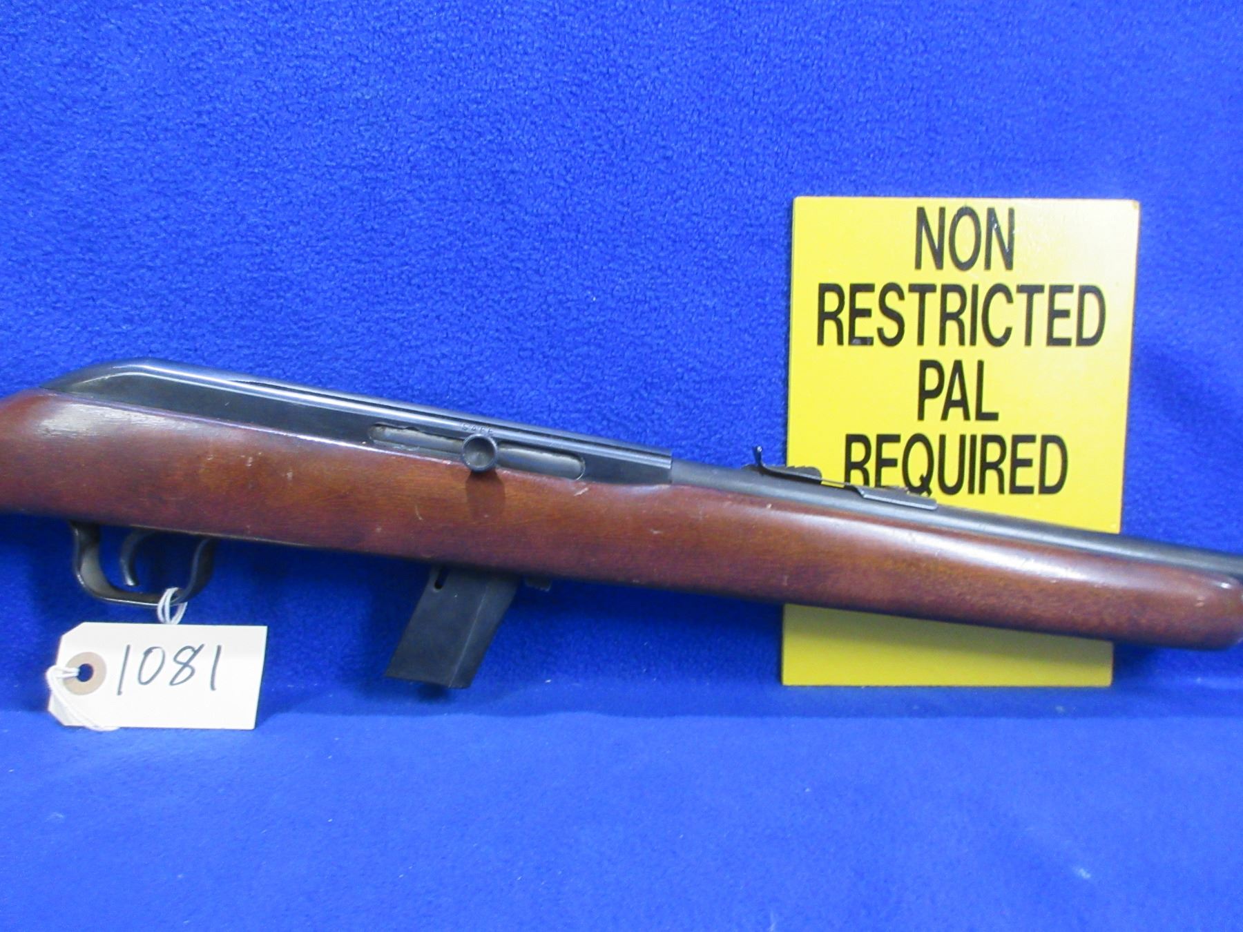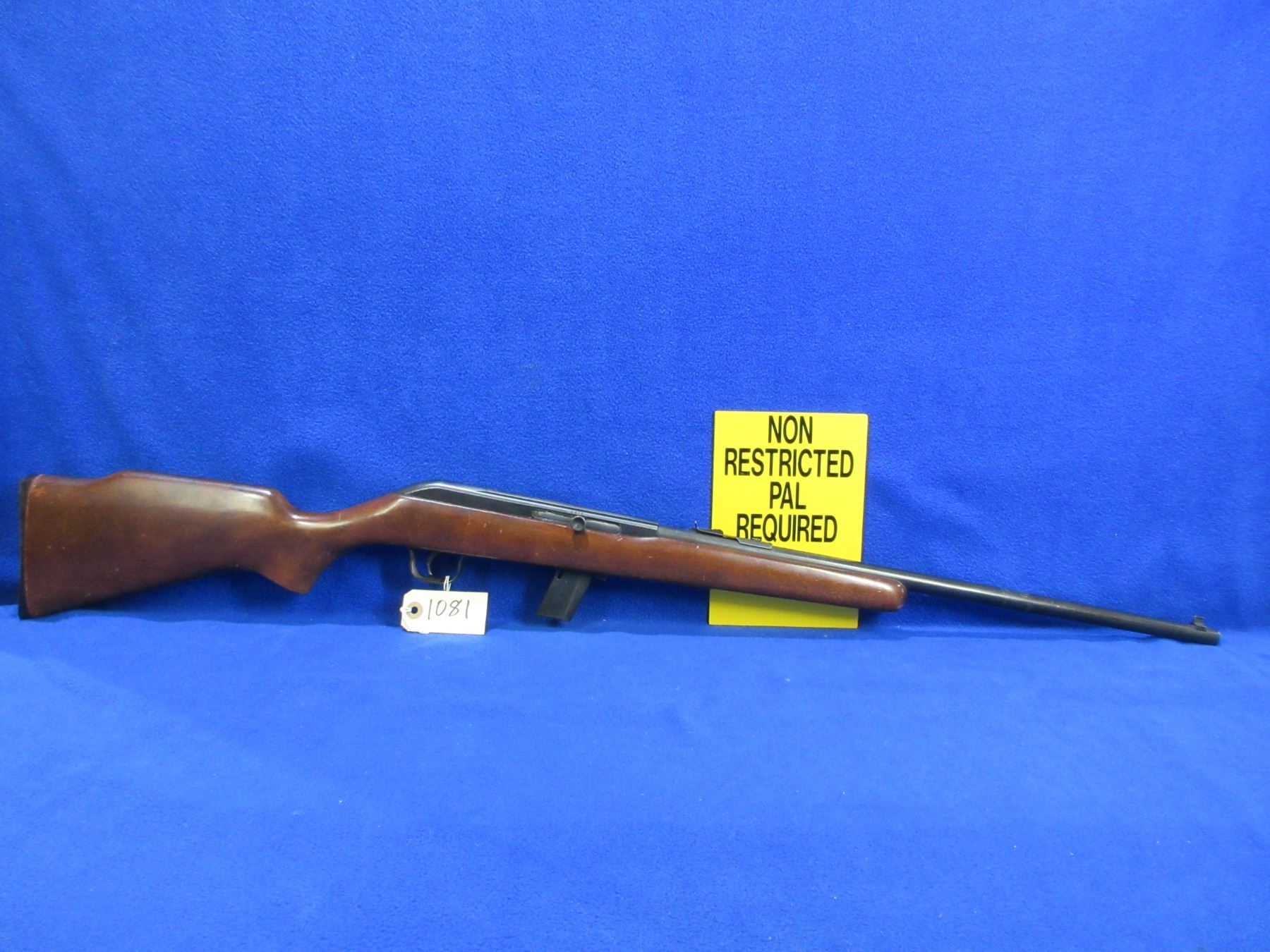 Non-Restricted - Cooey Model 64A in 22 LR - This is a semi-auto rifle with removable magazine, action appears to be in good to very good working order. Barrel is 20", rifling is good to very good, bluing is good with some wear on top of the action, has both sights, stock is good with usage marks and some finish flaking, length of pull is 13 1/4", butt plate good. Ser # None