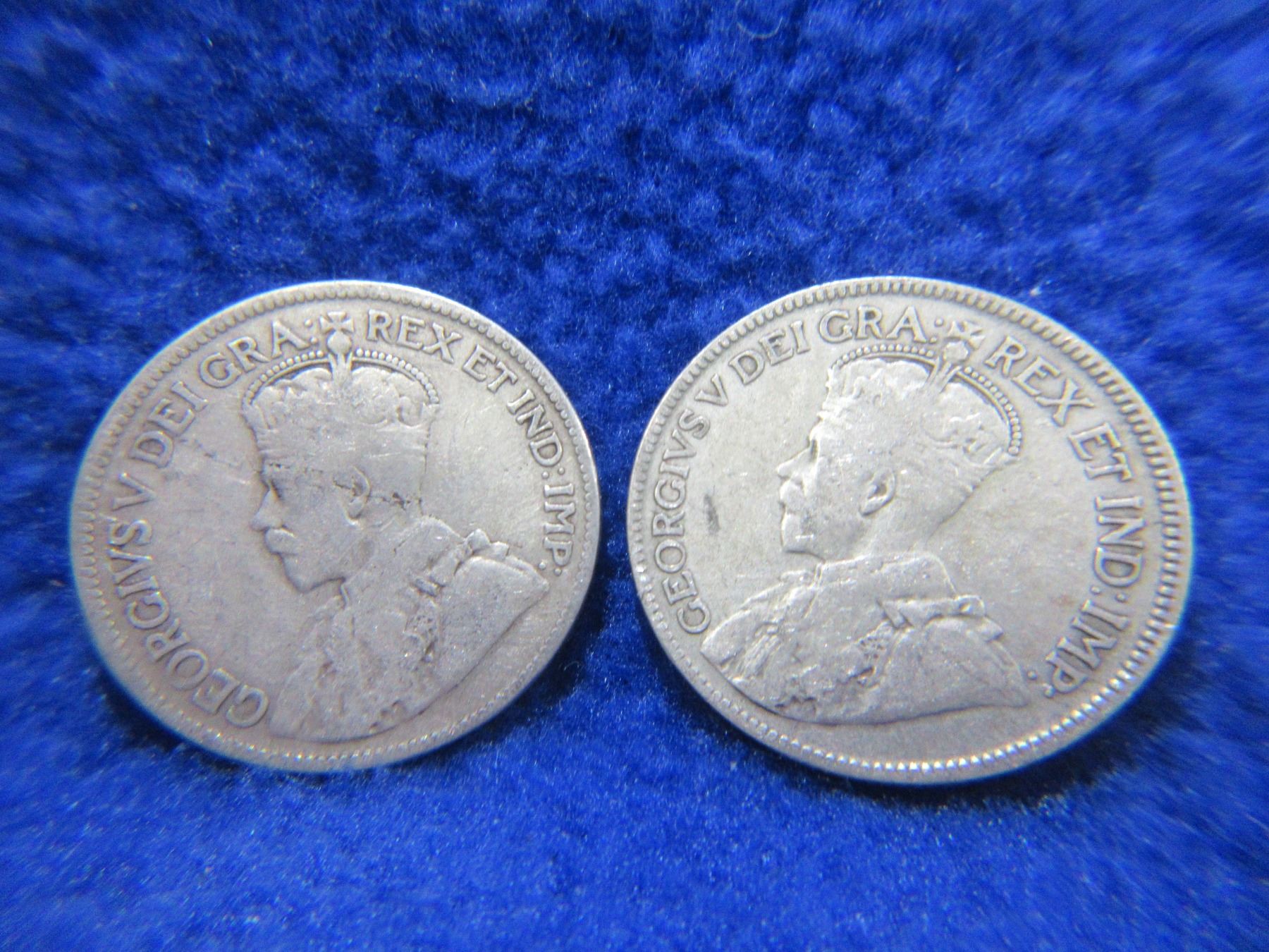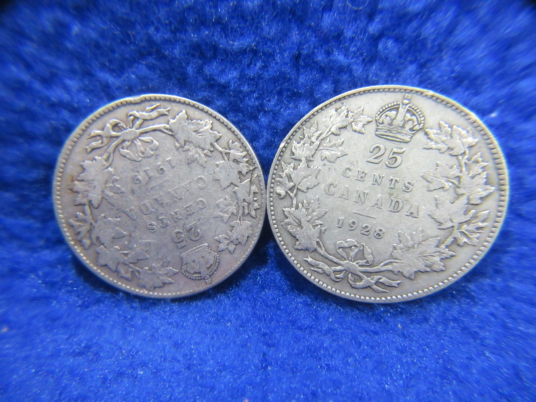 2 Canadian 25 Cent Coins - 1919 (.925 Silver), 1928 (.800 Silver)