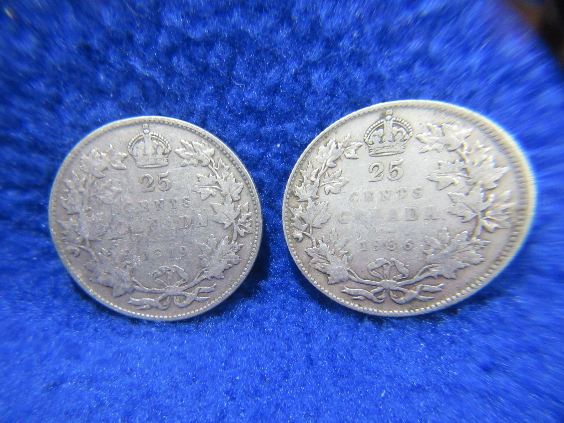 2 Canadian 25 Cent Coins - 1919 (.925 Silver), 1936 (.800 Silver)