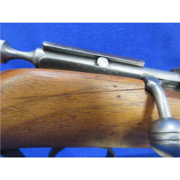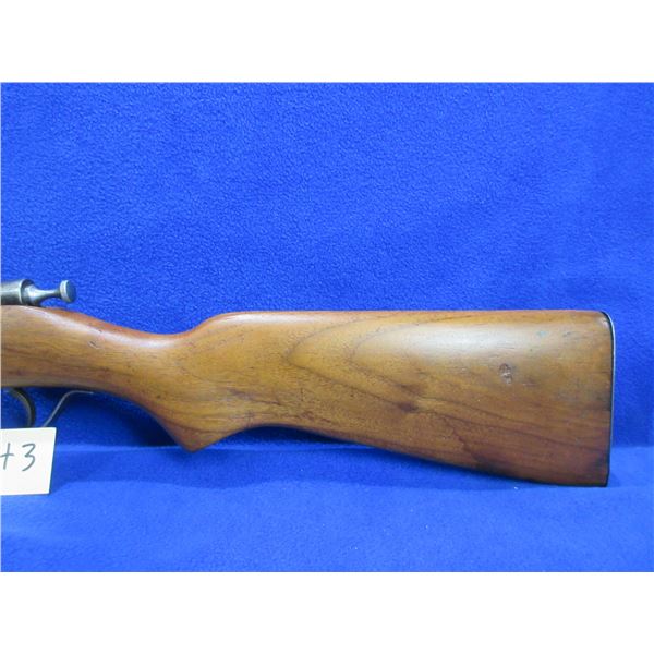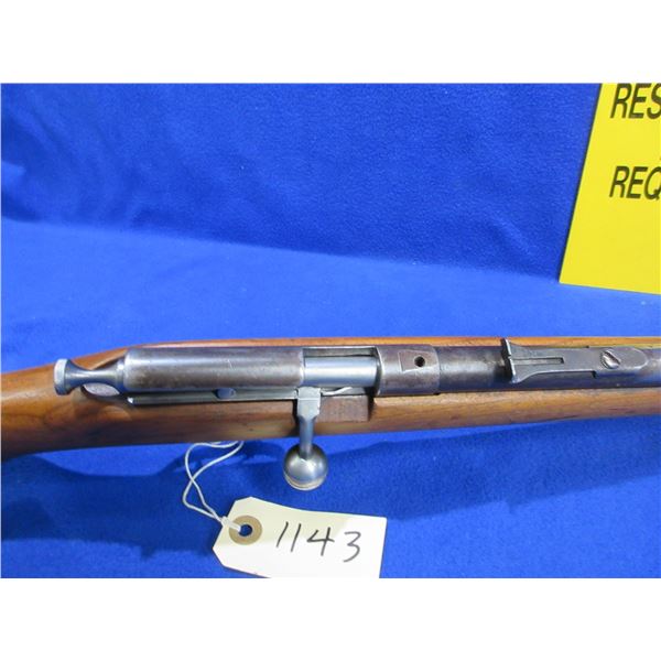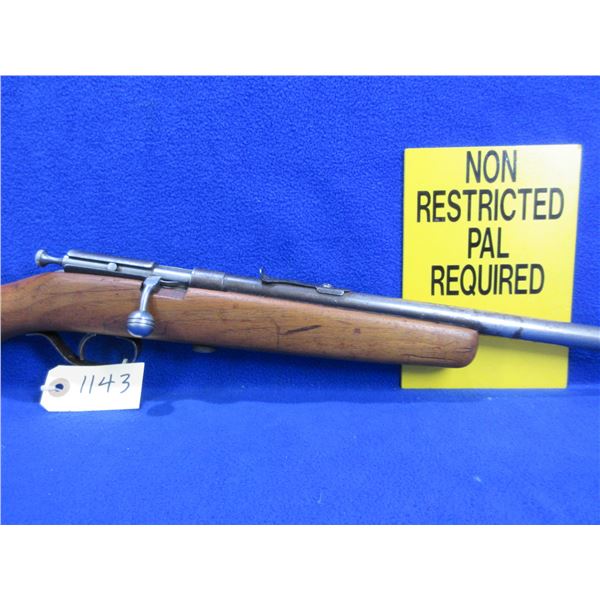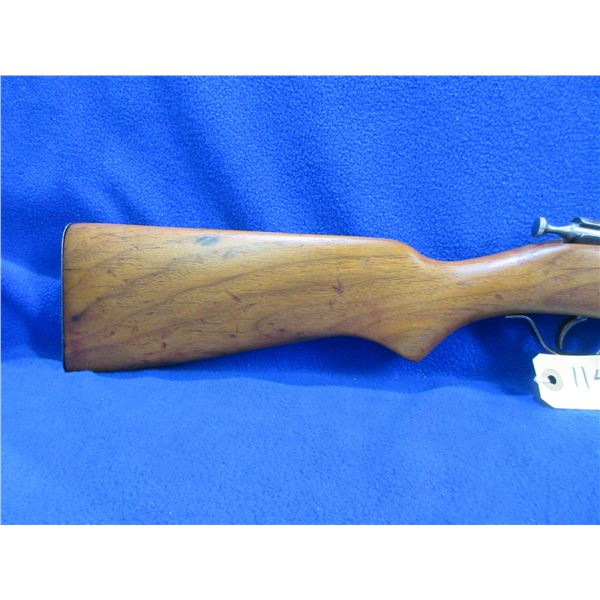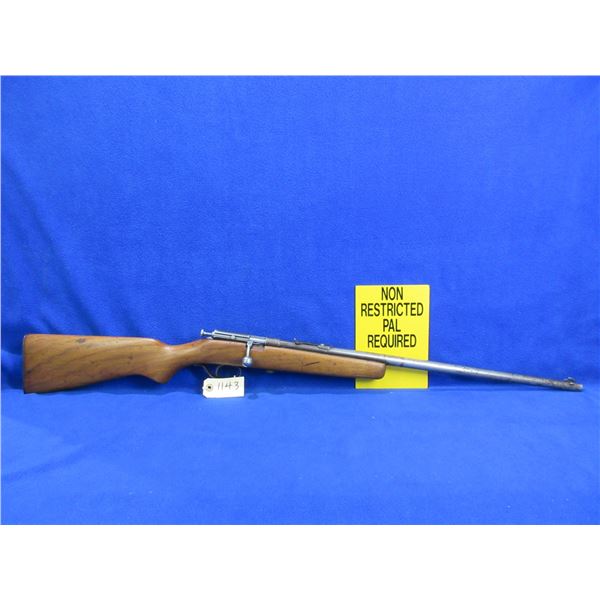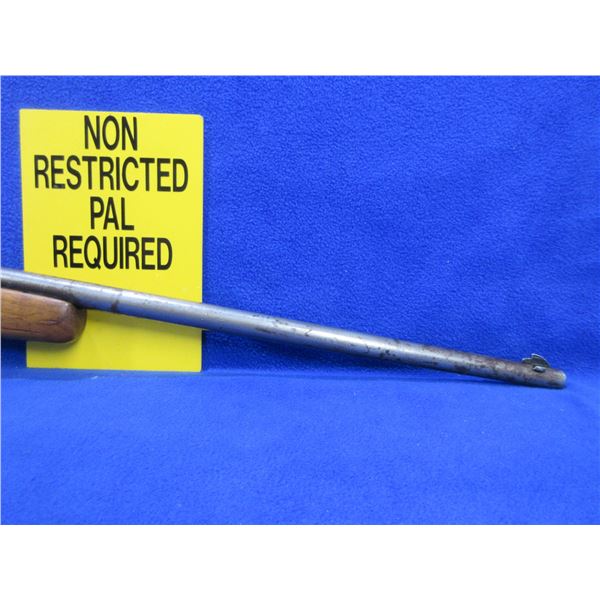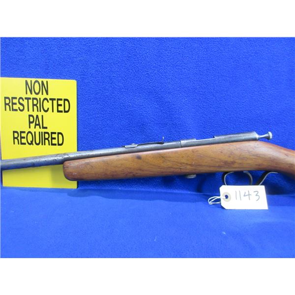 Non-Restricted - Hiawatha (Cooey) in 22 S/L/LR- This is a single shot bolt action rifle, action appears to be in good to very good working order. Barrel is 22", rifling is good, bluing is gone, has both sights but rear sight is missing the ramp, stock has been refinished but has a crack on the right side, length of pull is 13 1/2", metal butt plate good. Ser # None