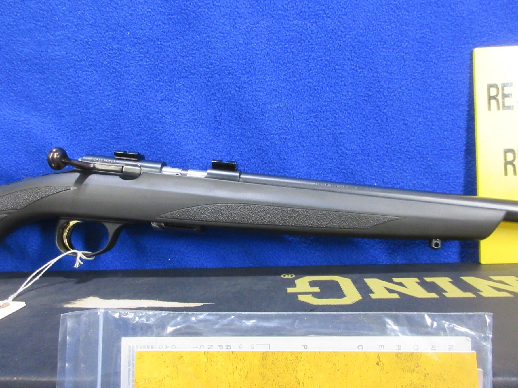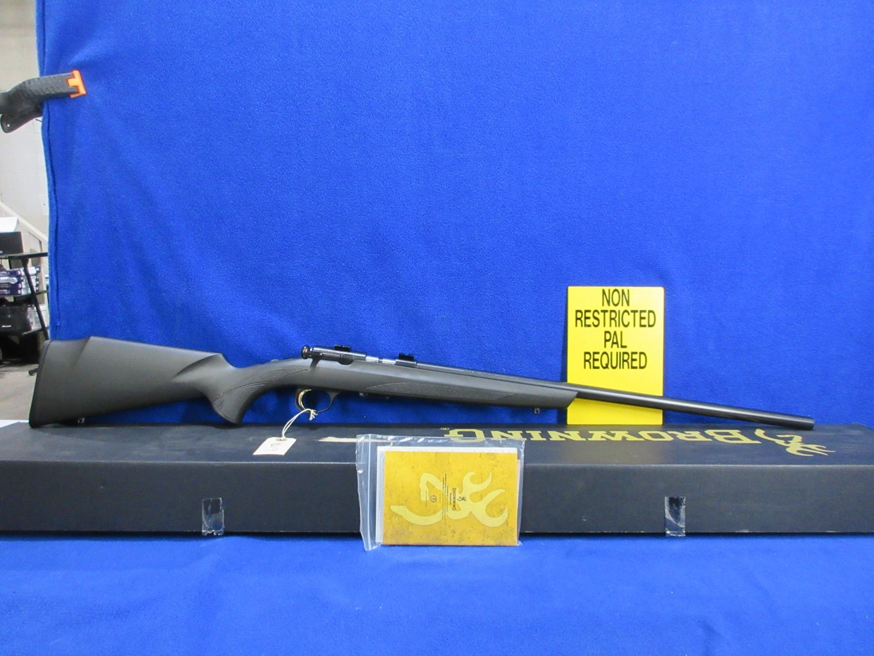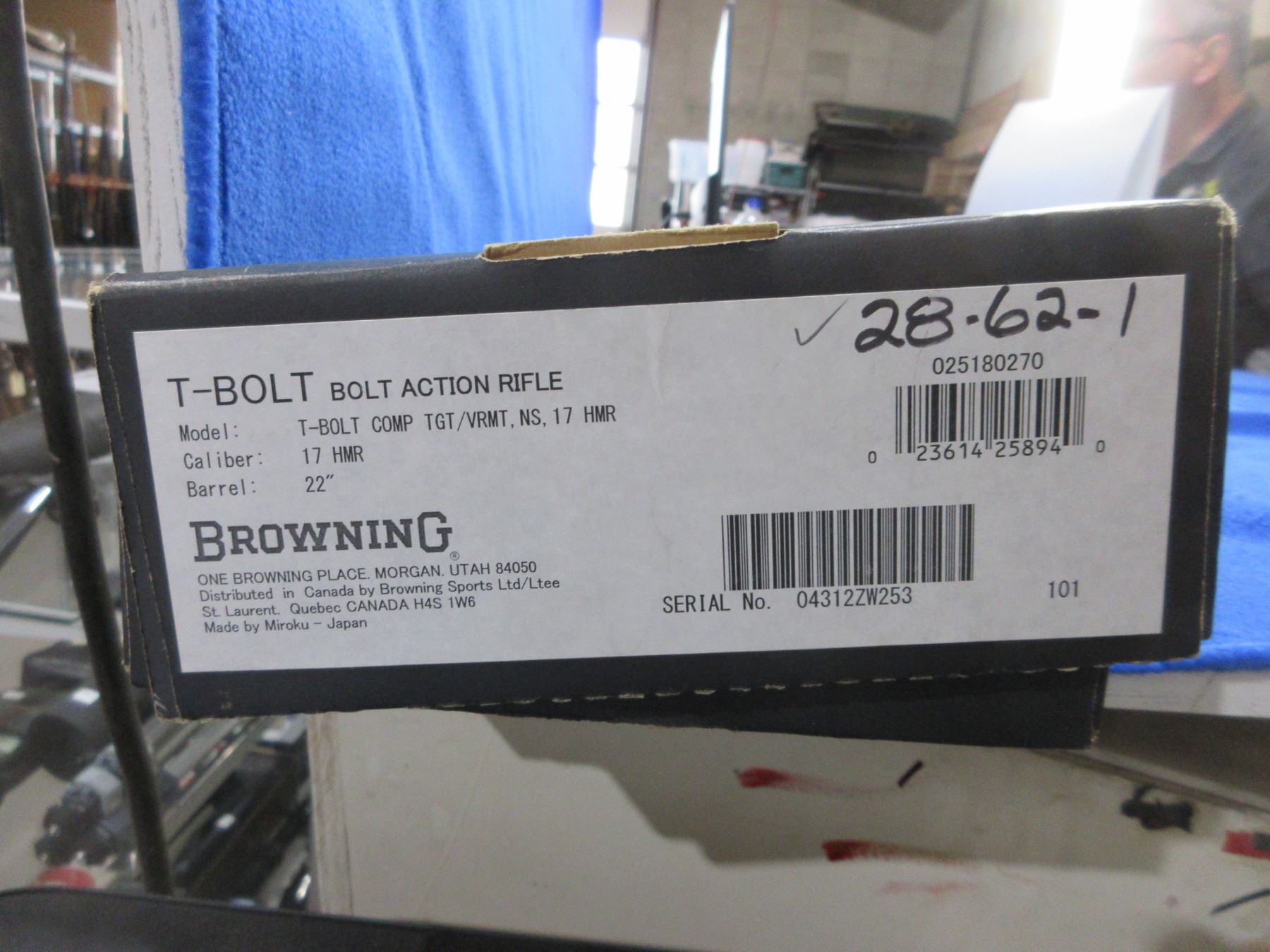 Non-Restricted - Browning Model T-Bolt in 17 HMR - This is a bolt action rifle with 2 double helix rotary magazines (butt plate contains an extra magazine), action appears to be in very good working order. Barrel is 22", rifling is very good, bluing is very good, has no sights but has Weaver style bases, synthetic stock is very good, length of pull is 13 1/2", butt plate very good and contains an extra magazine, comes with swivel studs, original box and paperwork. Ser # O4312ZW253