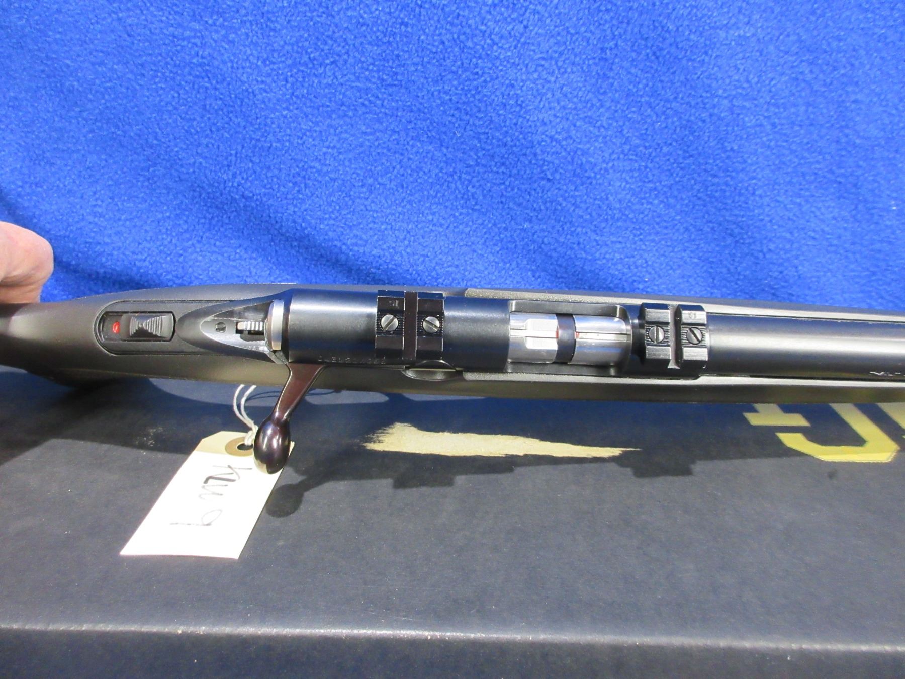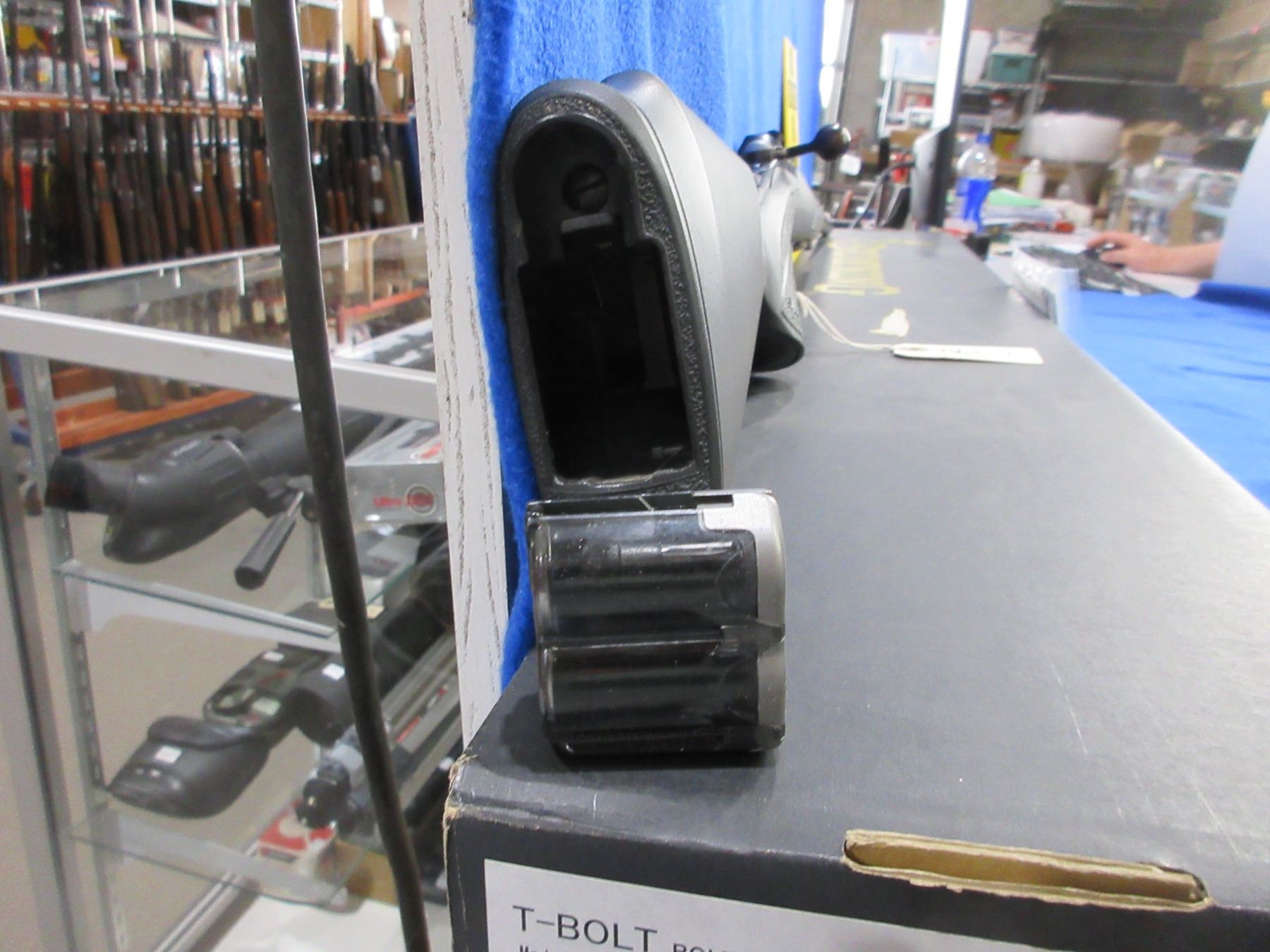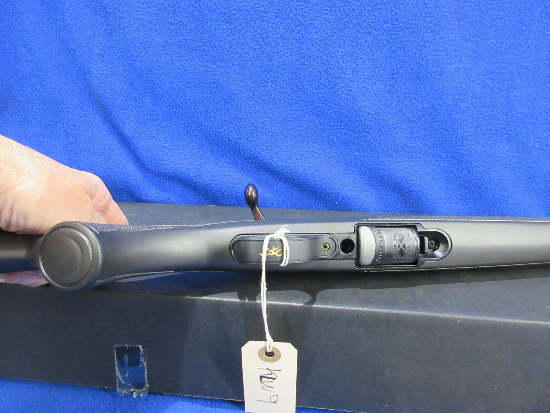 Non-Restricted - Browning Model T-Bolt in 17 HMR - This is a bolt action rifle with 2 double helix rotary magazines (butt plate contains an extra magazine), action appears to be in very good working order. Barrel is 22", rifling is very good, bluing is very good, has no sights but has Weaver style bases, synthetic stock is very good, length of pull is 13 1/2", butt plate very good and contains an extra magazine, comes with swivel studs, original box and paperwork. Ser # O4312ZW253