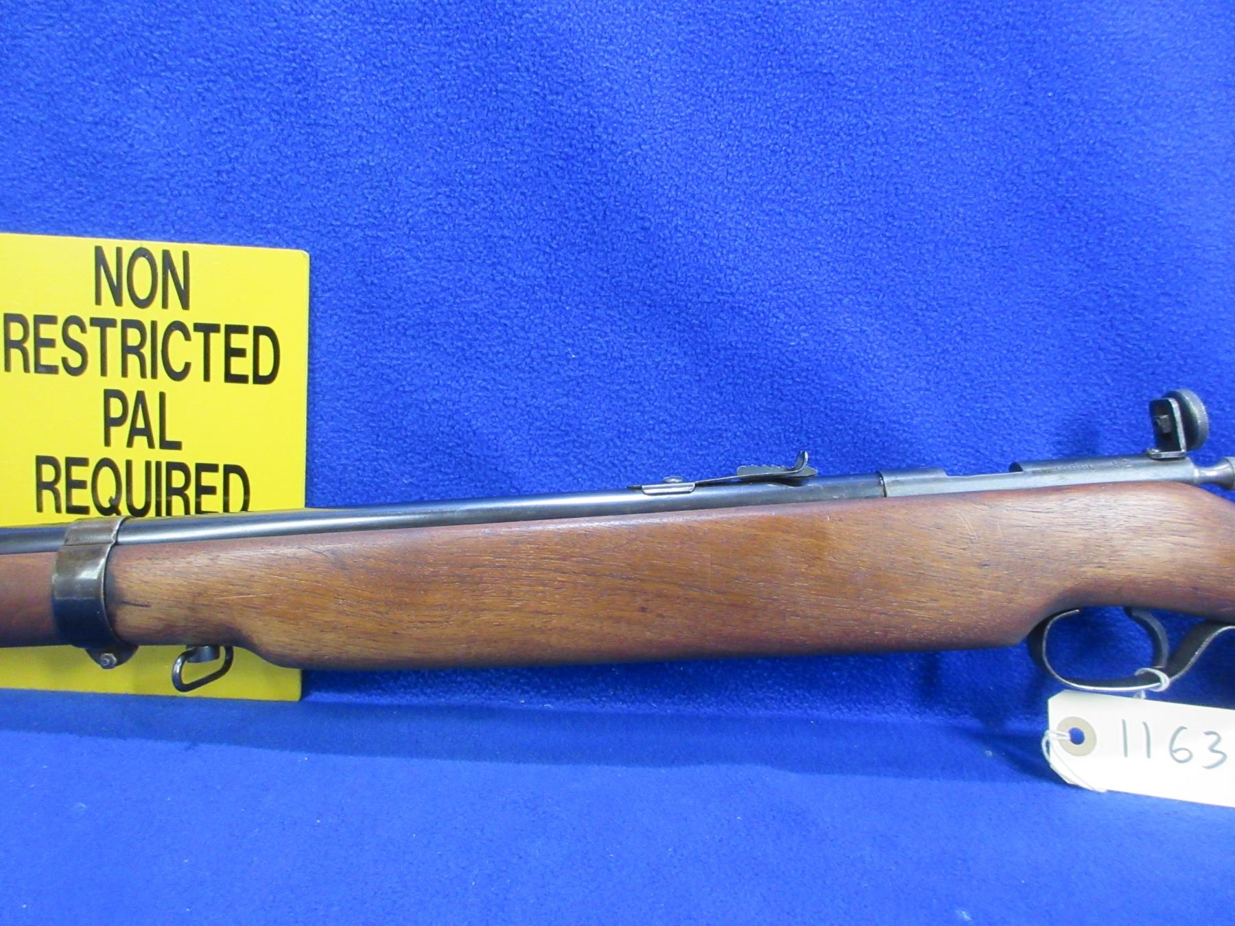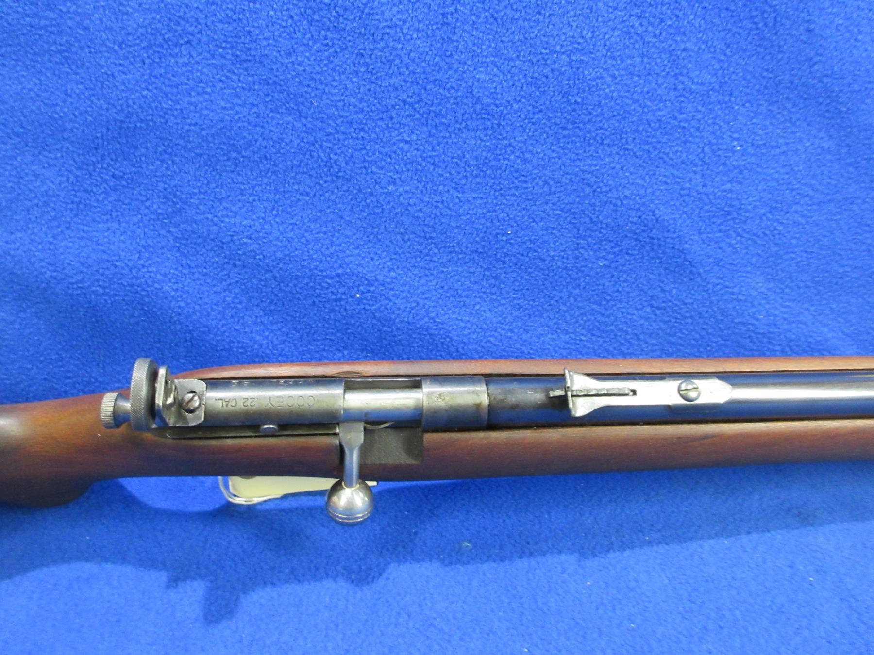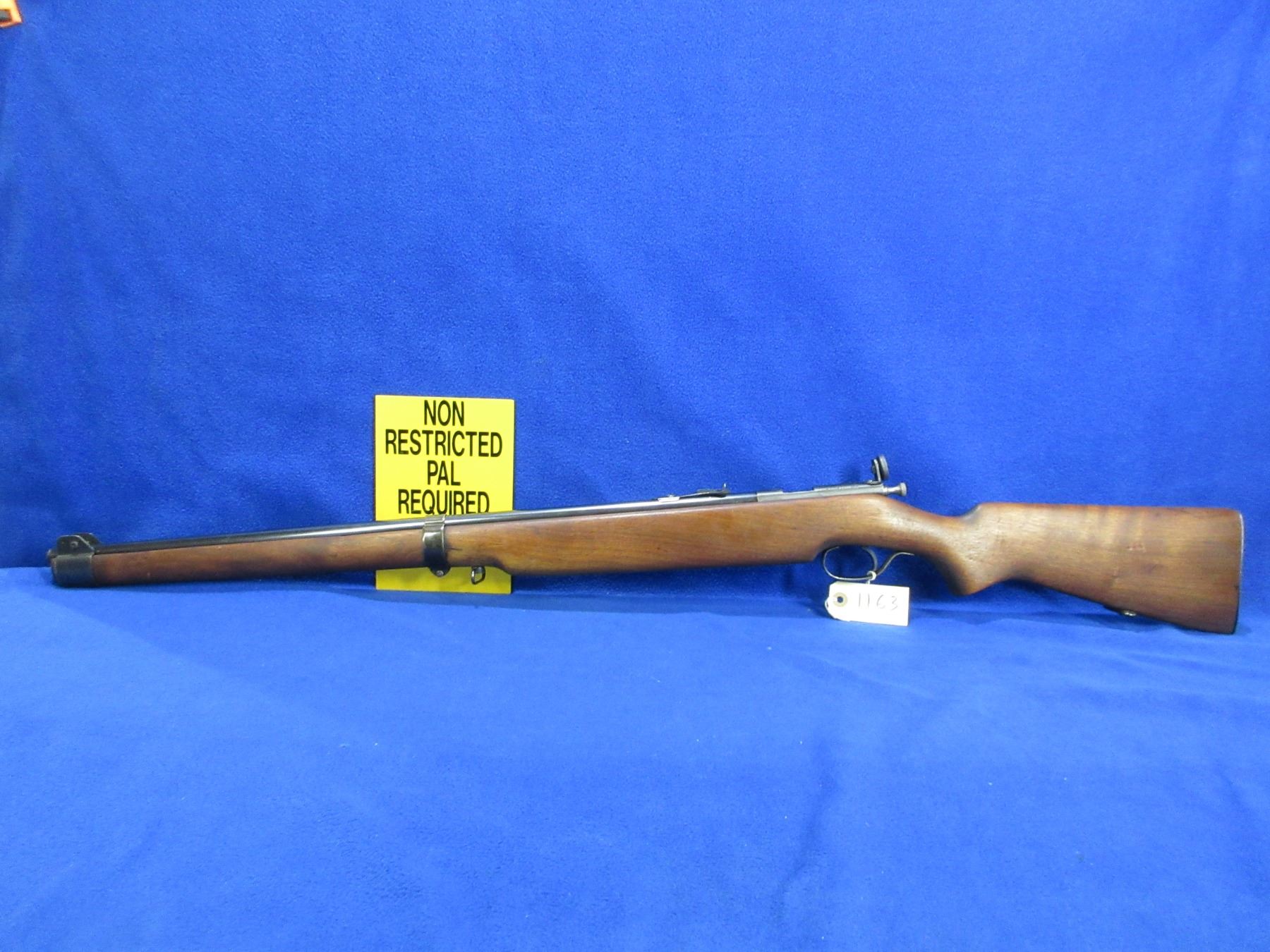Non-Restricted - Cooey Model 82 Trainer in 22 Cal. - This single shot bolt action rifle is in nice condition and a collectible trainer, action appears to be in good to very good working order. Barrel is 27", rifling is good to very good, bluing is good to very good for age, has both sights and rear peep sight, full wood stock is good to very good with usage marks and has been refinished, length of pull is 13", metal butt plate good, comes with swivels. Ser # 5384 on Stock