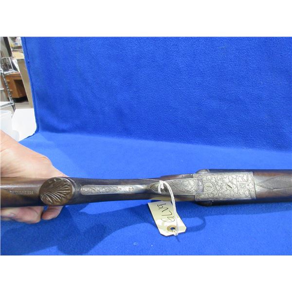 Non-Restricted - Belgian SXS in 12 Ga. 2 3/4" - This is a tip up SXS shotgun, beautifully engraved action is tight and appears to be in good to very good working order. Barrels are 27 1/2", bores are good to very good, bluing is good to very good but starting to dull, has bead front sight, stock is good to very good with usage marks, forearm is good to very good with usage marks, length of pull is 15", rubber recoil pad good. Ser # 258