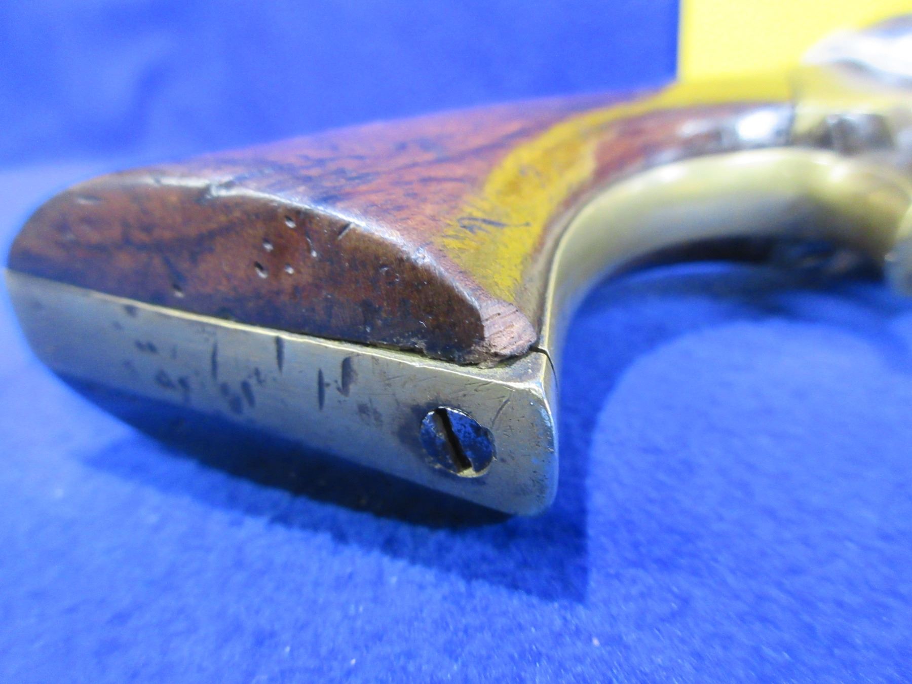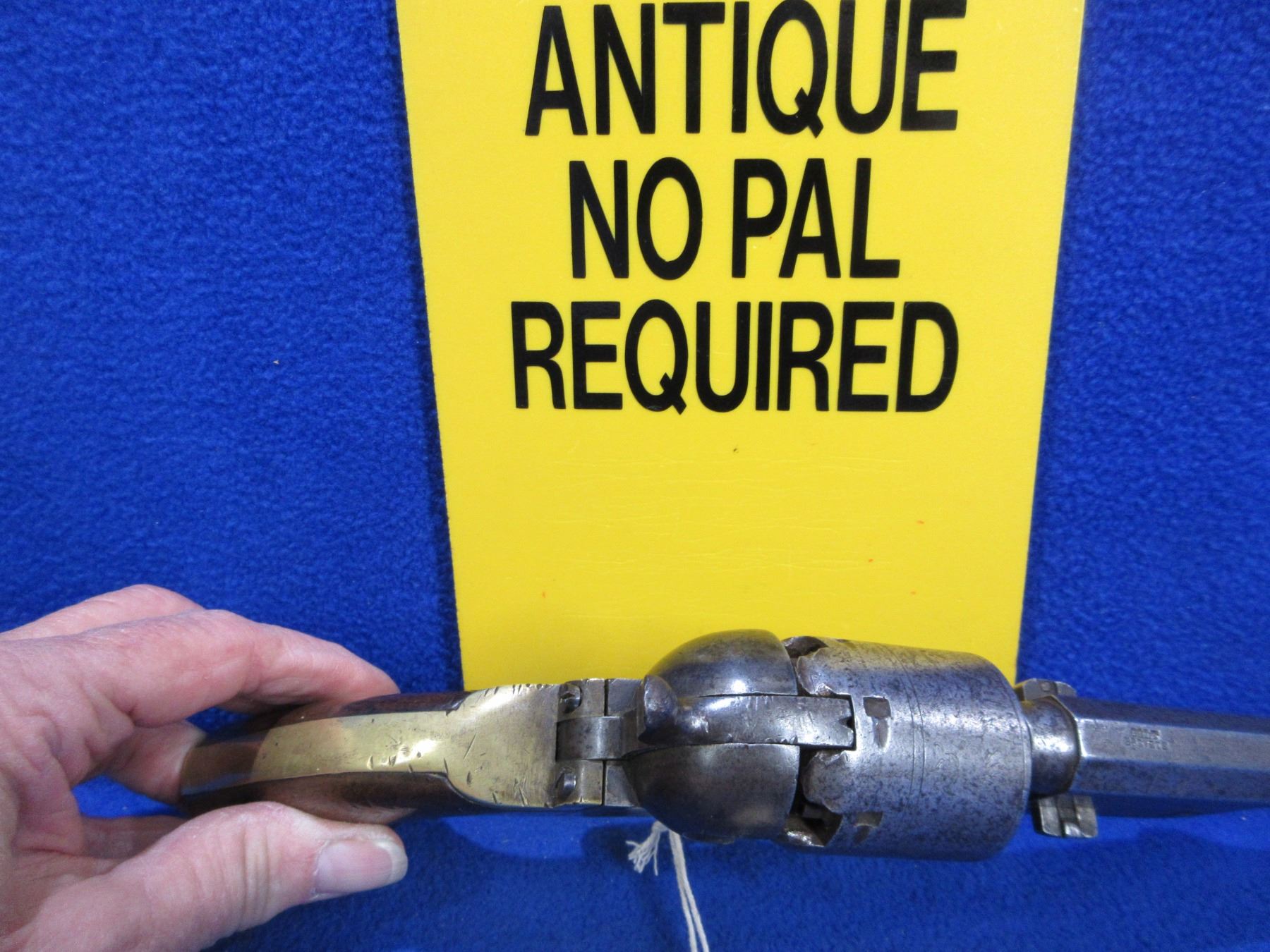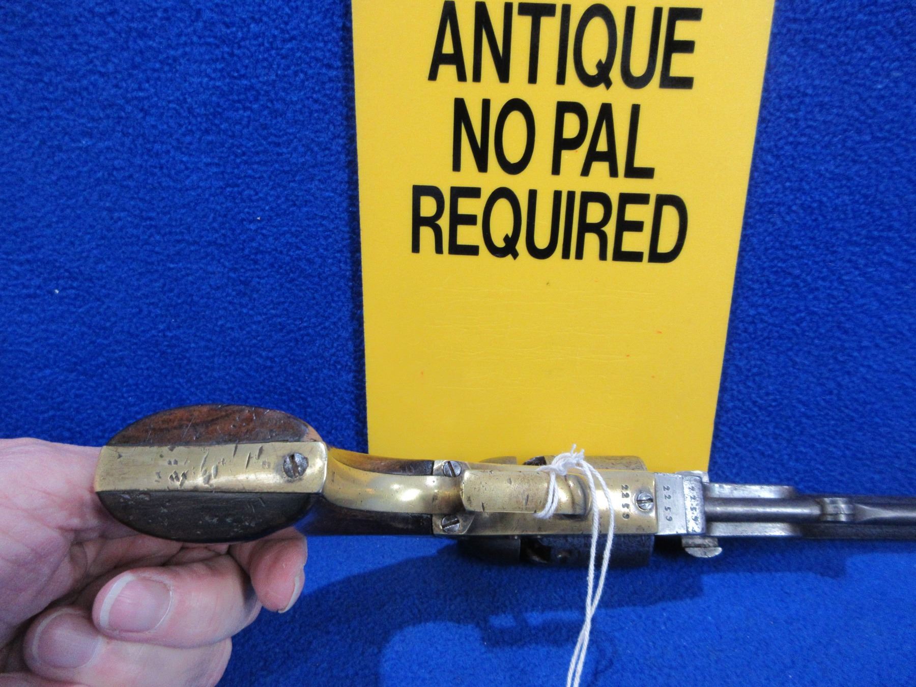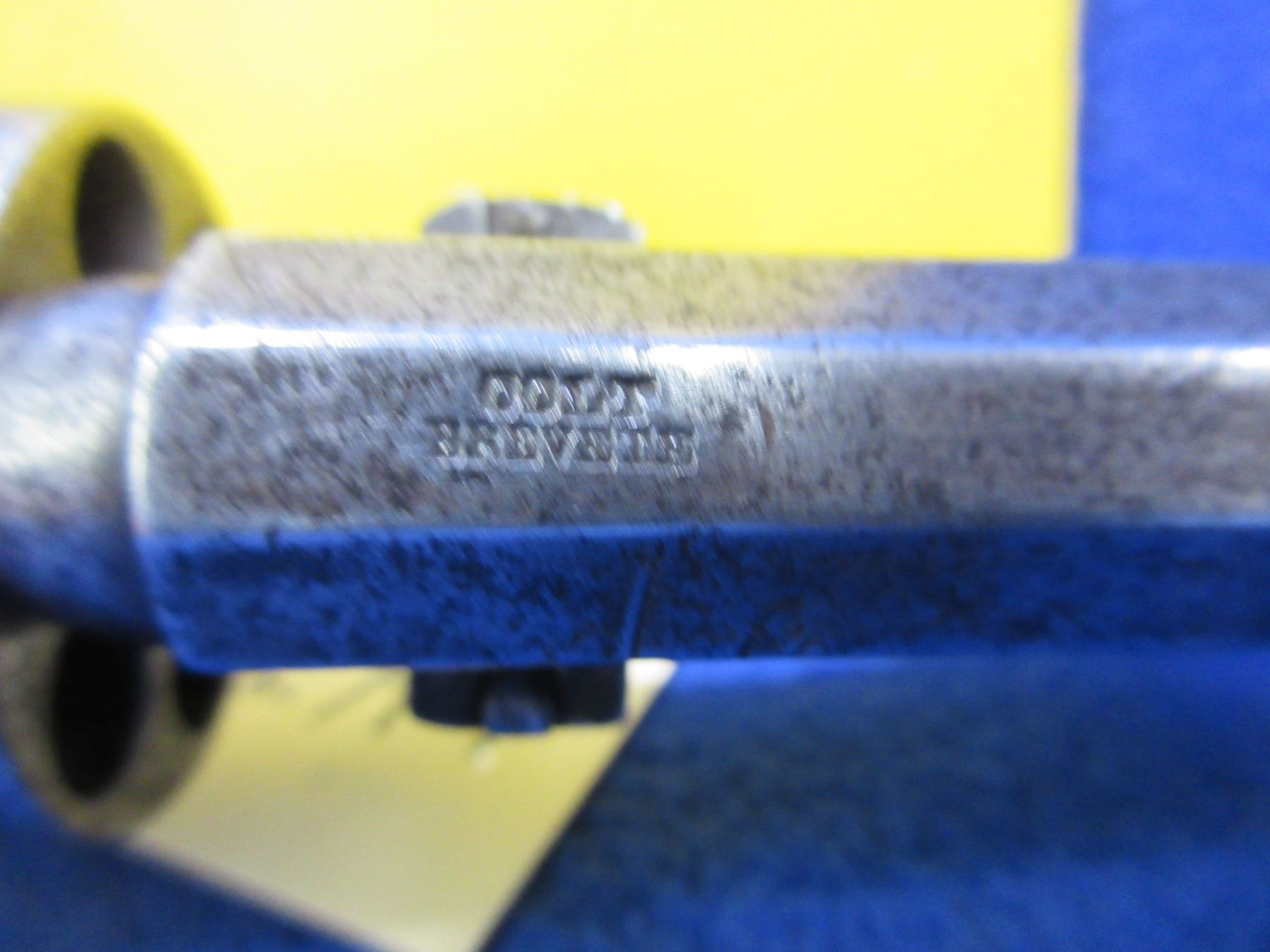 Antique - No PAL Required - Colt Brevete 1851 Navy in 36 Cal. - Rare and desireable, this is 1 of 1700 stamped Colt and Brevete. This is a six shot single action cap and ball revolver, action functions properly but is worn. Octagon barrel is 7 3/8". rifling is good for age, bluing is mostly gone or grey, has both sights, brass backstrap is good with usage marks and wood grips are good with usage marks and a small chip on the toe right side. Ser # 2259
