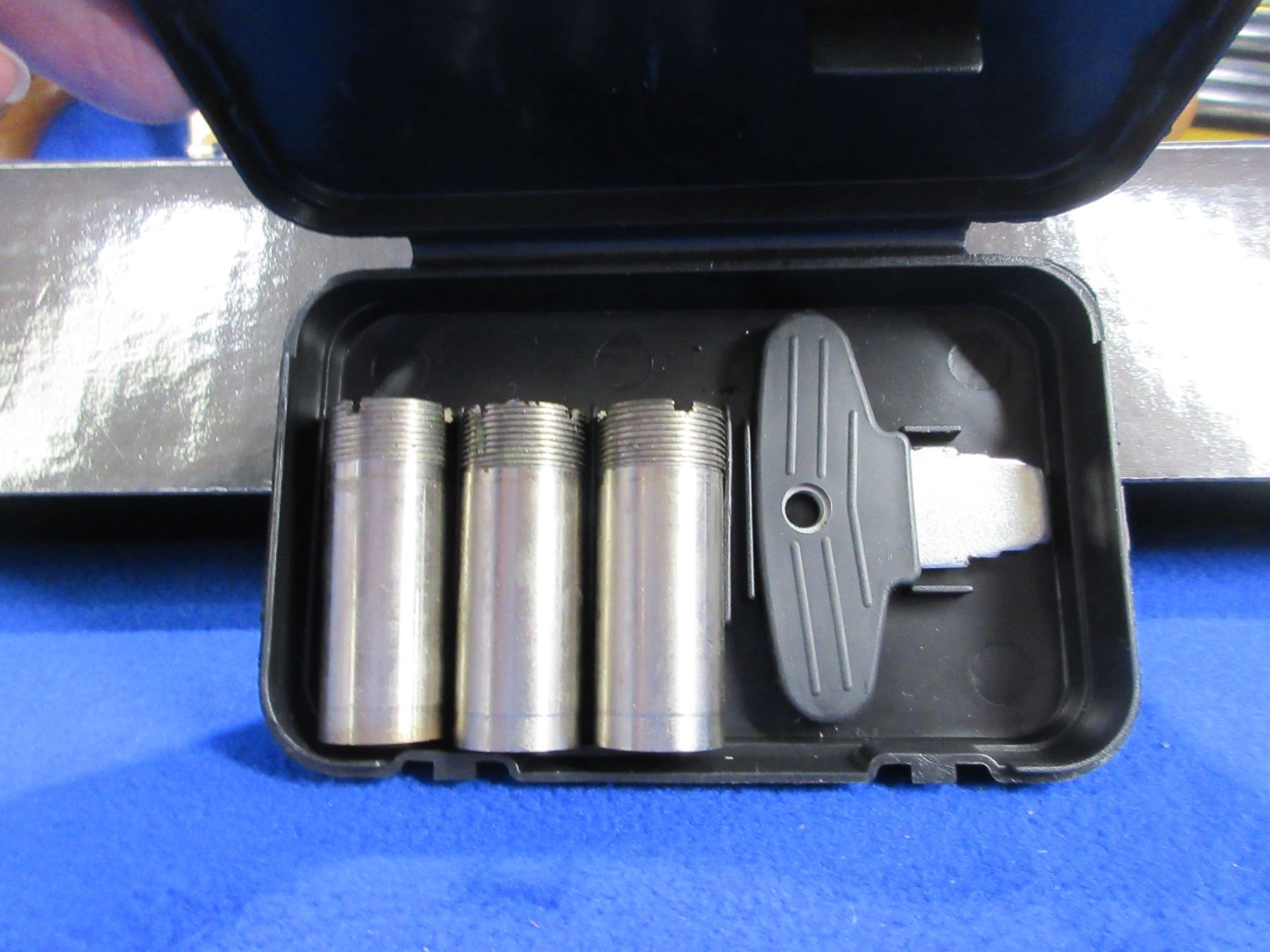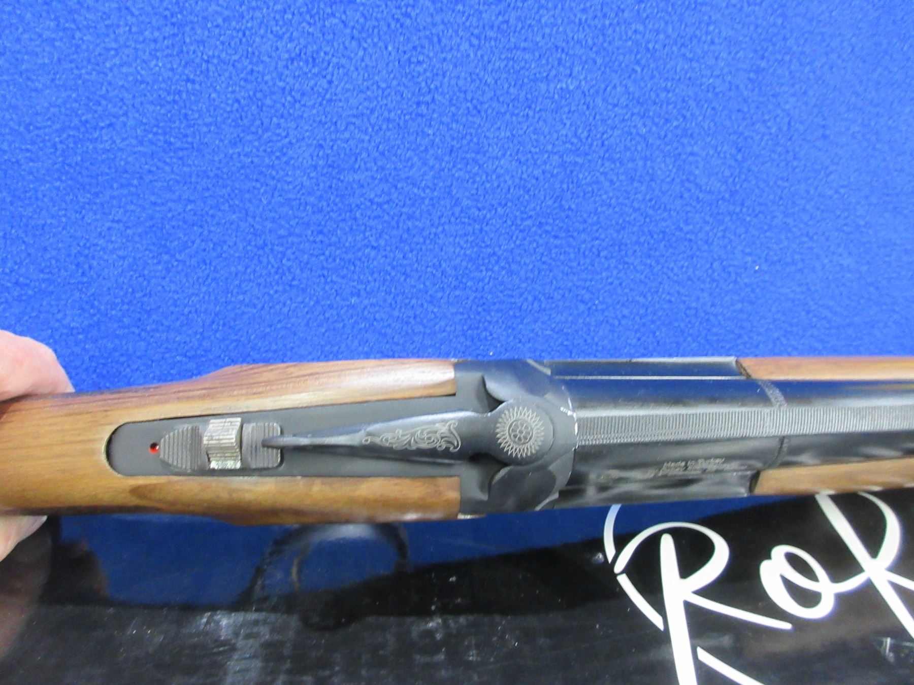 Non-Restricted - Rokin Model OU-1 in 12 Ga. 3" - This over/under shotgun with extractors and removable chokes is in like new condition, action is tight and appears to be in very good working order. Barrels are 26", bores are very good, bluing is very good, has fiber optic front sight, stock is very good, forearm is very good, length of pull is 14", rubber butt plate very good, comes with 3 extra chokes, wrench and original box. Ser # RKO0621-17