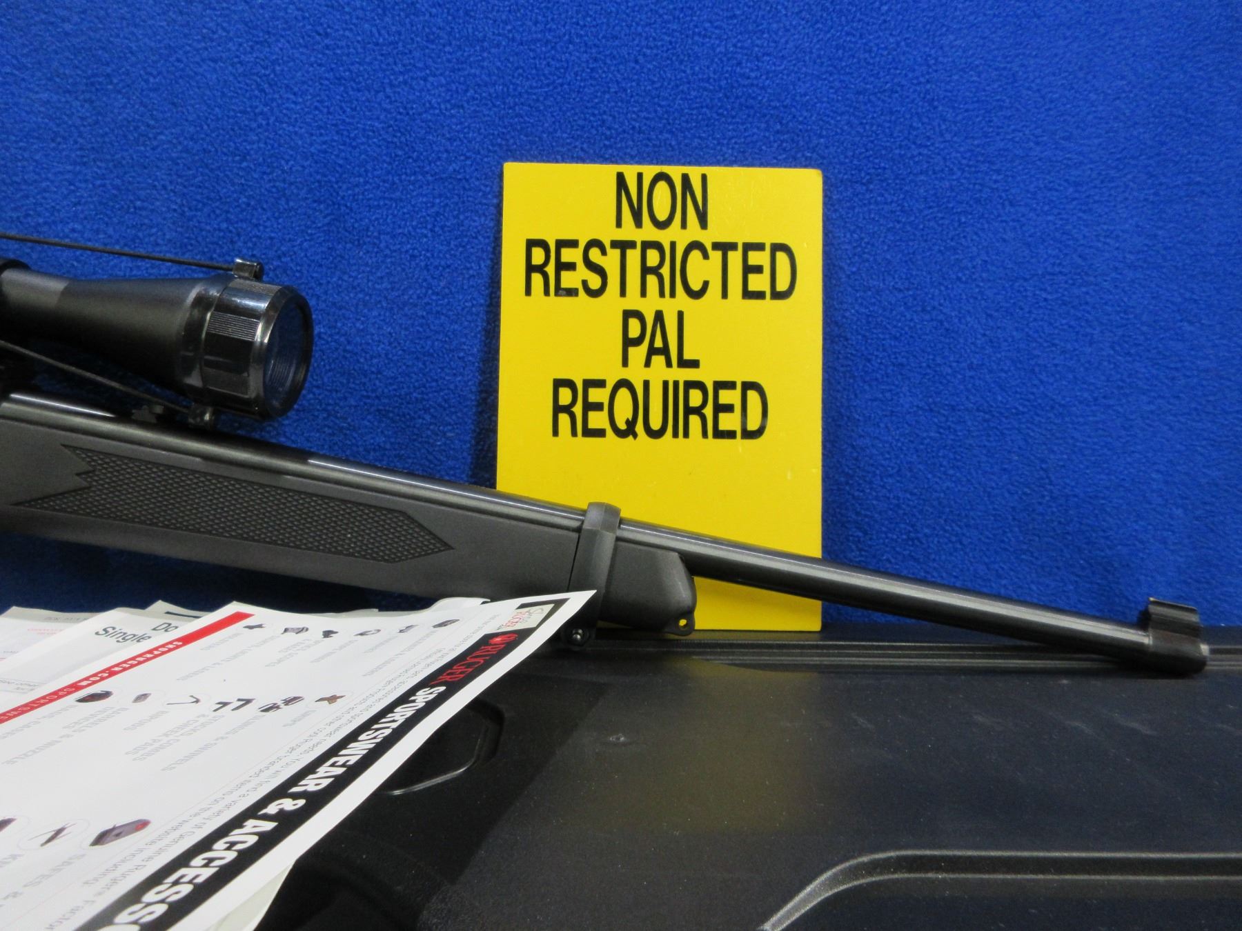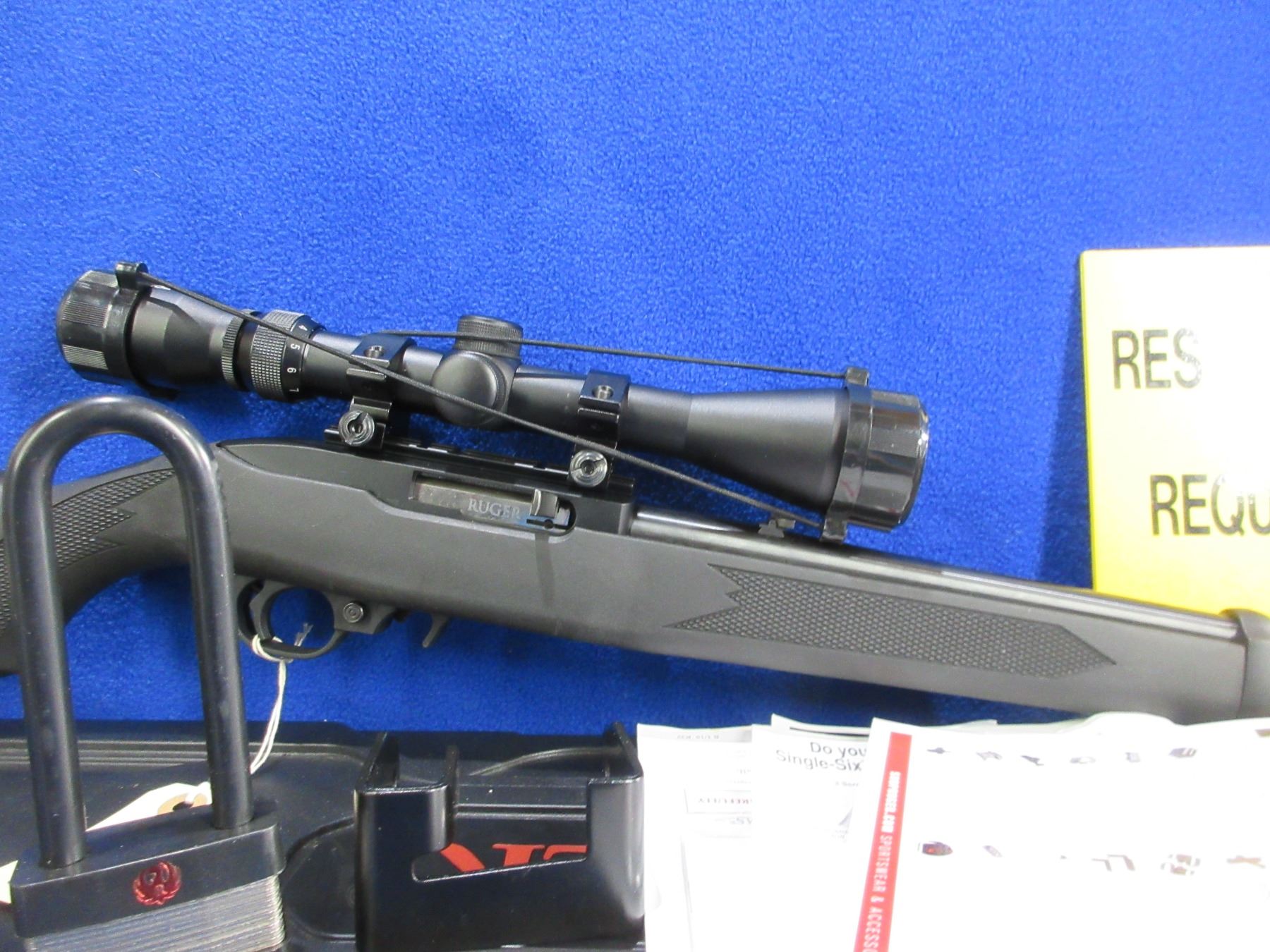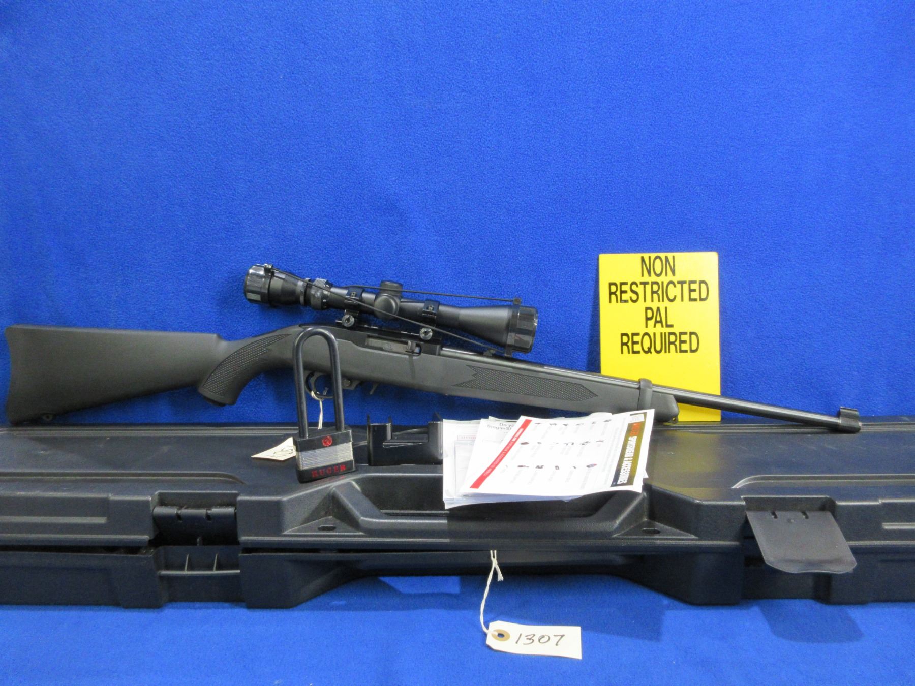 Non-Restricted - Ruger Model 10/22 in 22 LR - This is a semi-auto rifle with removable magazine, action appears to be in very good working order. Barrel is 18", rifling is very good, bluing is very good, has both sights and Veridian Eon 3-9x40 scope with lens covers - appears clear, duplex reticle, synthetic stock is good to very good with minor usage marks, length of pull is 13 1/2", butt plate good, comes with Ruger hard case, paperwork and ruger padlock. Ser # OO15-52109