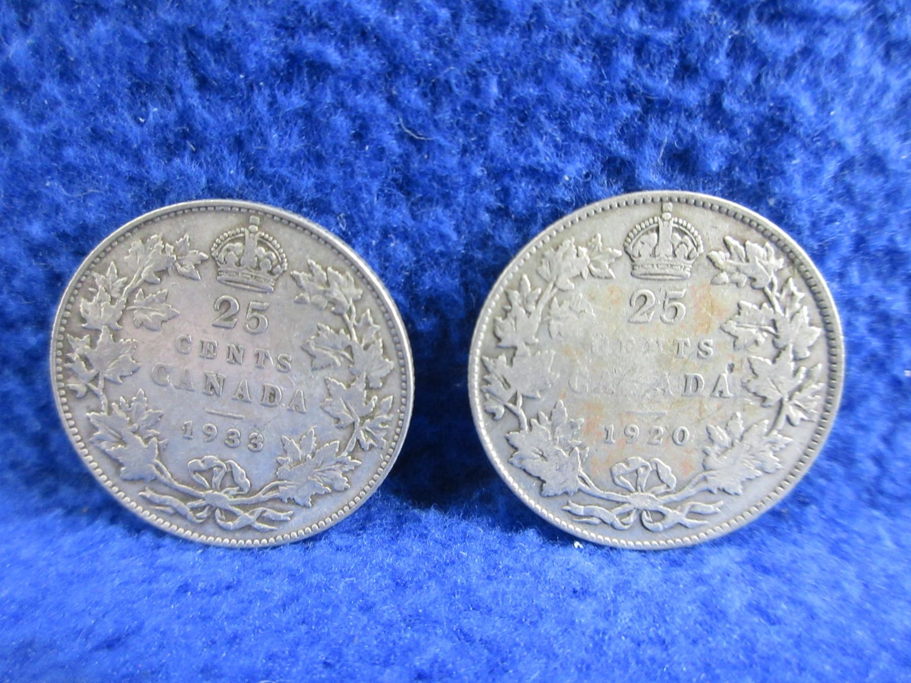 2 Canadian 25 Cent Coins - .800 Silver - 1920, 1933