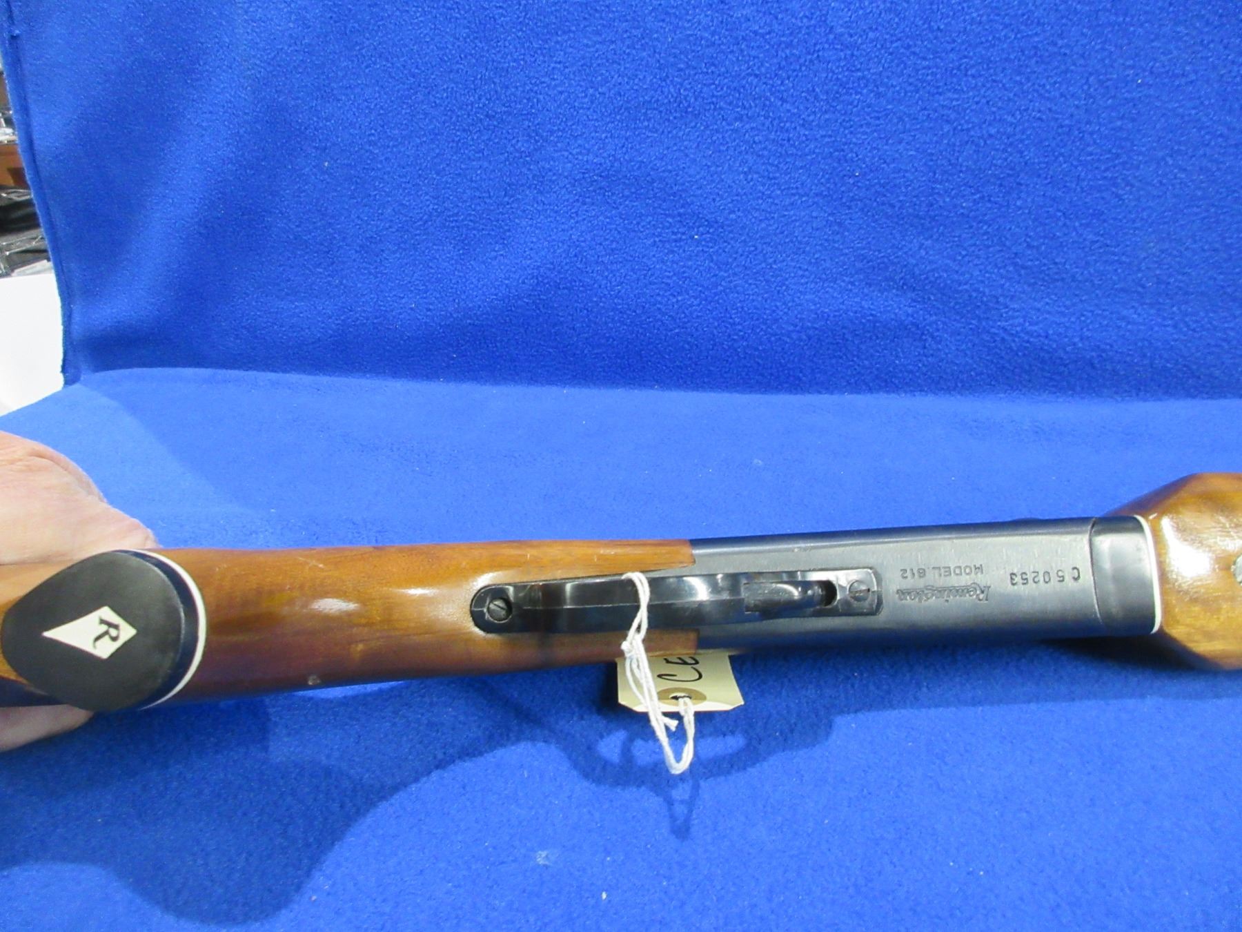 Non-Restricted - Remington Model 812 in 12 Ga. 2 3/4" Full - This is a tip up single shot shotgun, action is tight and appears to be in good to very good working order. Barrel is 30", bore is good to very good, bluing is good to very good, has bead front sight, stock is good to very good with usage marks, forearm is good to very good with usage marks, length of pull is 14 1/4", butt plate good, comes with swivels. Ser # C50253