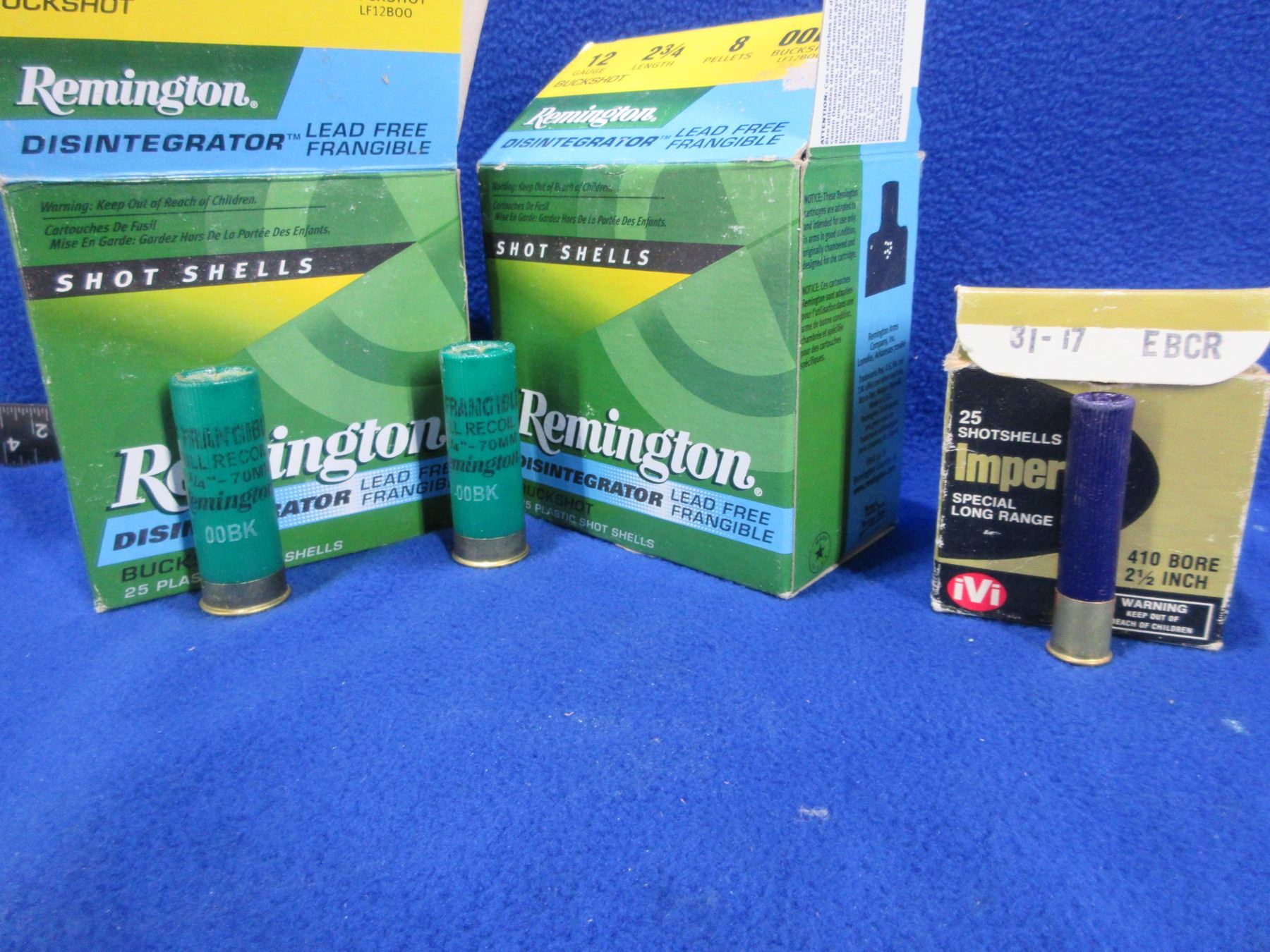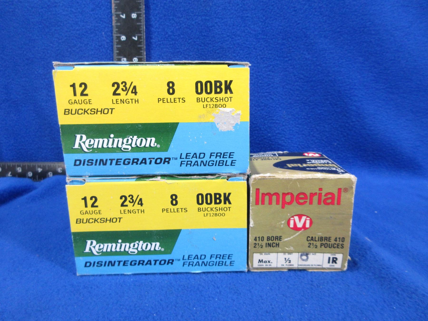 12 Ga. & 410 Ga. Shotshells (Pick Up or Ship by UPS Only) - 2 Boxes of 25 (12 Ga. 2 3/4" 00 Buck Remington), Box of 8 (410 Ga. 2 1/2" 6 Shot Imperial)