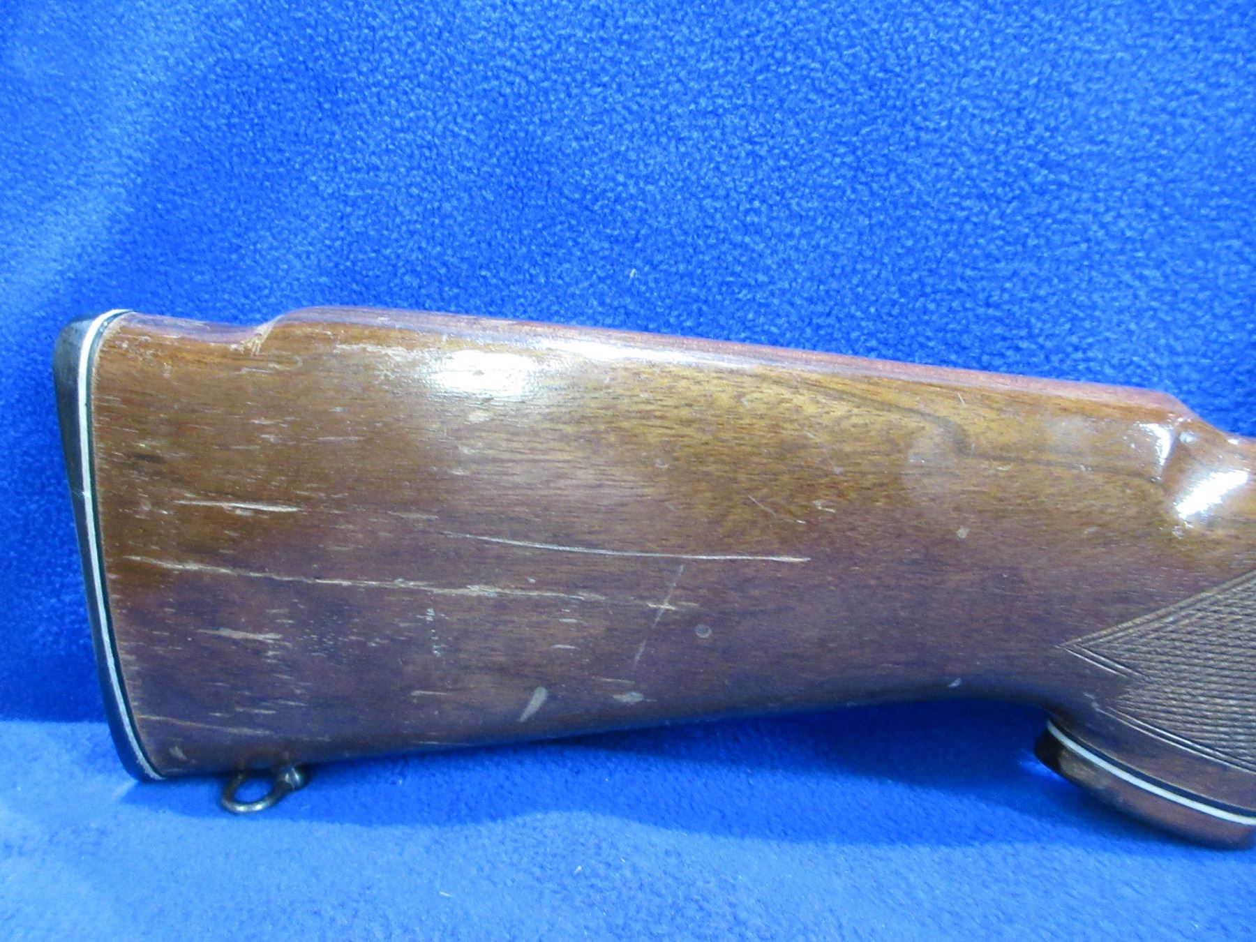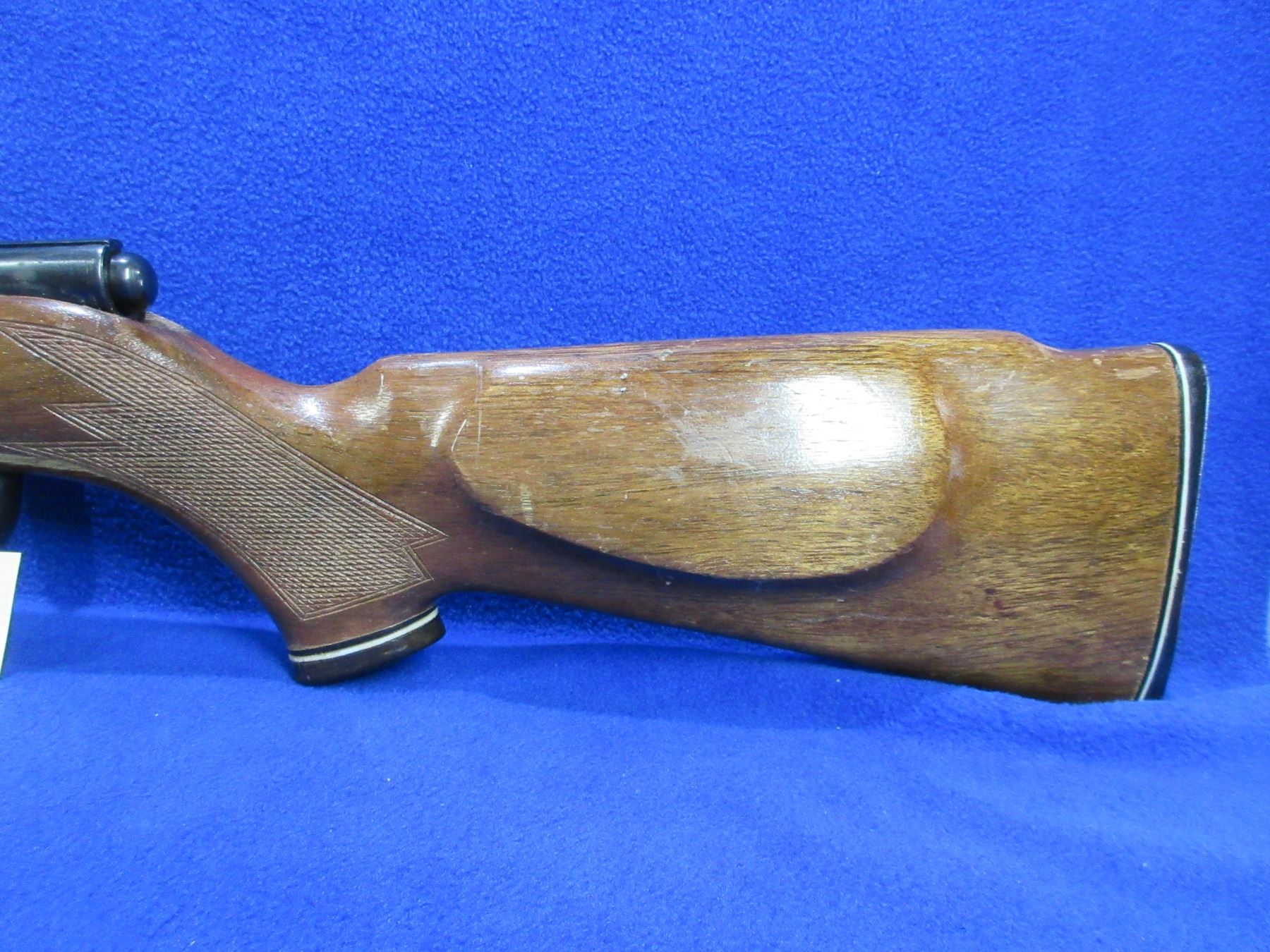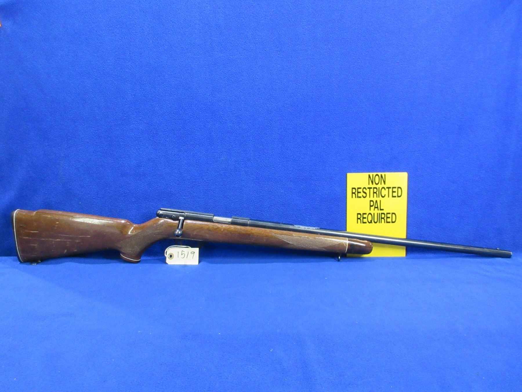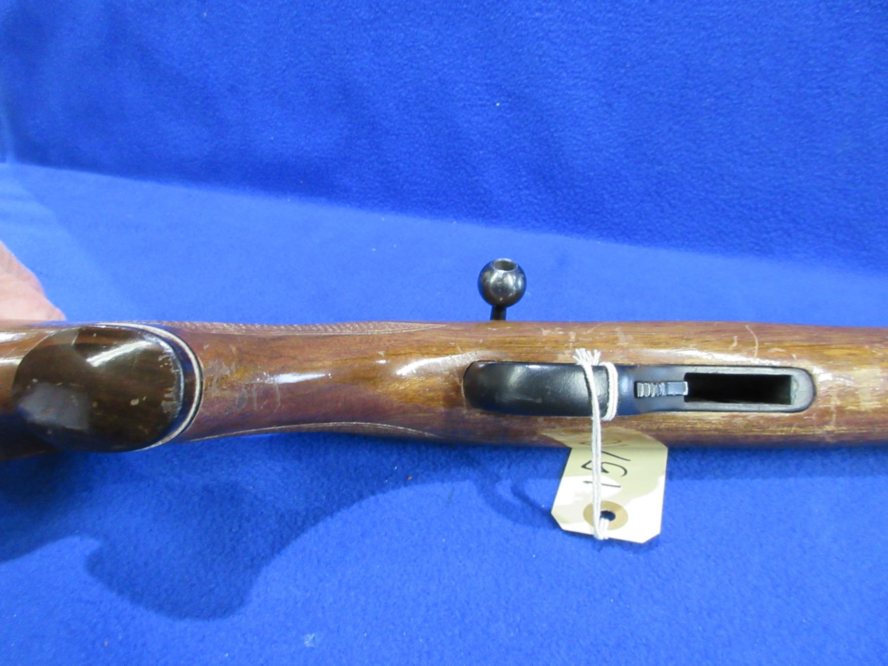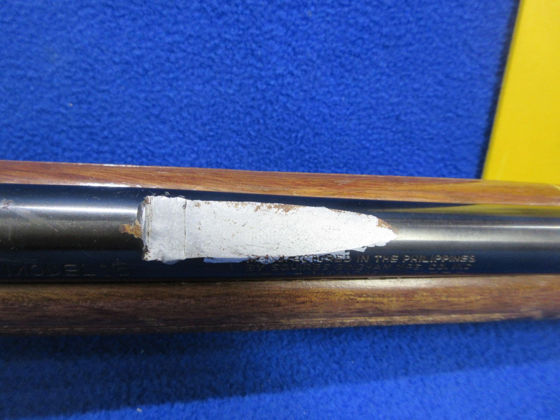 Non-Restricted - Squires Bingham Model 15 in 22 WMR - This is a bolt action rifle with removable magazine (Magazine is Missing), action appears to be in good to very good working order. Barrel is 24", rifling is good to very good, bluing is fair to good as barrel has been filed by rear sight dovetail, has front sight, missing rear sight, stock is good with many usage marks and some finish flaking, length of pull is 14", butt plate good, comes with swivels. Ser # 371067