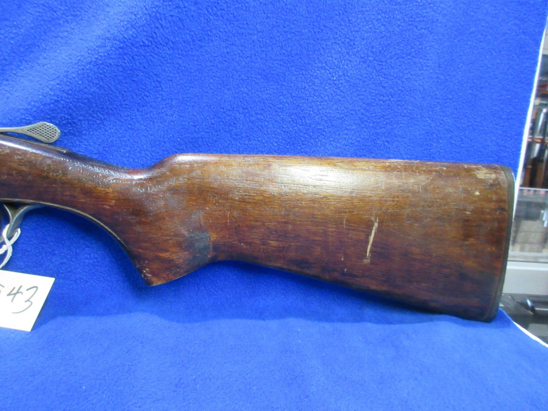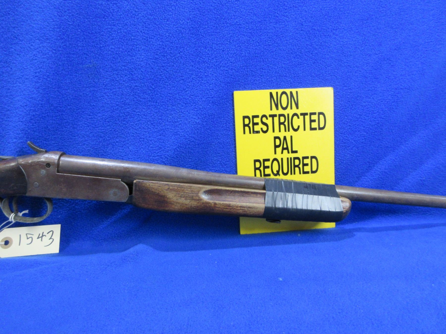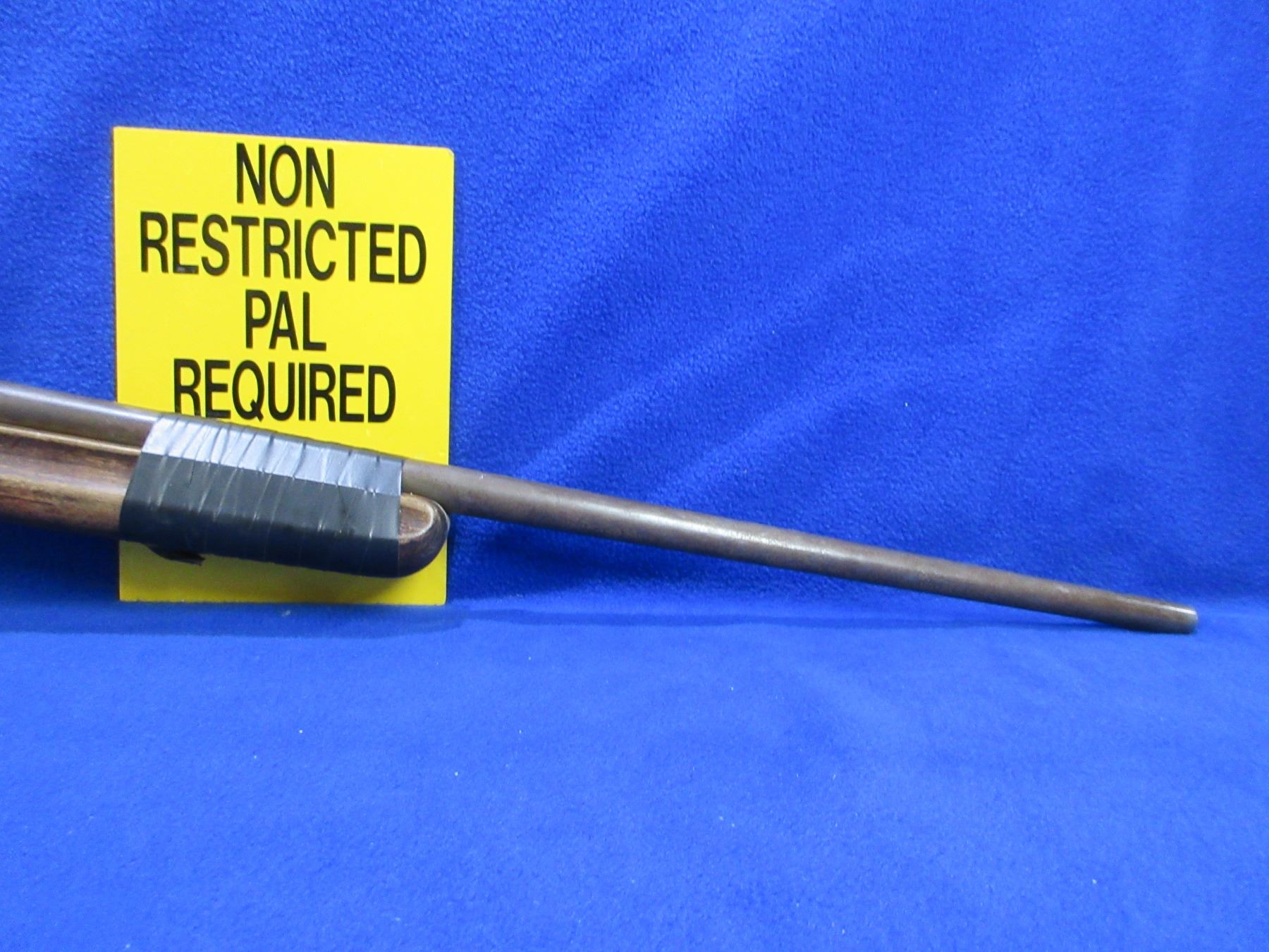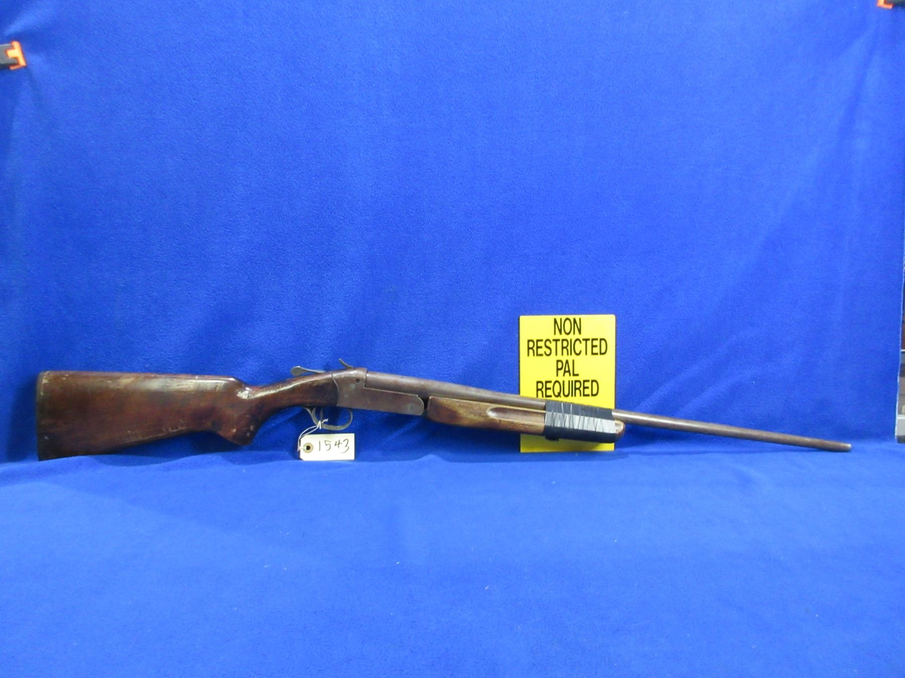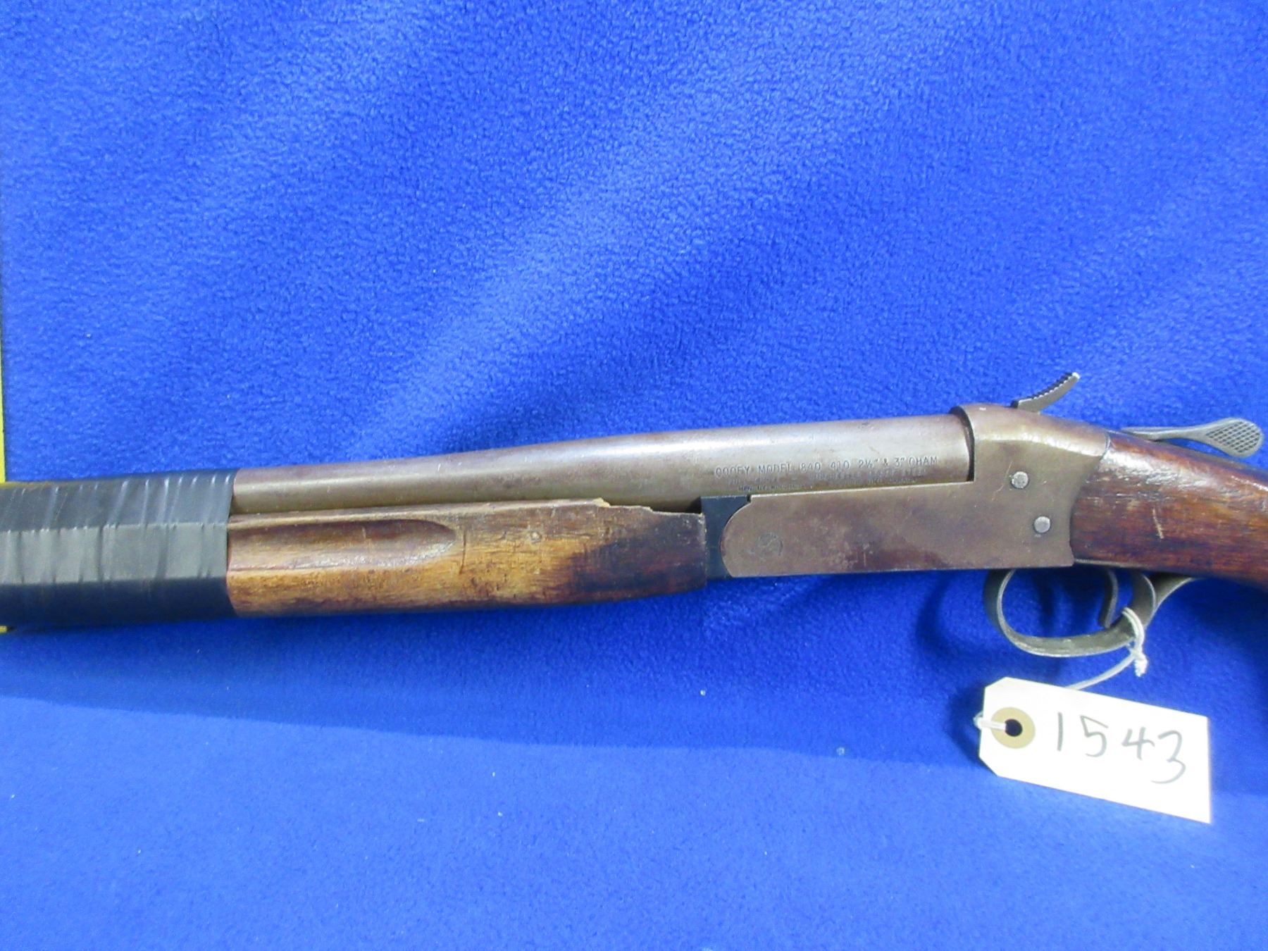 Non-Restricted - Cooey Model 840 in 410 Ga. 2 1/2" & 3" - This is a tip up single shot shotgun, action is tight and appears to be in good working order but the forearm is taped on and the spacer is broken. Barrel is 26", bore is good to very good, bluing is gone, has no sight, stock is good with many usage marks, forearm is good with many usage marks and is taped to barrel, length of pull is 14", butt plate is good. Ser # 902796