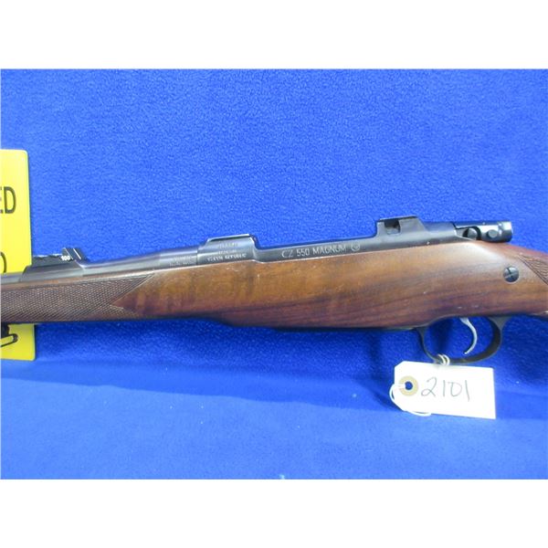 Non-Restricted - CZ Model 550 Magnum in 375 H&H Mag - This is a bolt action rifle with floor plate magazine and single set trigger, action appears to be in good to very good working order. Barrel is 25", rifling is good to very good, bluing is good to very good, has both sights, stock is good to very good with some usage marks, length of pull is 14 1/2", rubber recoil pad is good, comes with swivels. Ser # A138561