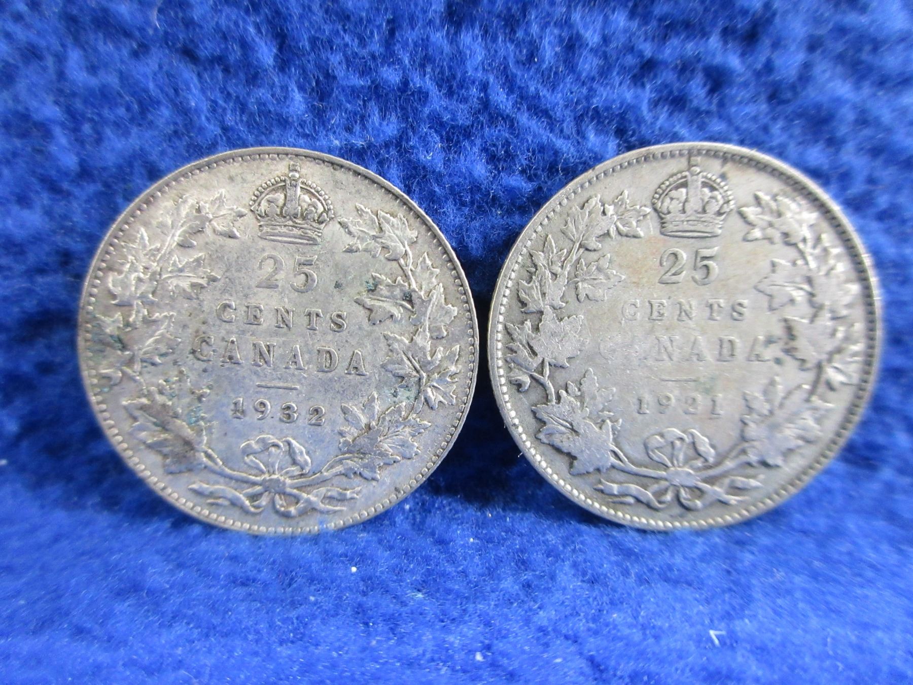 2 Canadian 25 Cent Coins - .800 Silver - 1921, 1932