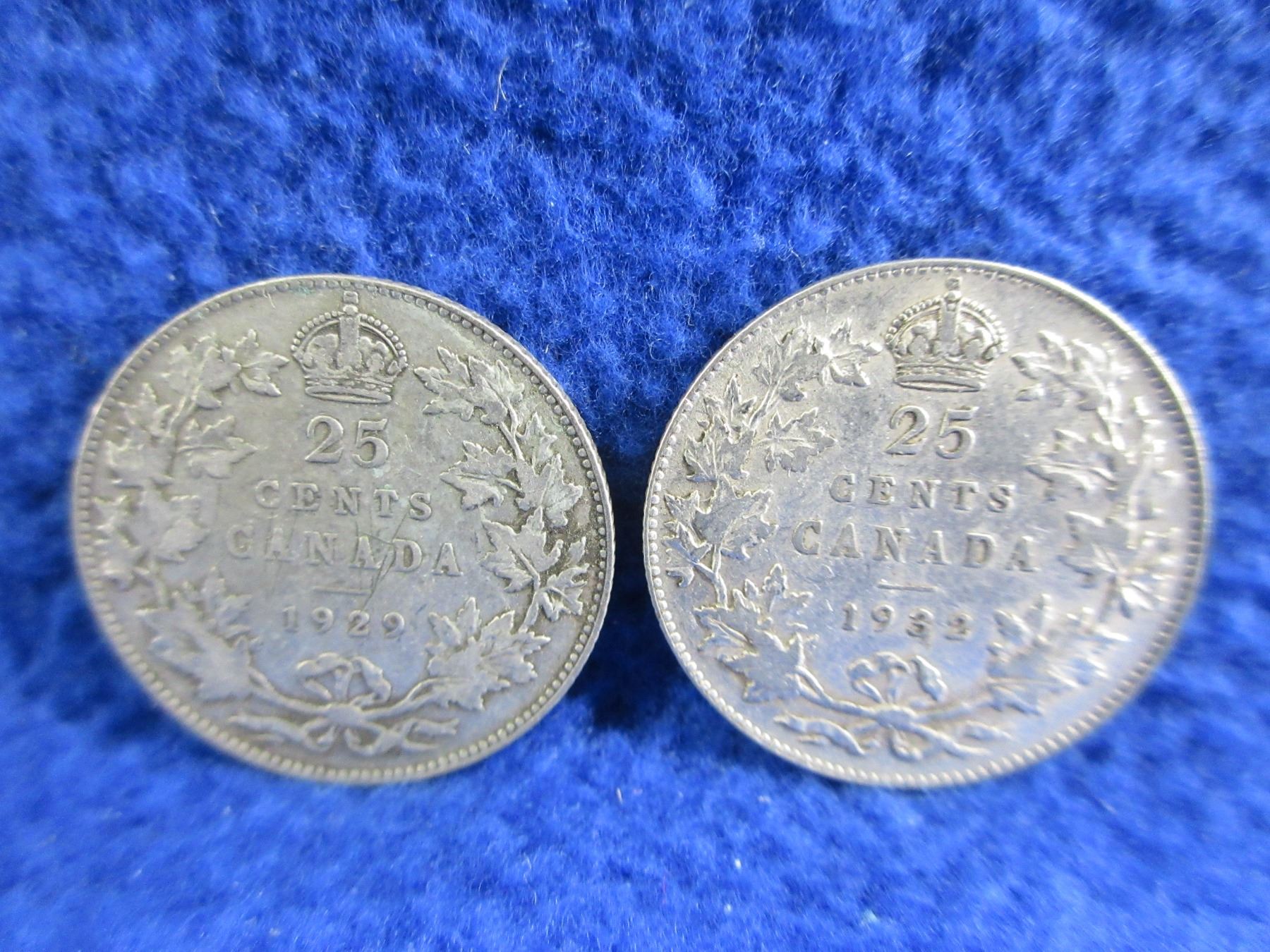 2 Canadian 25 Cent Coins - .800 Silver - 1929, 1932