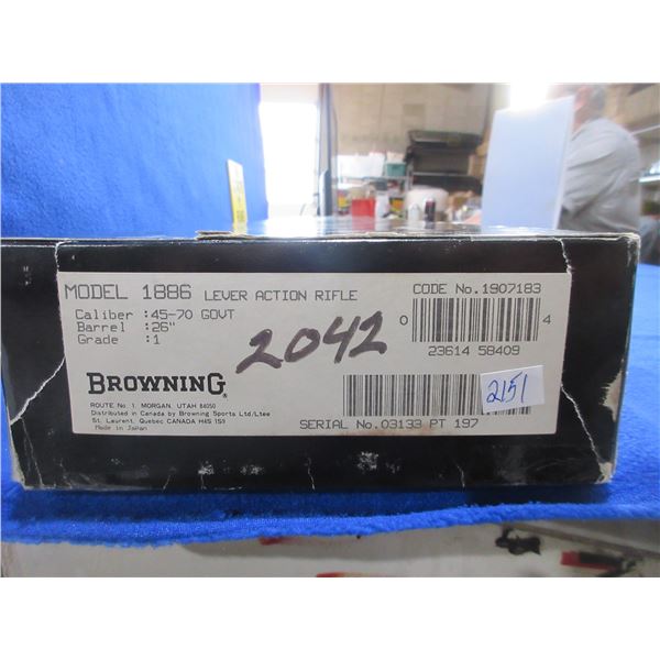 Non-Restricted - Browning Model 1886 in 45-70 GOVT - Made in 1986, this is a lever action rifle with tube magazine, action appears to be in very good working order. Barrel is 26", rifling is very good, bluing is good to very good, has both sights, stock and forearm are good to very good with handling marks, length of pull is 13", crescent metal plate very good. Comes in original box, but is missing paperwork. Ser # 03133PT197