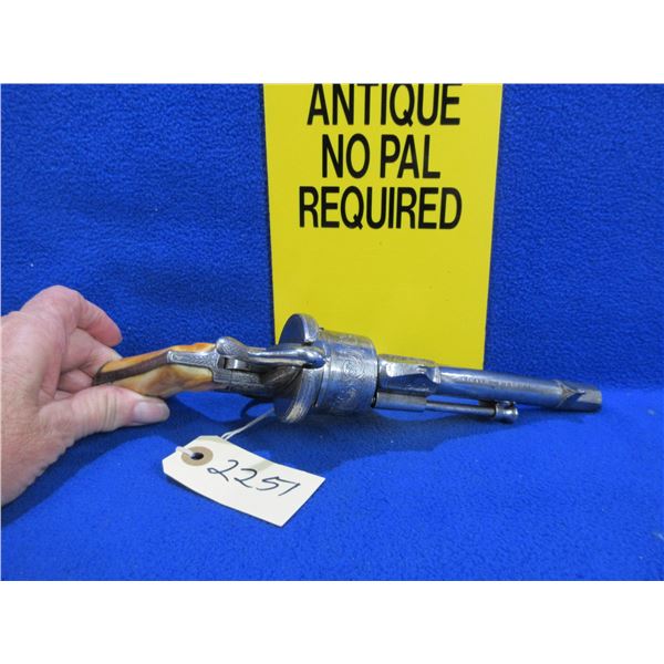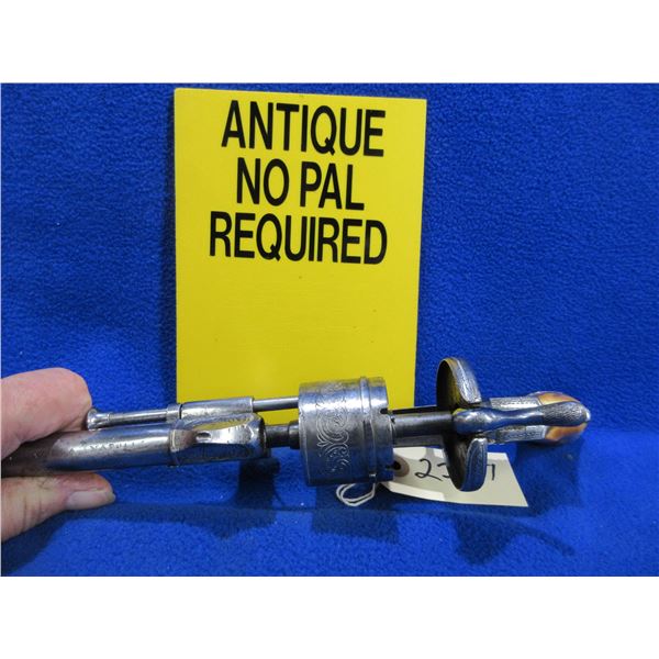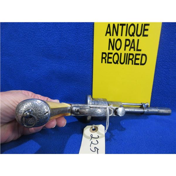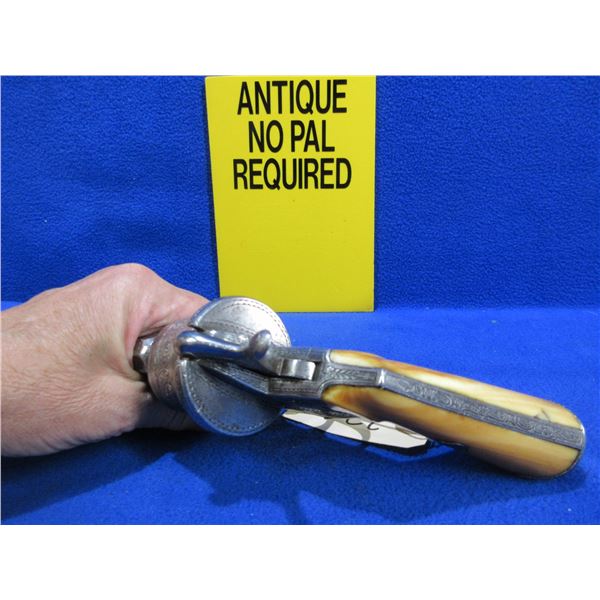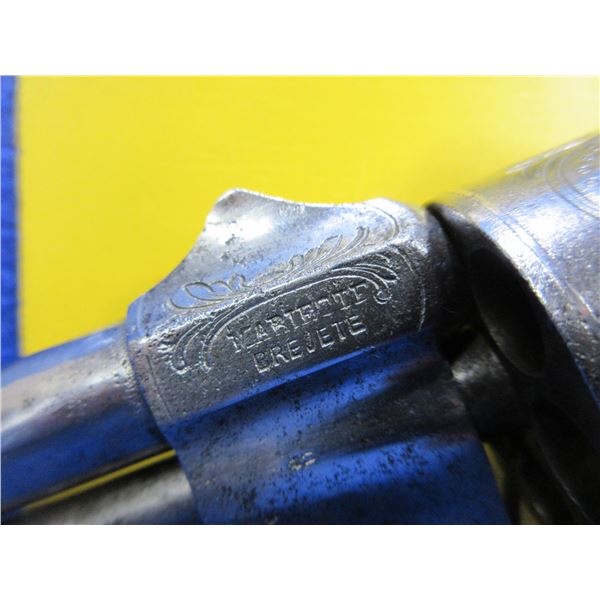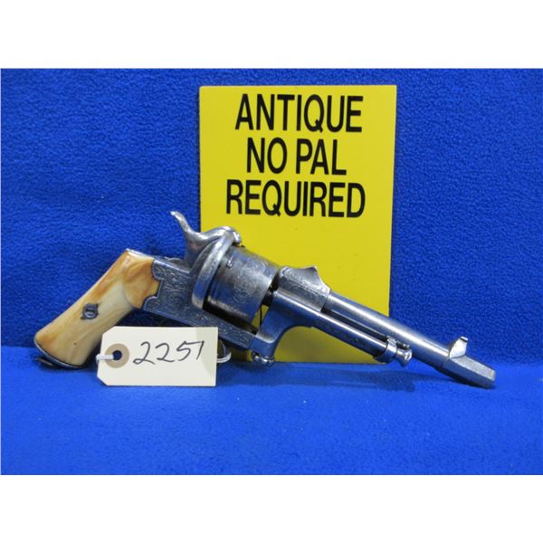 Antique - No PAL Required - Mariette/Merolla Brevete in 12MM Pinfire Slide Lock Revolver - This a nicely engraved rare slide lock, double action, six shot revolver. Action appears to be in good to very good working order. Barrel is 5 1/2", rifling is good for age, finish is good to very good for age, has both sights, bone grips are good to very good for age. Stamping on left side close to cylinder reads "Mariette over Brevete". Ser # None