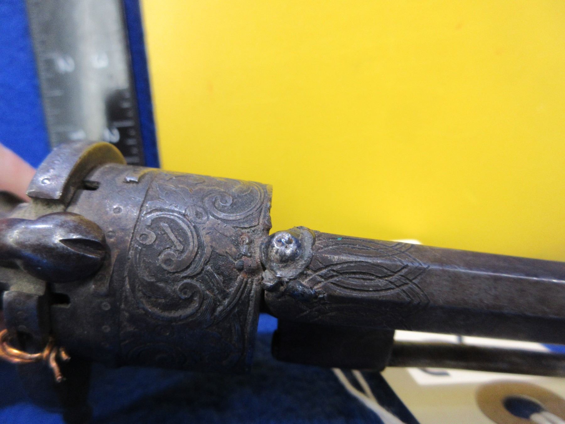 Antique - No PAL Required - Unknown Pinfire in 7MM - This six shot pinfire revolver appears to be French or Belgian, action is in non working order as cylinder has been welded to the barrel at the top. Barrel is 3 1/2". rifling appears good for age, bluing is mostly gone but action and cylinder are engraved, has both sights, wood grips are good for age. Ser # None