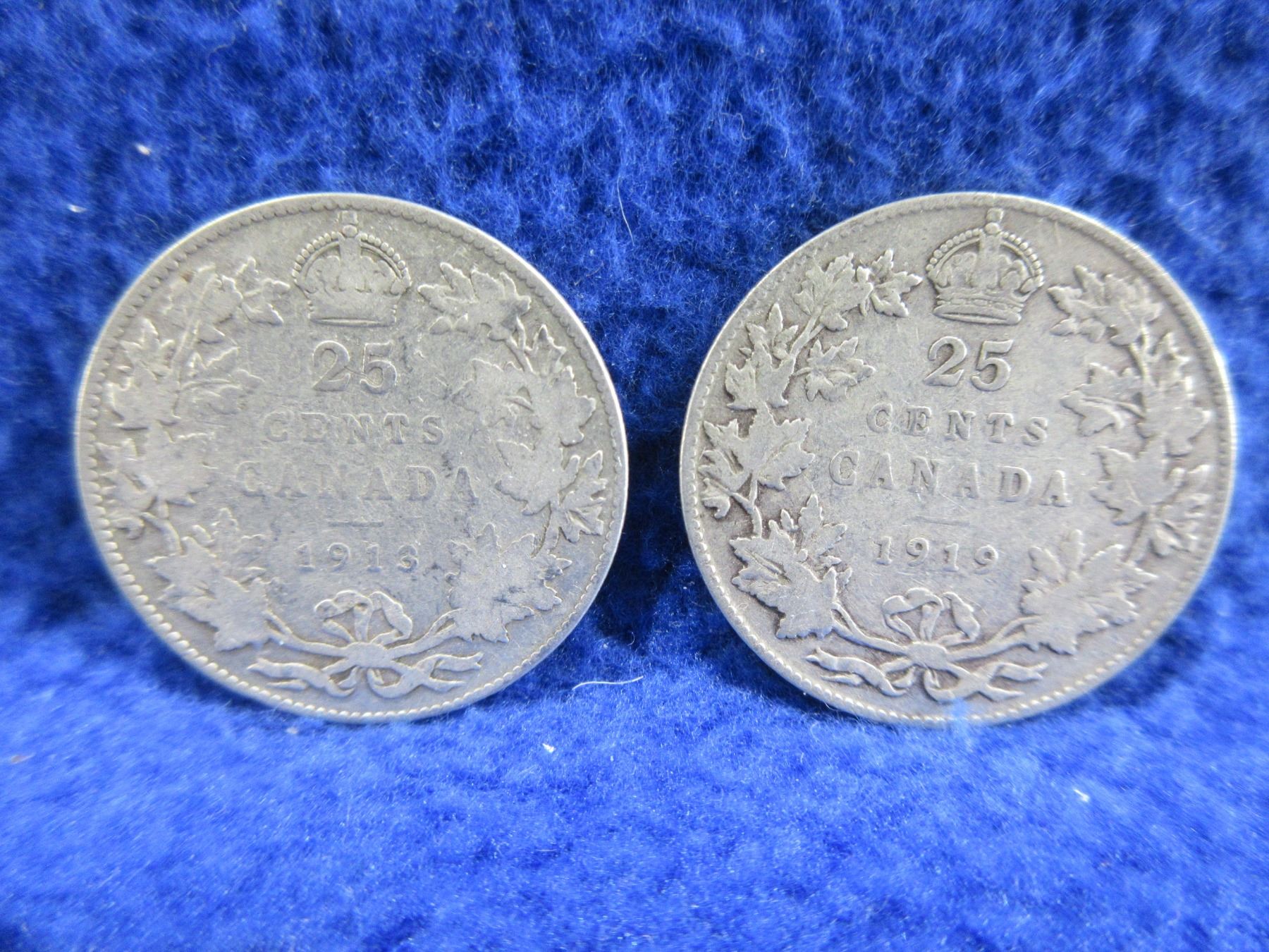 2 Canadian 25 Cent Coins - .925 Silver - 1913, 1919