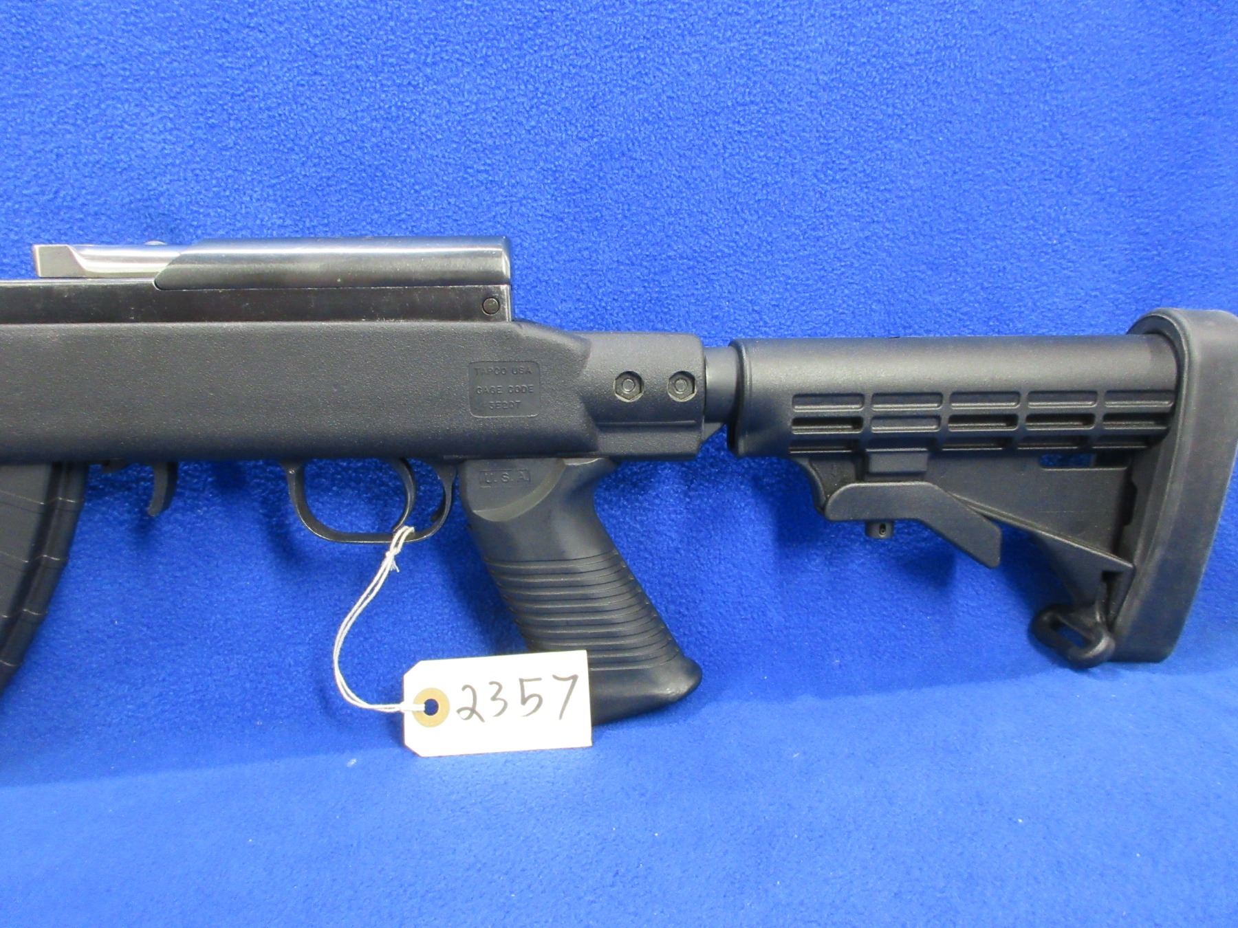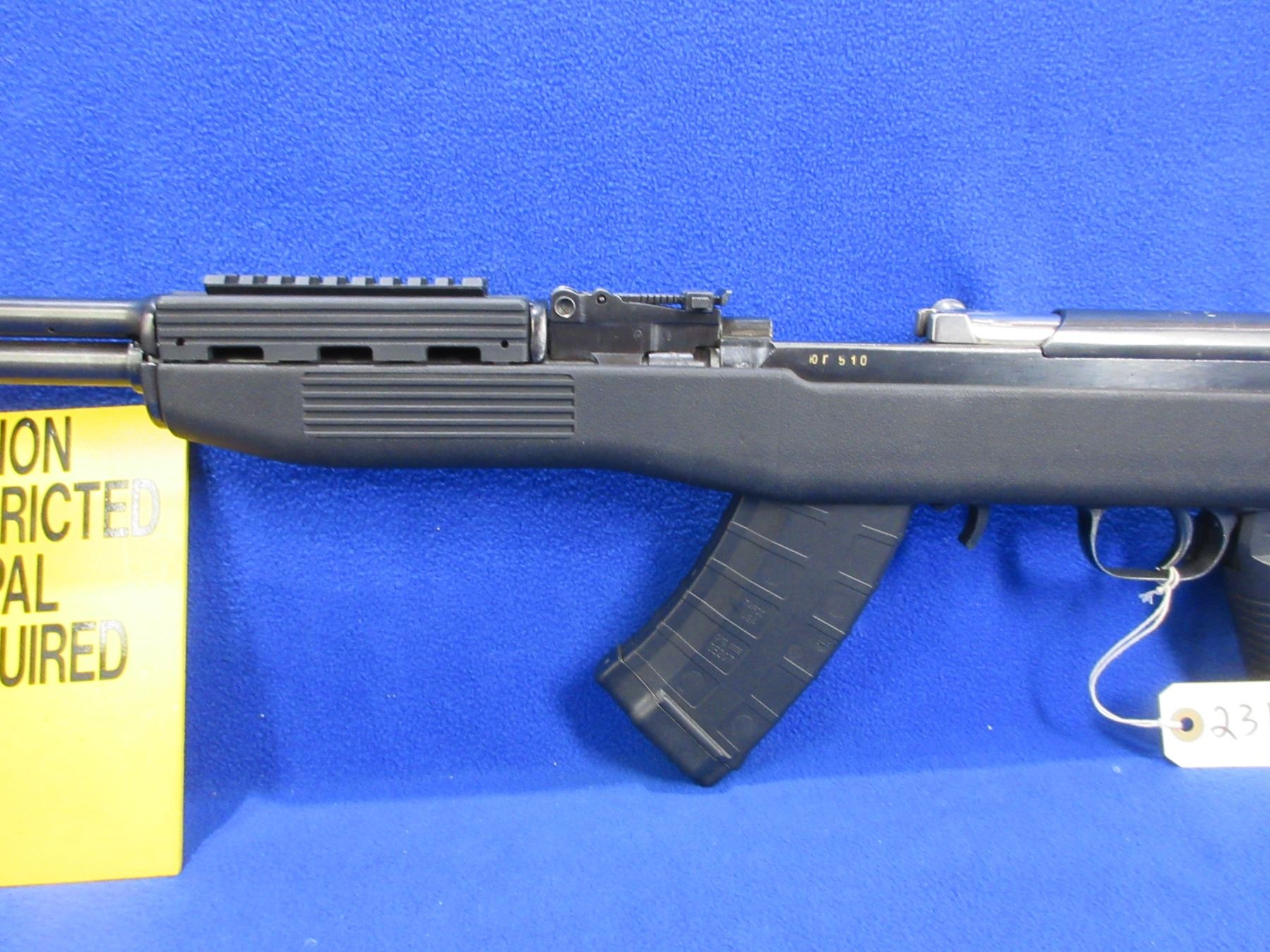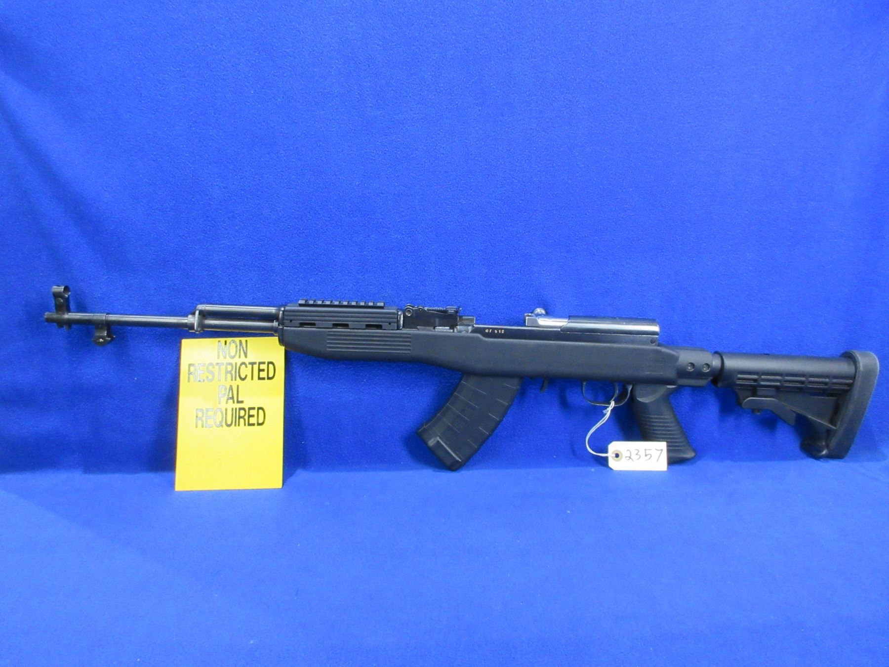 Non-Restricted - SKS Russian in 7.62X39 - This is a semi-auto rifle with removable magazine (pinned to 5), action appears to be in good to very good working order. Barrel is 20 1/2", rifling is good to very good, bluing is good to very good, has both sights, Tapco adjustable stock is good to very good, length of pull is 11 to 15", butt plate good. Ser # 510