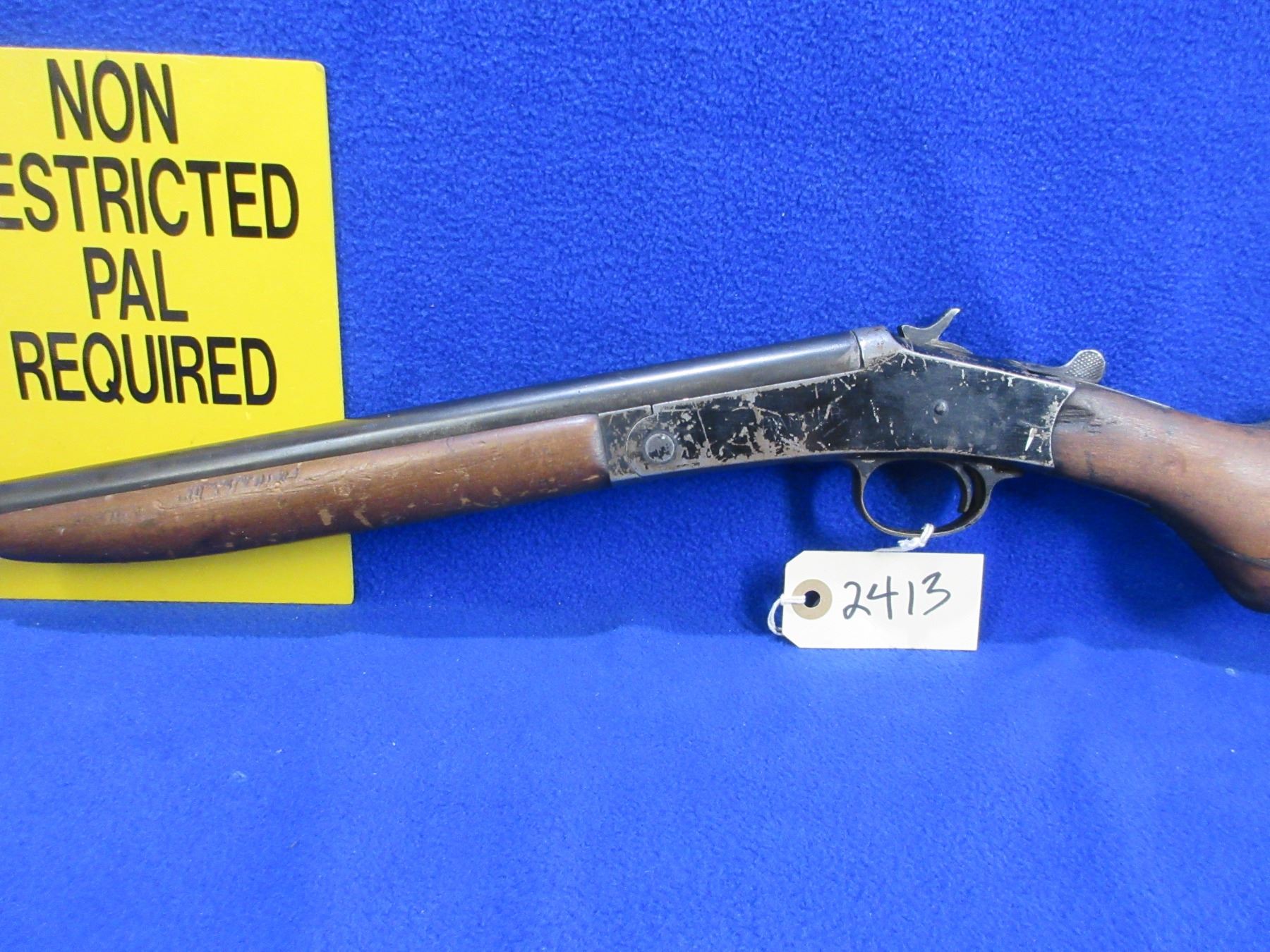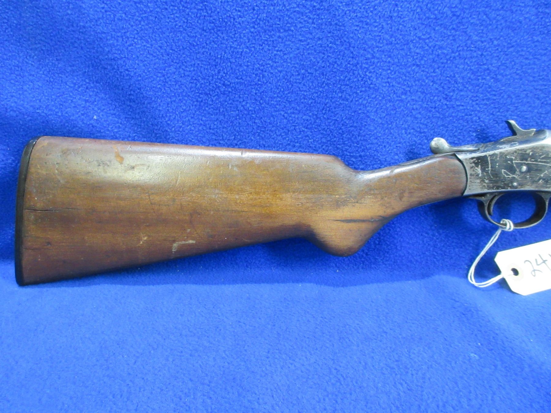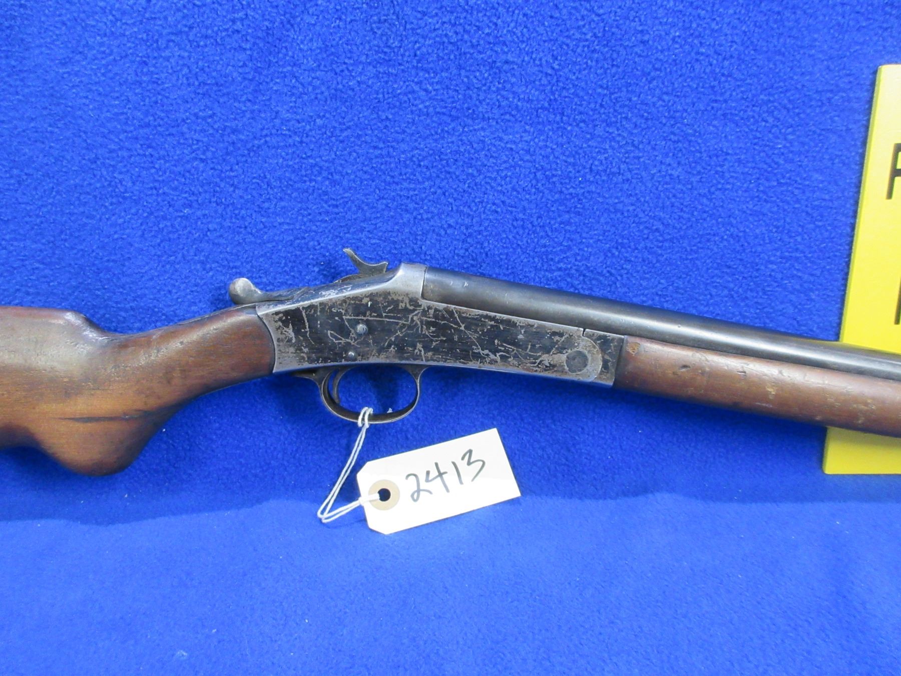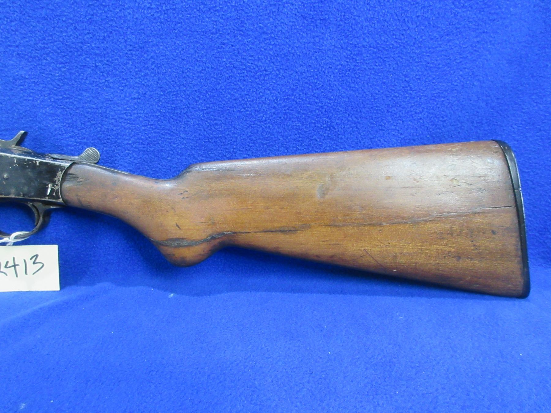 Non-Restricted - Ranger Model Camper in 410 Ga. 2 1/2" - This is a tip up single shot shotgun, action is tight and appears to be in working order but the latch mechanism is not working correctly. Barrel is 18 1/2", bore is fair to good, bluing is fair to good on the barrel but gone on the action, has no sight, stock is loose, has crack repairs and needs replaced, forearm is good with usage marks, length of pull is 13 3/4", butt plate good. Ser # 158819