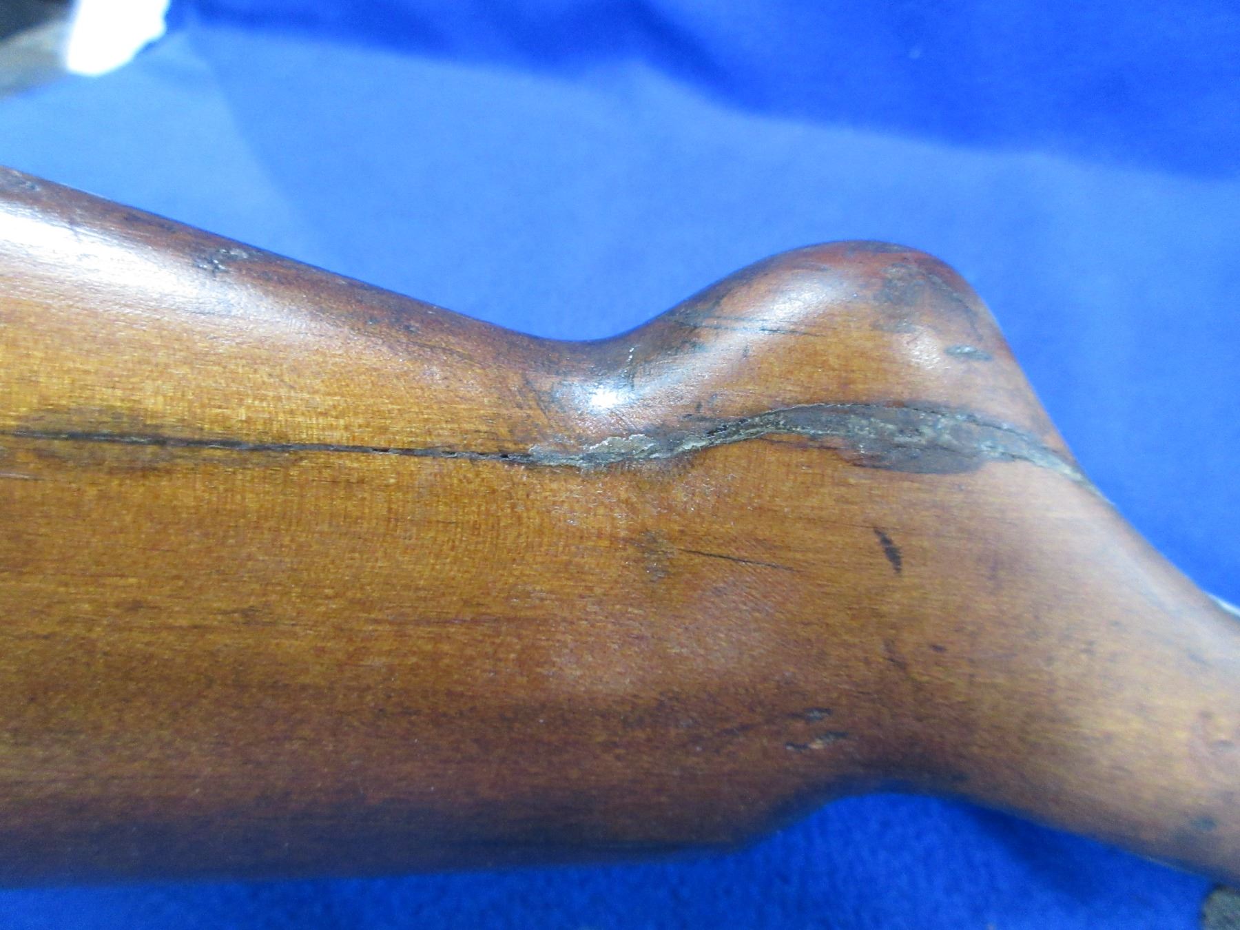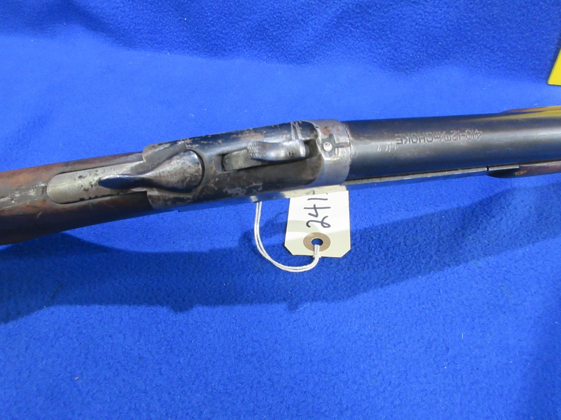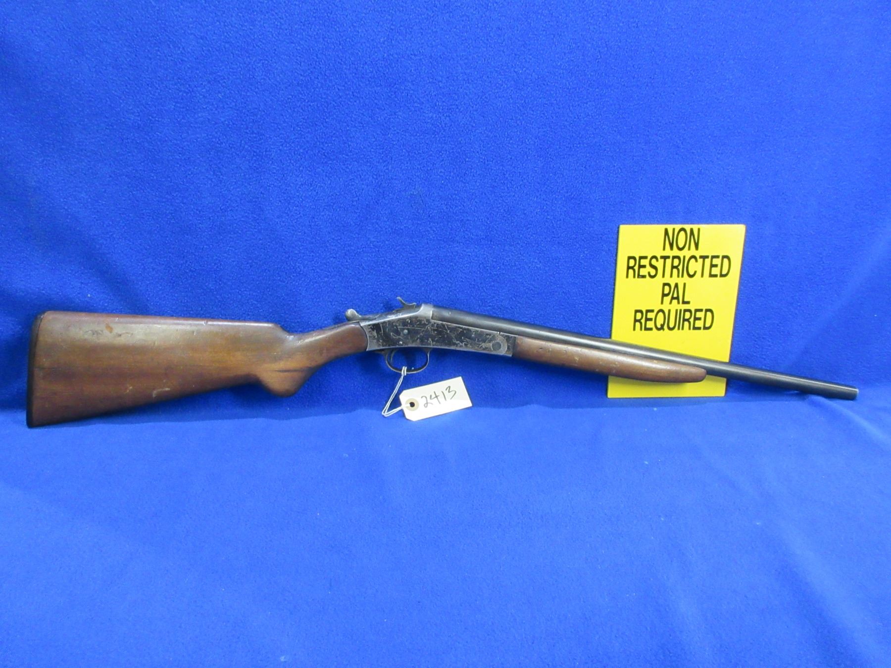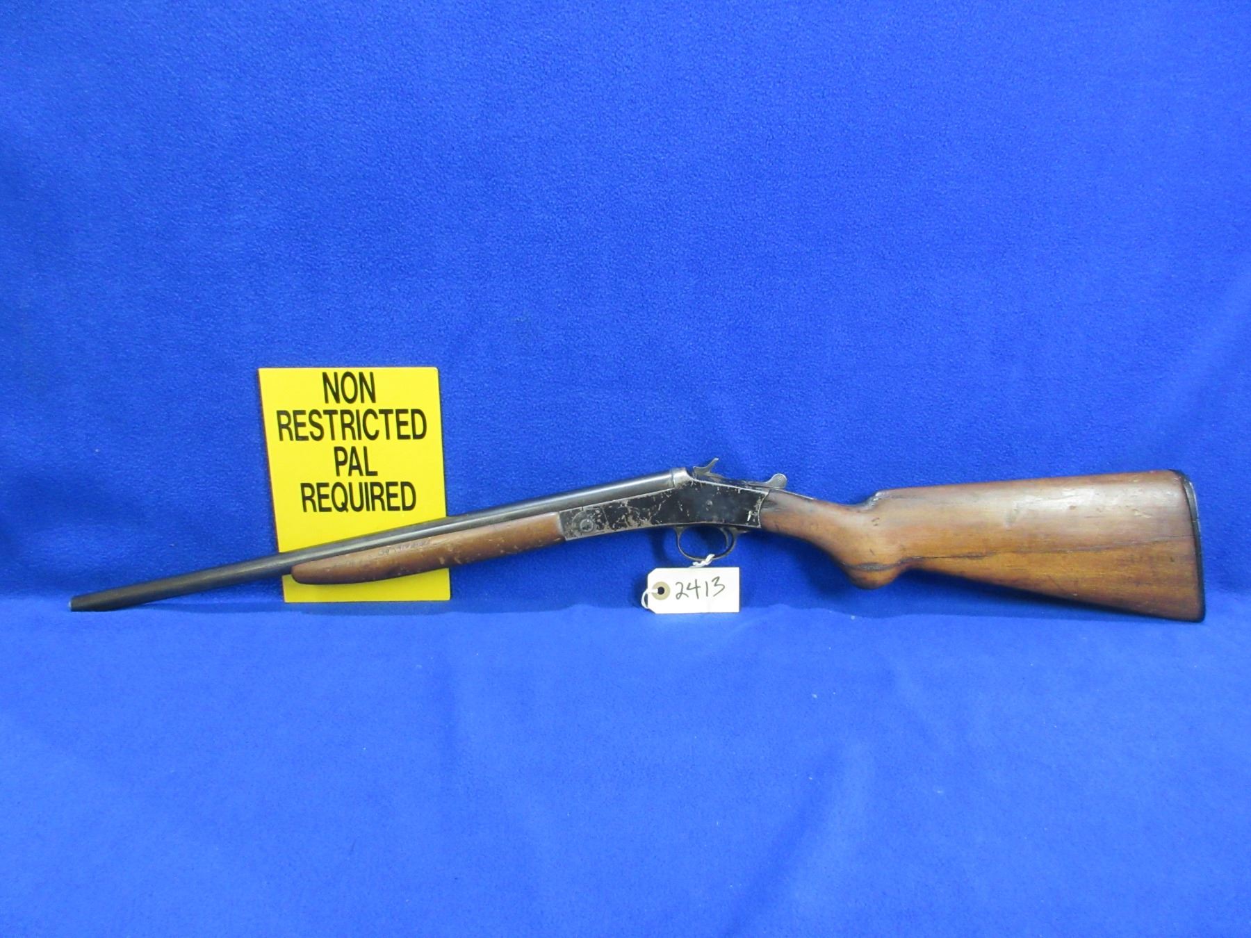 Non-Restricted - Ranger Model Camper in 410 Ga. 2 1/2" - This is a tip up single shot shotgun, action is tight and appears to be in working order but the latch mechanism is not working correctly. Barrel is 18 1/2", bore is fair to good, bluing is fair to good on the barrel but gone on the action, has no sight, stock is loose, has crack repairs and needs replaced, forearm is good with usage marks, length of pull is 13 3/4", butt plate good. Ser # 158819
