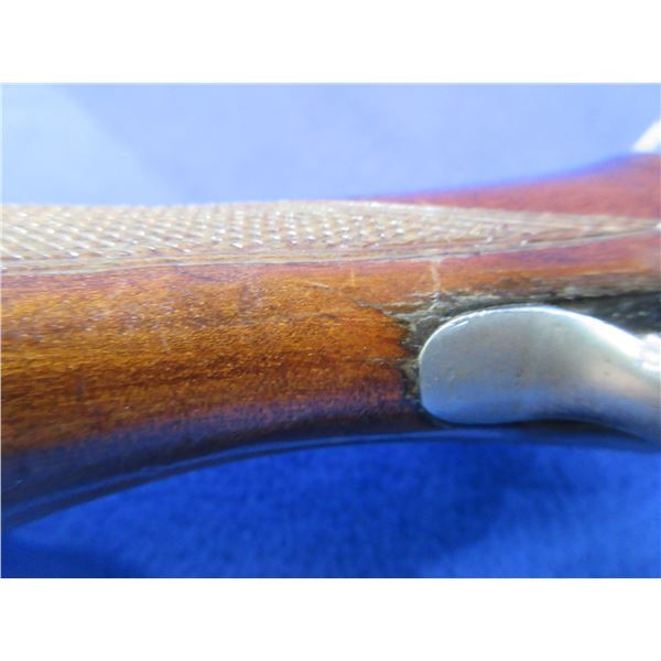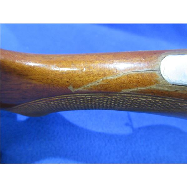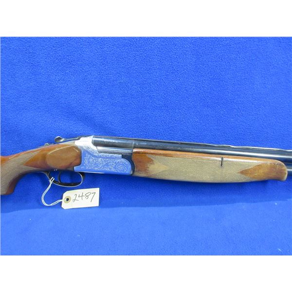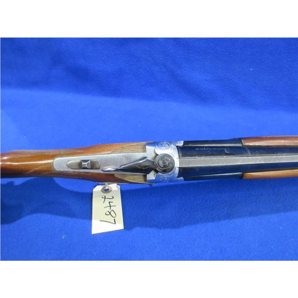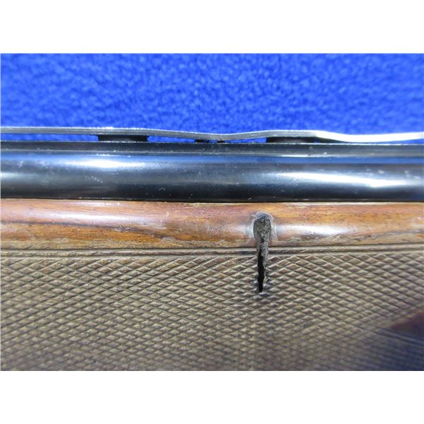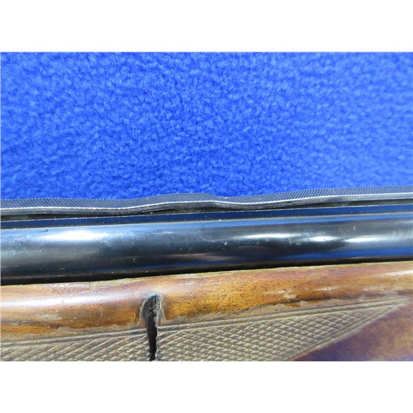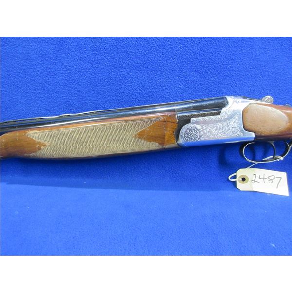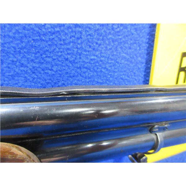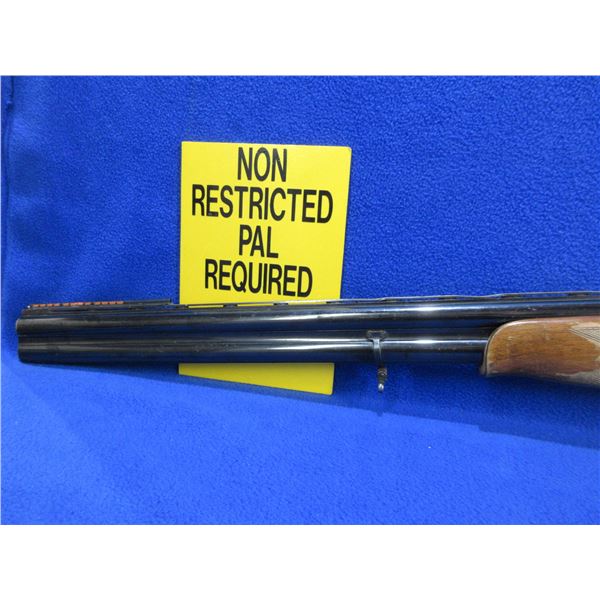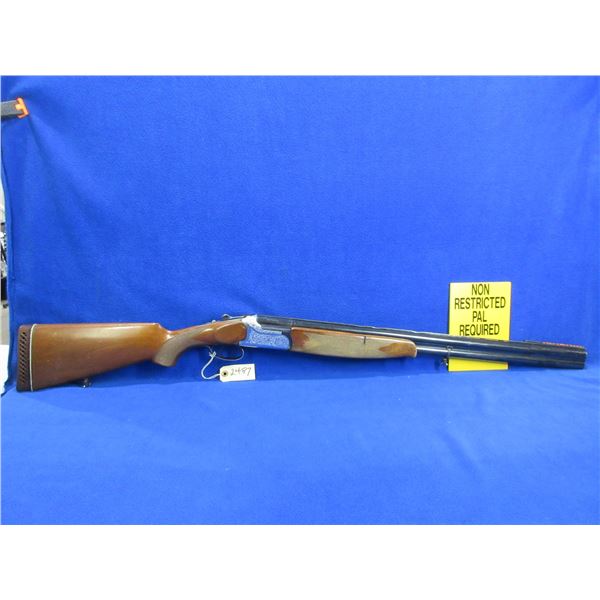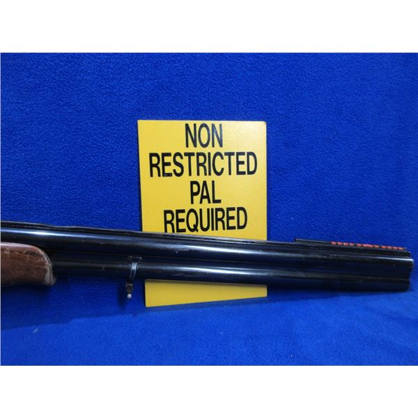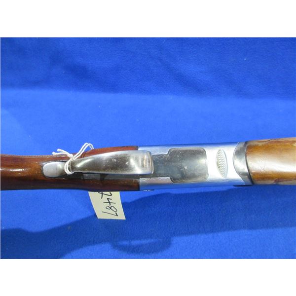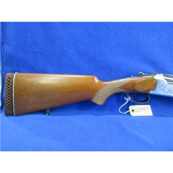 Non-Restricted - Lanber Model Ibargun in 12 Ga. 2 3/4" - This is an over/under shotgun, action is tight and appears to be in good working order. Vent rib barrels are 27 1/2". Vent rib has 5 dents on the top. Bores are good, bluing is good, has fiber optic front sight, stock is cracked in the wrist area top and bottom, forearm has a saw cut in it and finish is mostly gone, length of pull is 14 1/2", rubber recoil pad, comes with swivels. Ser # 118446
