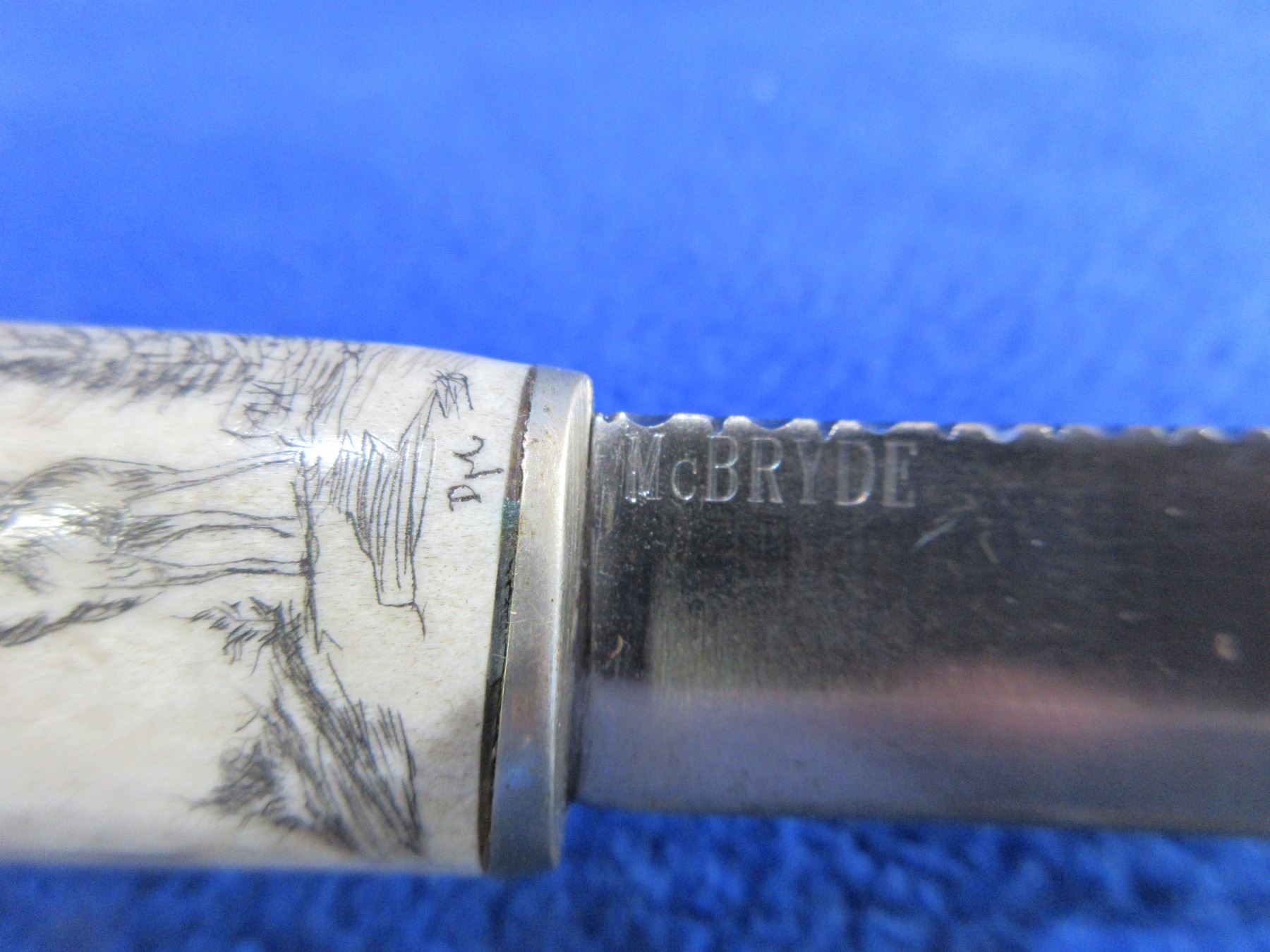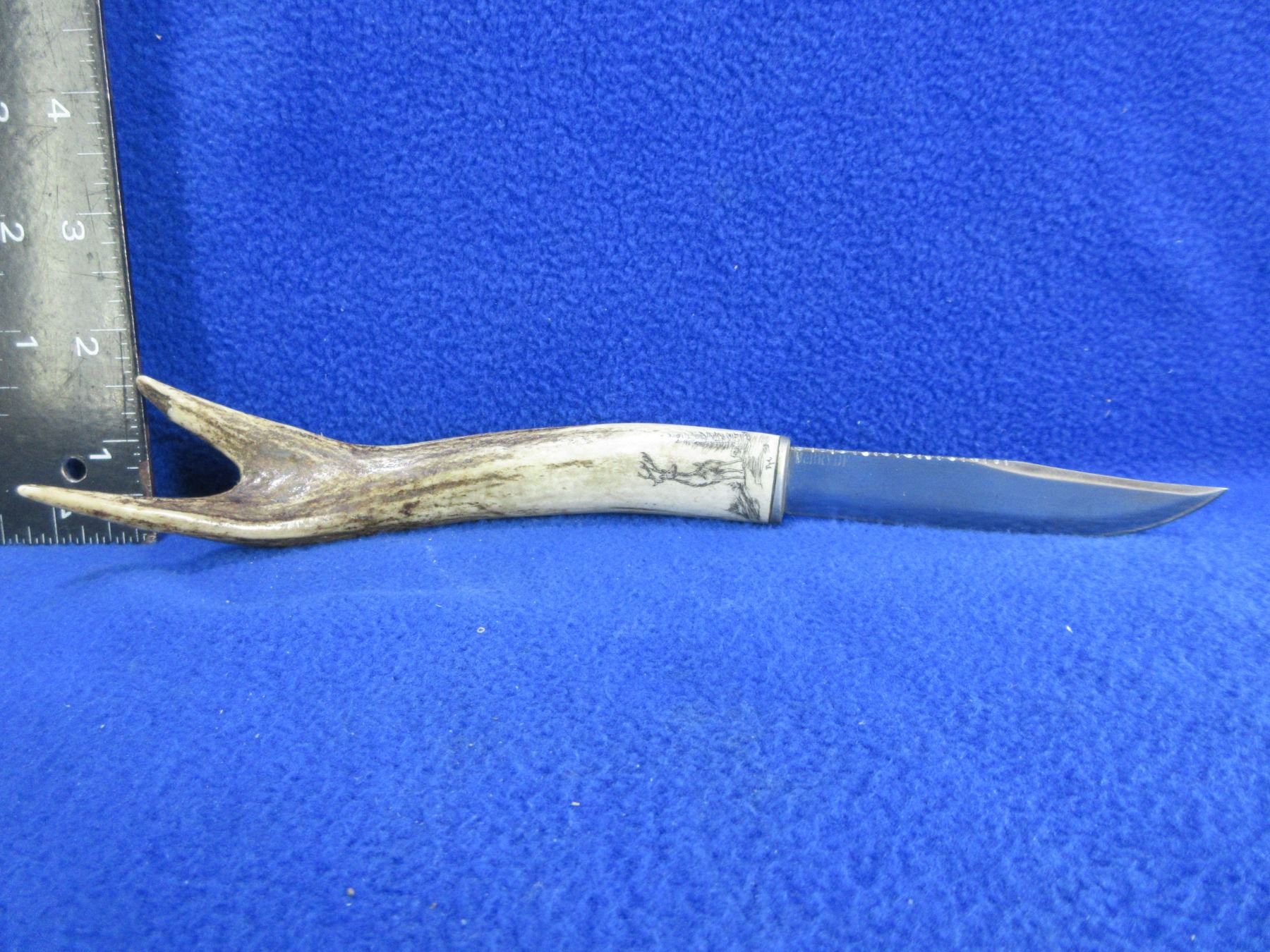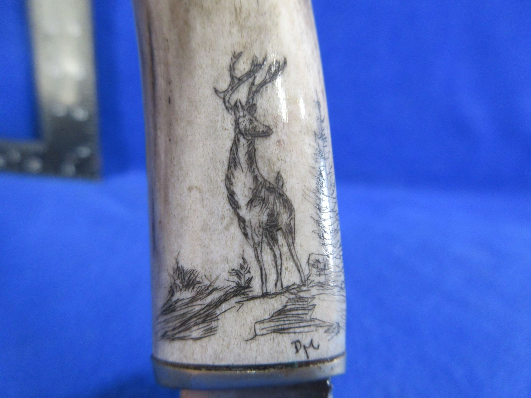 McBryde Fixed Blade Knife w/ Stag Handle - 3 5/8" Blade, 9 3/4" Total Length - Appears to be an Elk Nicely Etched on to Handle