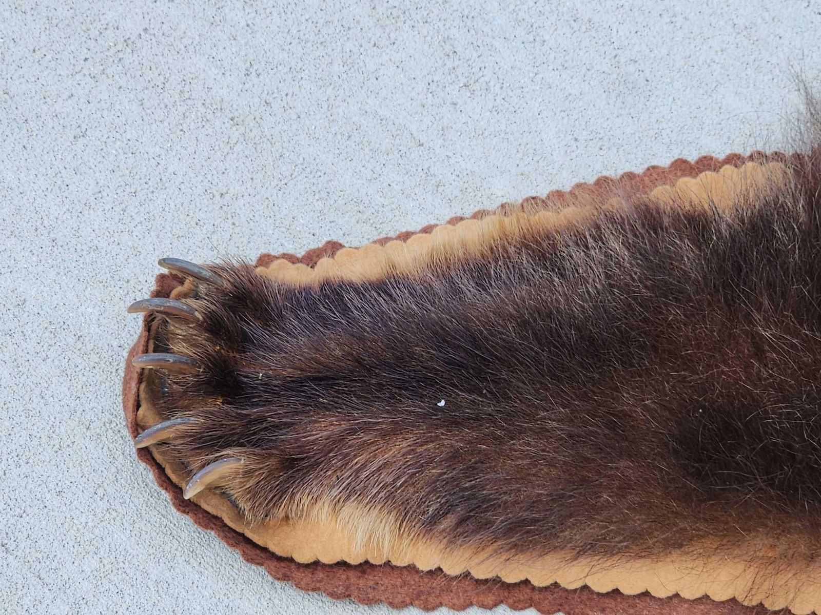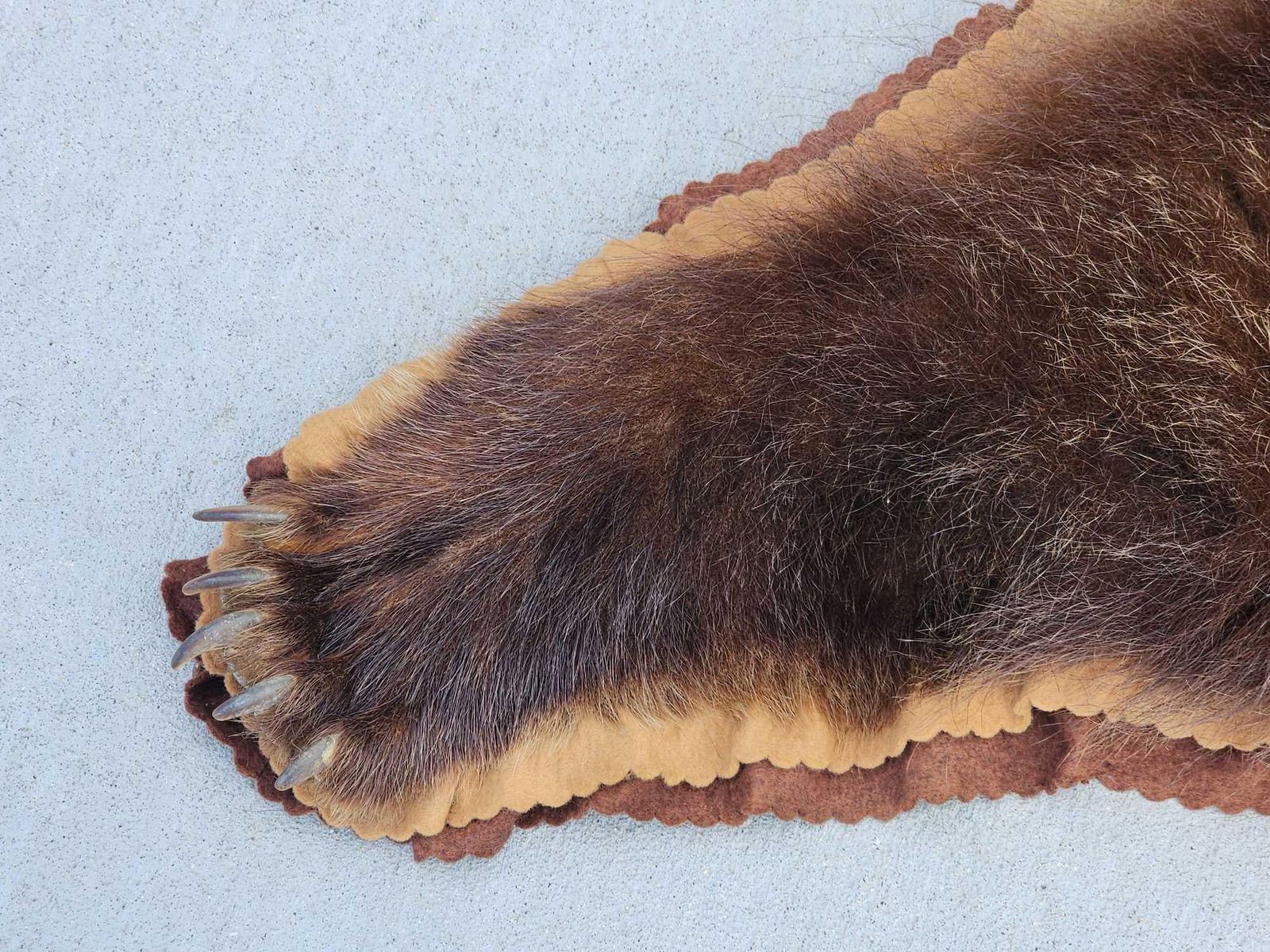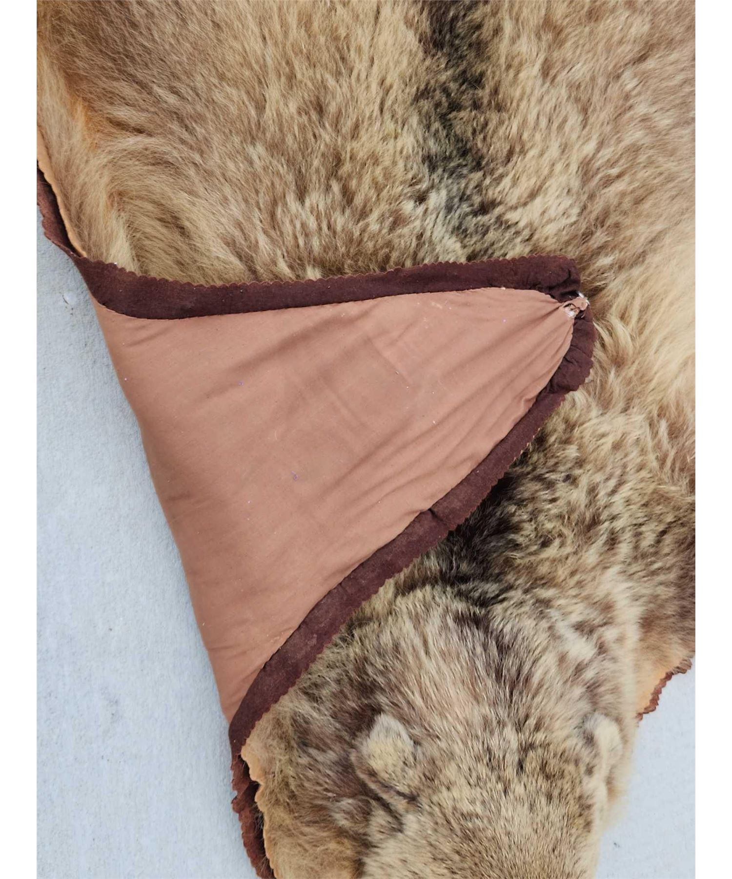 113.34 Thick fur great colors big real claws intact double felt edges durable padded backing pliable tan excellent example of a quality vintage rug harvested in Alaska 1971 this rug has been well cared for about 77" long x 76" wide