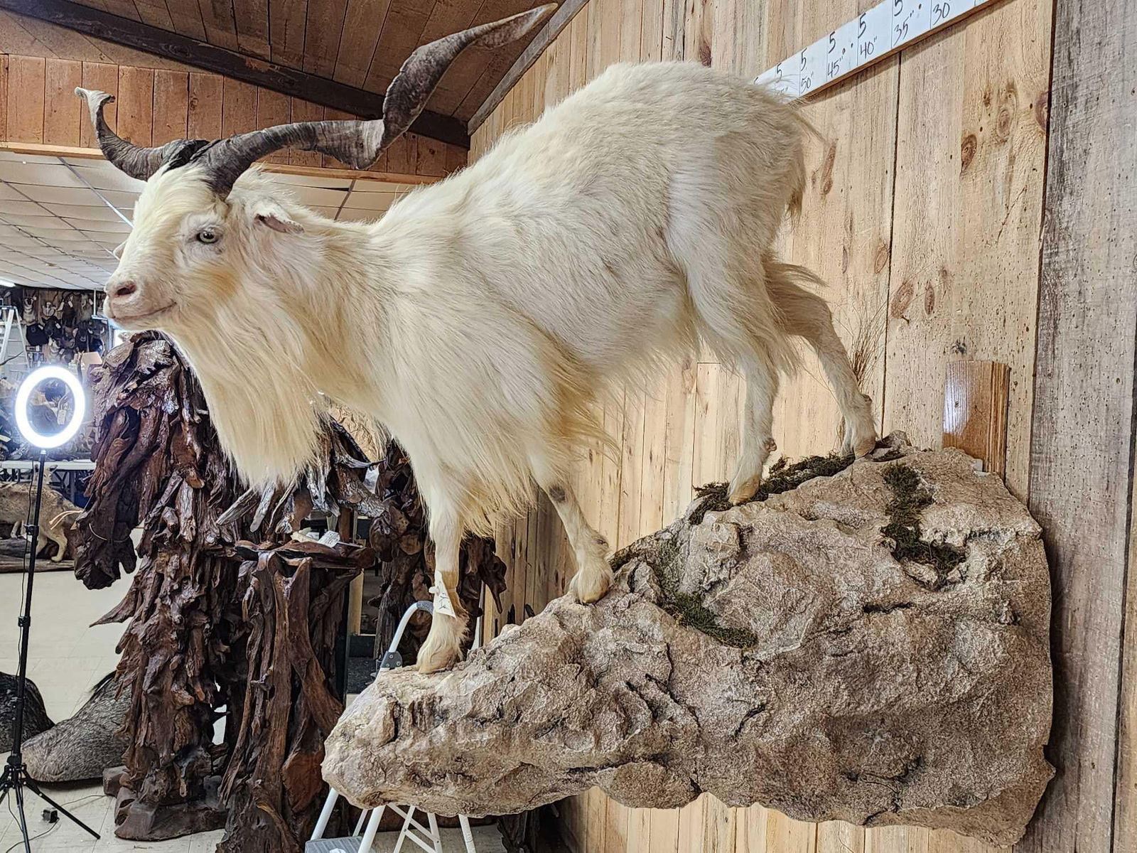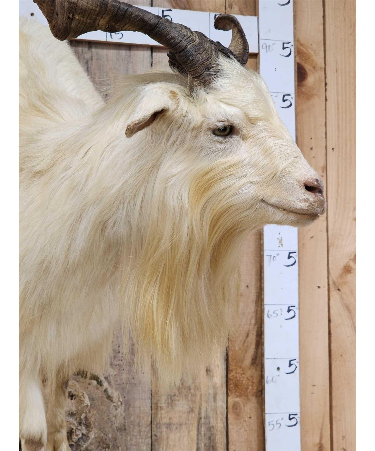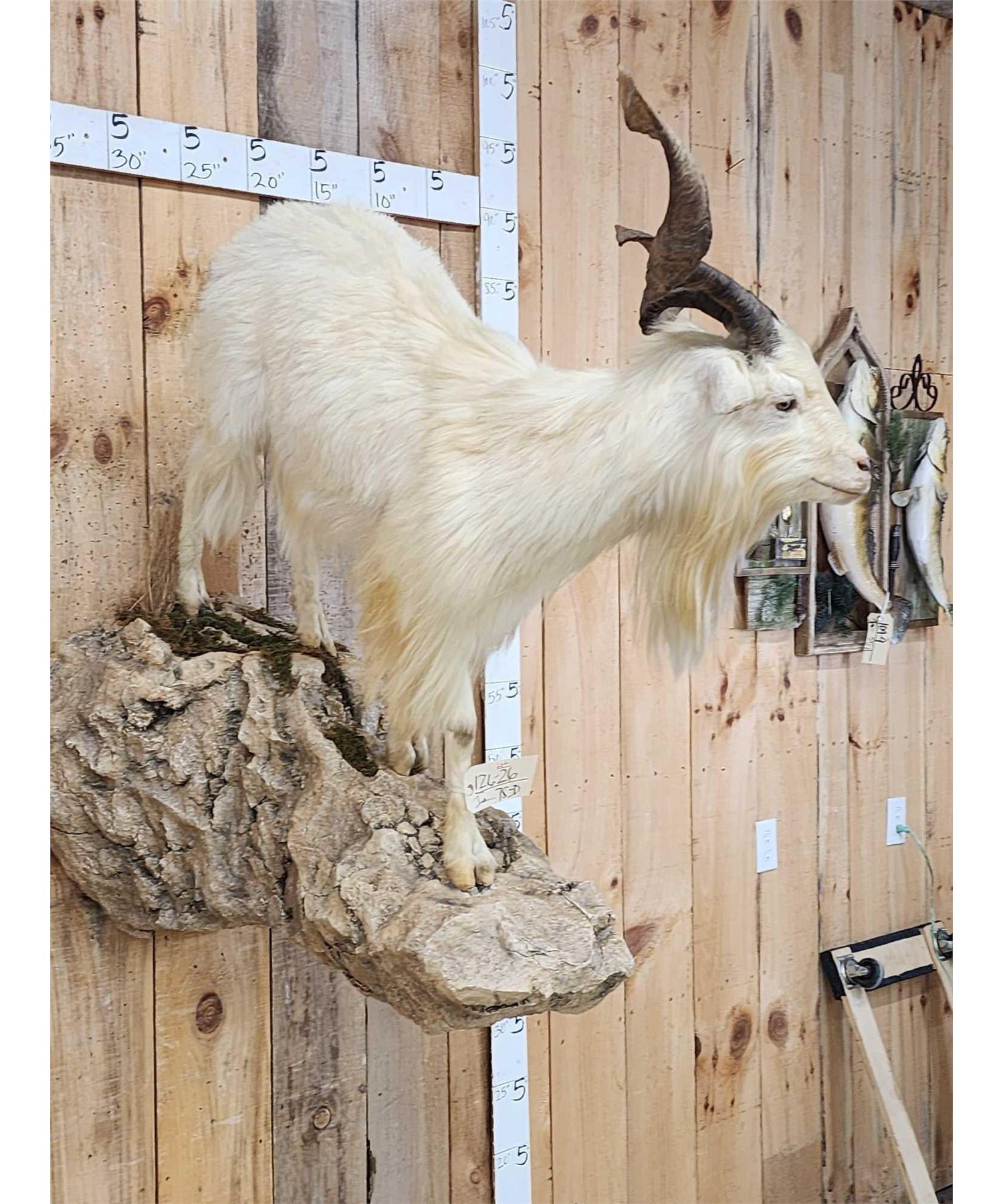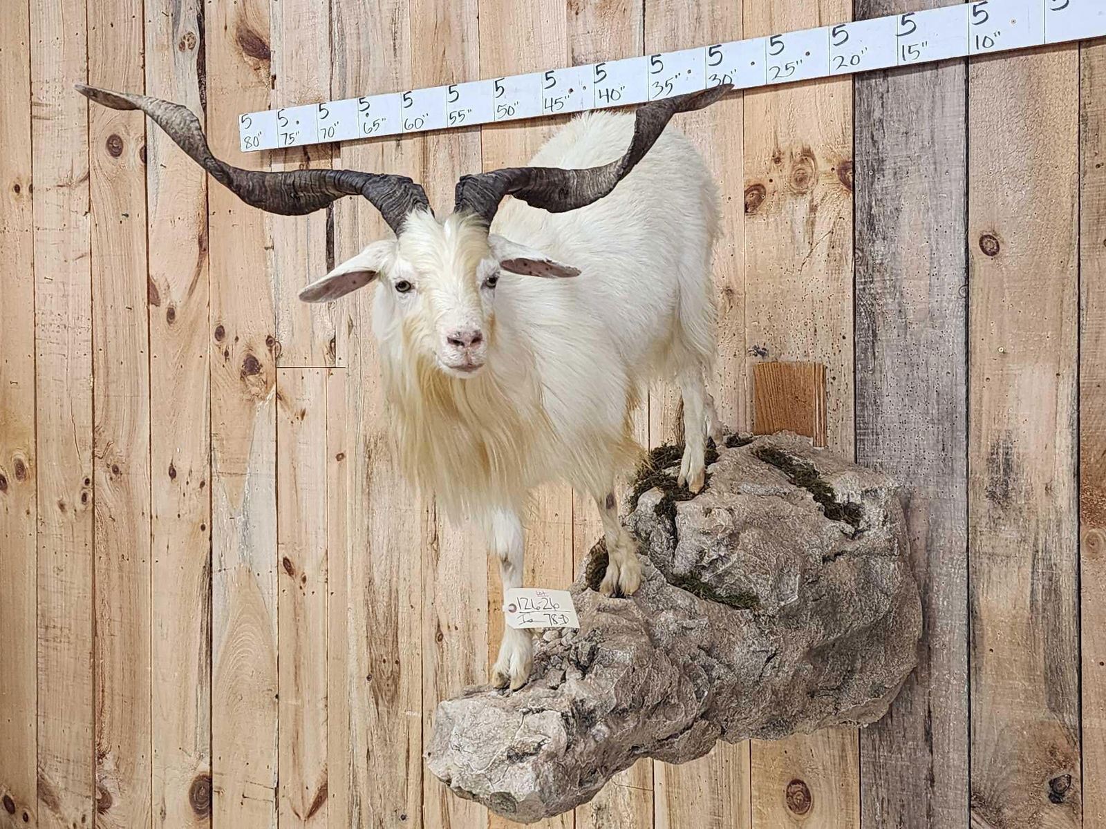 126.26 Pretty mount long flowing hair big horns with a 34" tip to tip horn spread on a nicely done light weight artificial rock hanging base well done mount all around