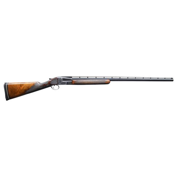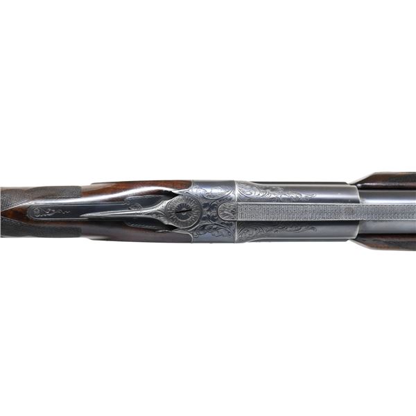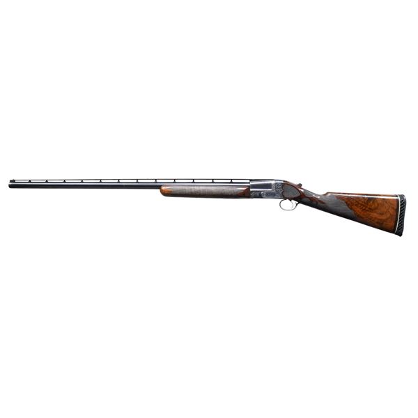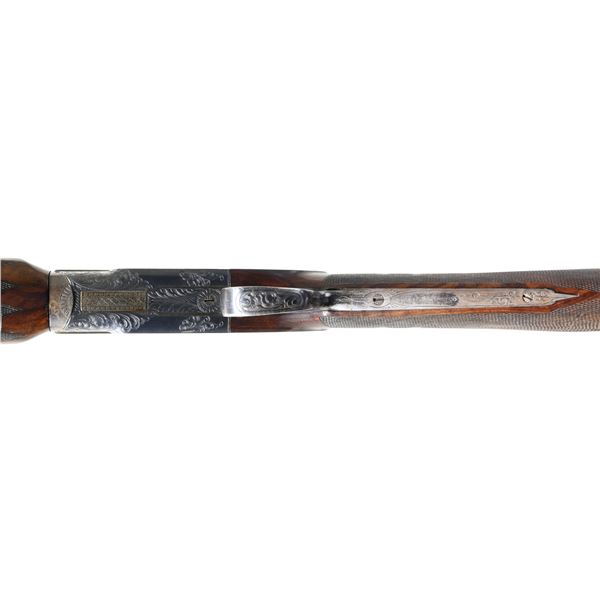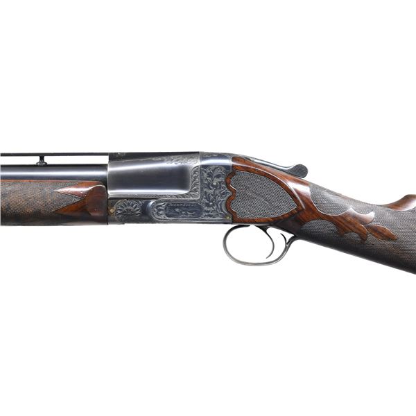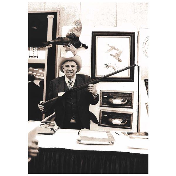 SHOTGUN, ATTRIBUTED TO CLARK GABLE. Cal. 12 GA, 2 5/8". S# 48810. In 1980 Mr. Andy Lightbody, an antique arms collector and writer, was asked to help Clark Gables' last wife Kathleen Spreckles-Gable with the private sale of some firearms that were the personal property of the renowned actor Clark Gable. The story of this scarce Elite Grade Baker trap gun as related by Mrs. Spreckles-Gable is that it was given to Clark as a gift by his then wife Carol Lombard in 1939. Eventually Mr. Lightbody purchased the gun in 1982. At the January 1983 Shot Show (Shoot Hunting Outdoor Trade Show) the gun was displayed in the Peterson Publishing Company booth. On the second day of the show noted actor Slim Pickens, who was a frequent shooting partner of Clark Gables visited the booth. He immediately recognized the shotgun. Turning the gun over he pointed out a hard to read engraving done in reverse on the trigger guard tang "Mine, not ours". Slim said it was not only a joke to Carol as a tongue and cheek warning to keep her hands off of the gun, but also something that Clark wanted to show to everyone. In mid-1983 Slim Pickens contacted Mr. Lightbody and asked to buy the gun. An offer that was turned down. Bbl. 32" with rnd. post donut base late style vent rib with fixed Full choke. Ivory front and mid beads. Scalloped boxlock action with selective ejector. Sides of action have vignettes marked "Baker Guns Company" over a pointing setter on left side and 2 flying mallards on the right side. Balance of action, forearm iron, trigger guard, and breech end of bbls. have foliate engraving with stippled backgrounds and fancy borders. Both sides of hinge pin have starburst engraving. The long tang has the aforementioned reverse engraving. Trim beavertail forearm and straight hand fancy walnut stock with elaborate segmented borderless hand checkering having additional panels on stock ears. LOP: 14 1/16" over a Pachmayr Gripper style trap pad with foam inserts at heel and toe and a 3/16" spacer. Comb has been lowered to shooter's preferences. DAC: 1 1/2". DAH: 1 7/8". Neutral cast. Weight: 8lbs. 0.2oz. Mfg. 1909-1923. UNATTACHED ACCESSORIES: letter from Mr. Lightbody to John Gangle of Little John's Auction Service dated November 6th, 1998. The letter relates the story of his aquisition of the gun and his meeting and viewing by Slim Pickens, and inquires about enlisting Little John's assistance in finding a buyer. Also included are 3 photos of Slim Pickens holding this rare Baker shotgun at the 1983 Shot Show. CONDITION: 80% lightly faded blue showing carry and edge wear. Forearm has worn finish with substantial checkering wear showing scratches and dents. Stock has touched up finish showing scratches and marks with moderately worn checkering. Action is tight and on face. Very good bore. PROVENANCE: The Esteemed Norm Greenberg Collection. (25-4222/DS). CURIO. $10,000-20,000.