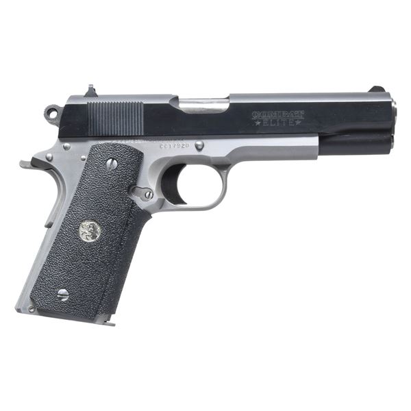 Cal. 45 ACP. S# CG17920. Bbl. 5" Series 80 marked "-COLT 45 AUTO-". Mfg. 1989 with stainless frame and frame components; blued slide having high profile 3 dot fixed sights and standard cocking grooves. Flat grooved mainspring housing, smooth faced black trigger without over travel stop, wrap around pebble gained rubber grips with silver Colt medallions and Commander style hammer. MAGS: 1 factory stainless 7 rd. UNATTACHED ACCESSORIES: good to very good matching numbered maroon box with foam inserts and paperwork; light scuffs mainly on end opposite label. CONDITION: very good to excellent finish with light function rub marks on lower left front of slid. Near excellent bore and grips. (25-4976/NW). MODERN. $750-1,000.